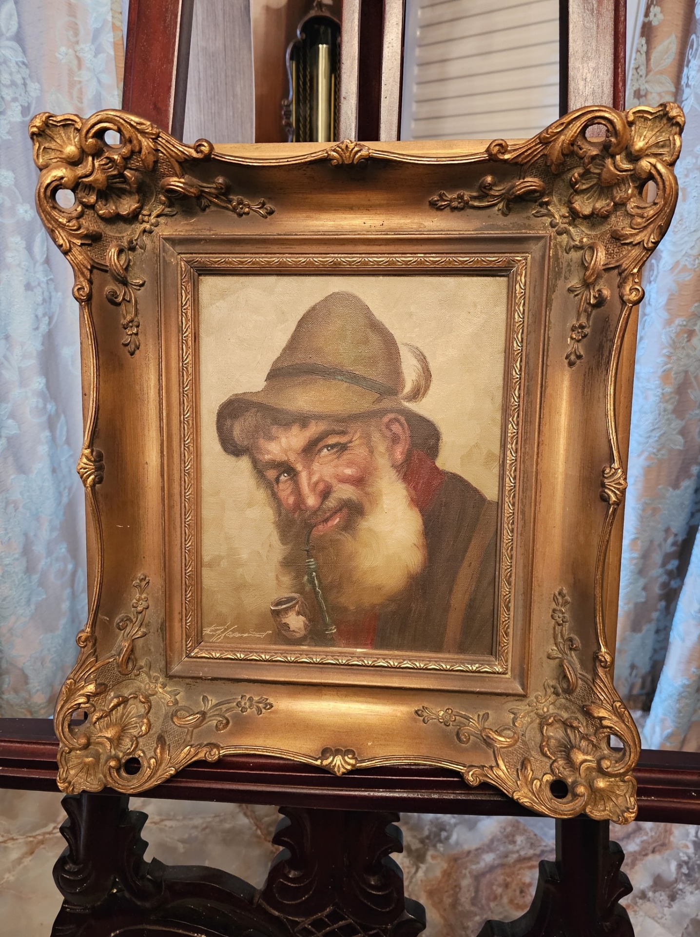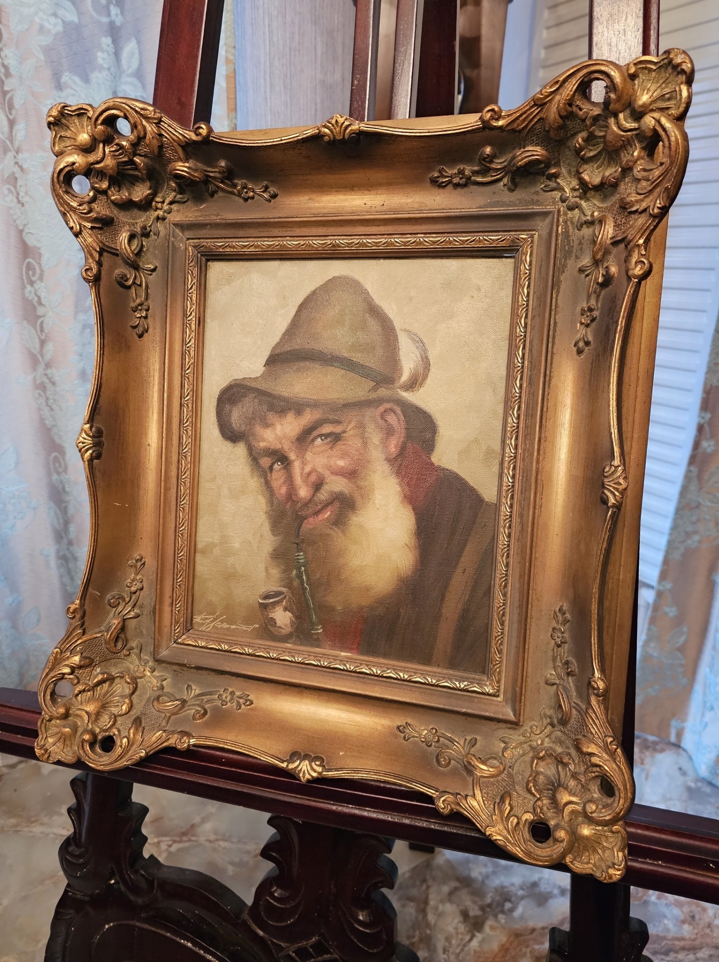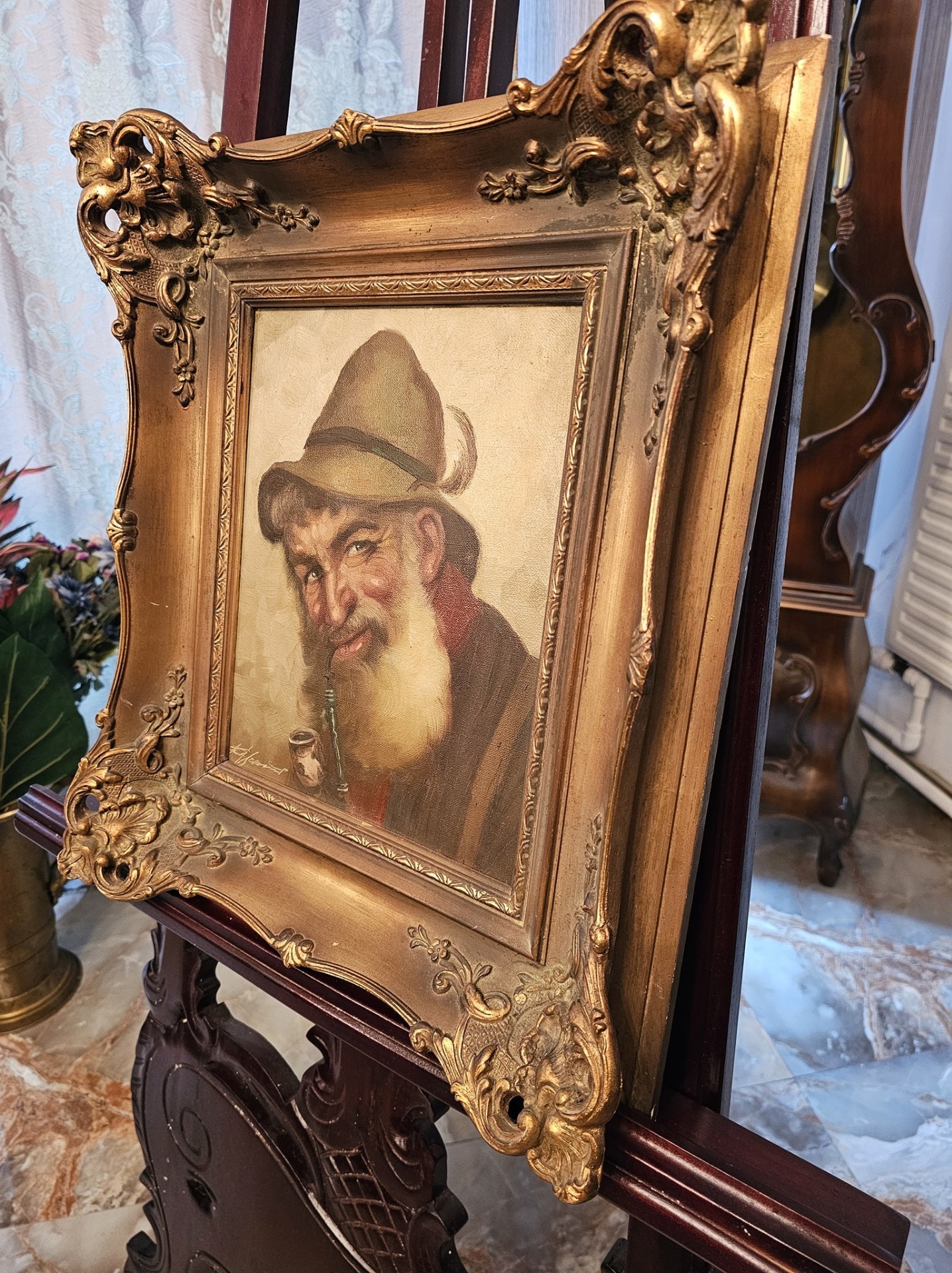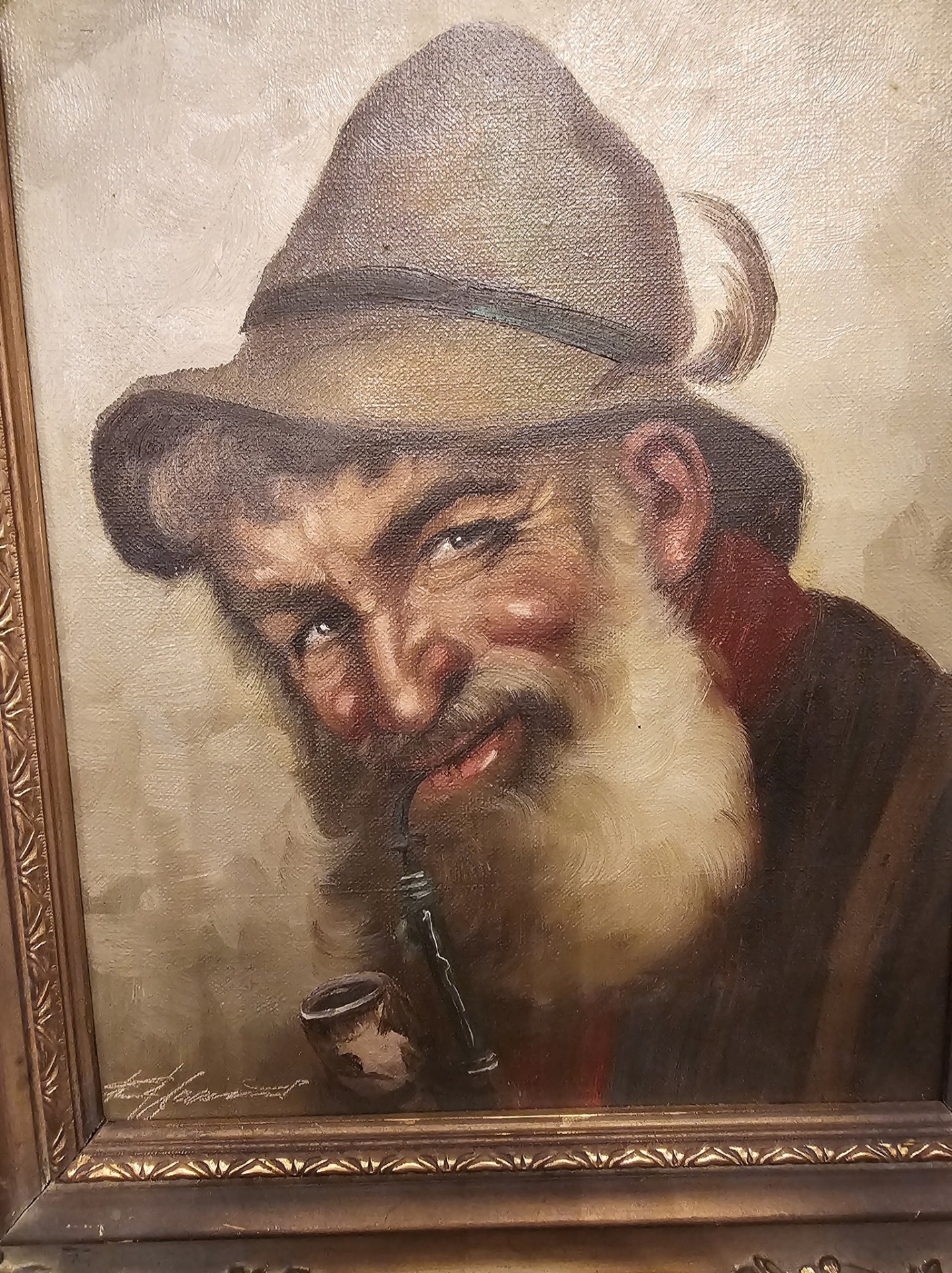 Tablou vintage cu ramă barocă, realizat în ulei pe pânză, reprezentând portretul unui bătrân cu barbă și pipă – o lucrare plină de expresivitate și caracter.