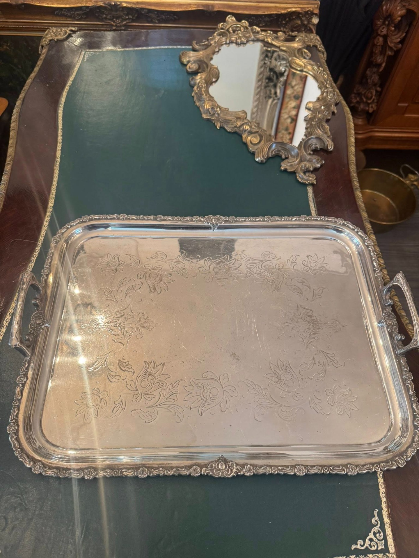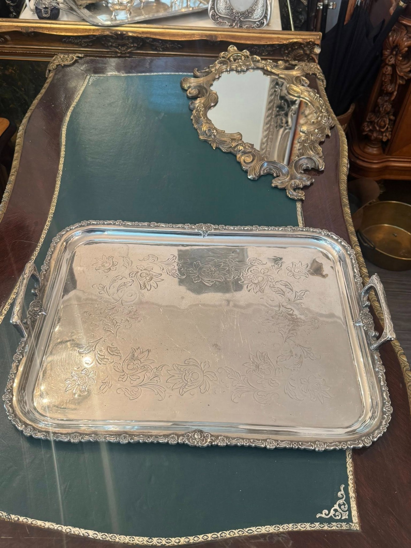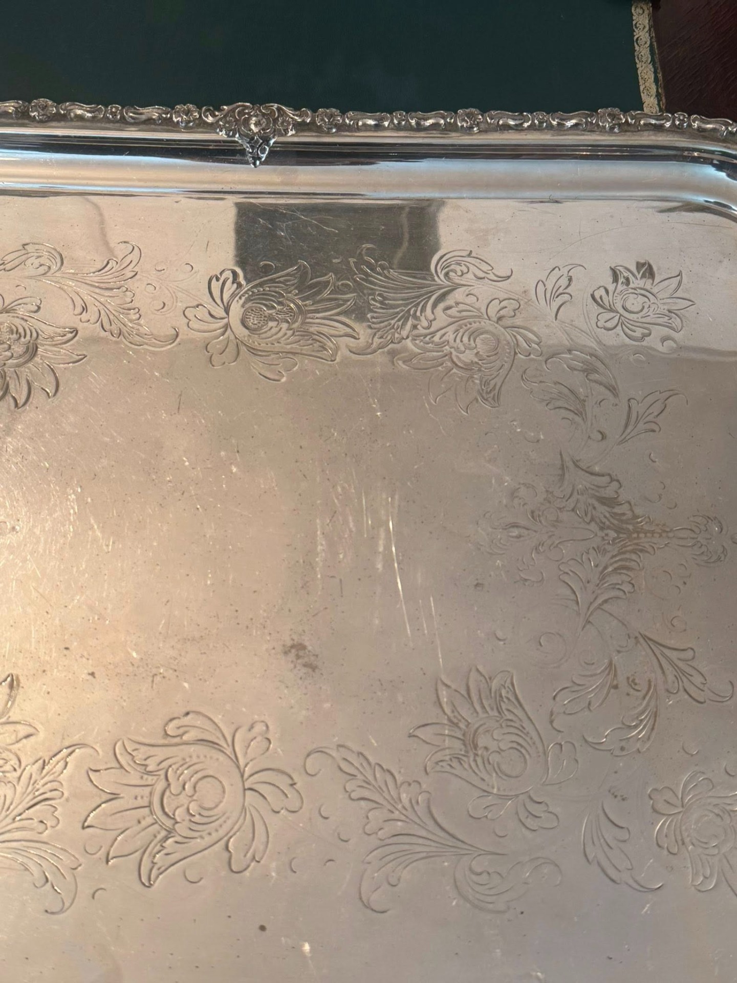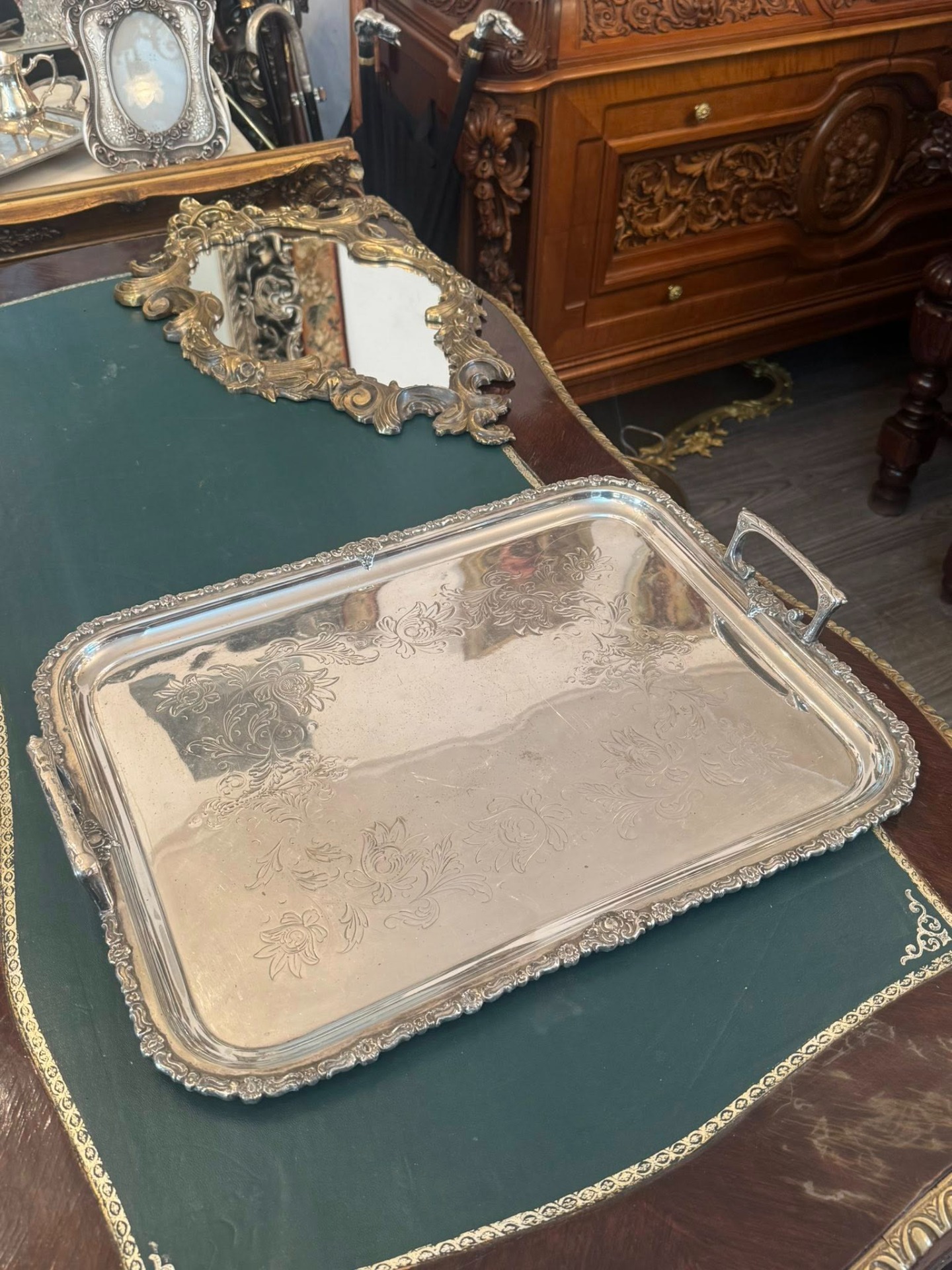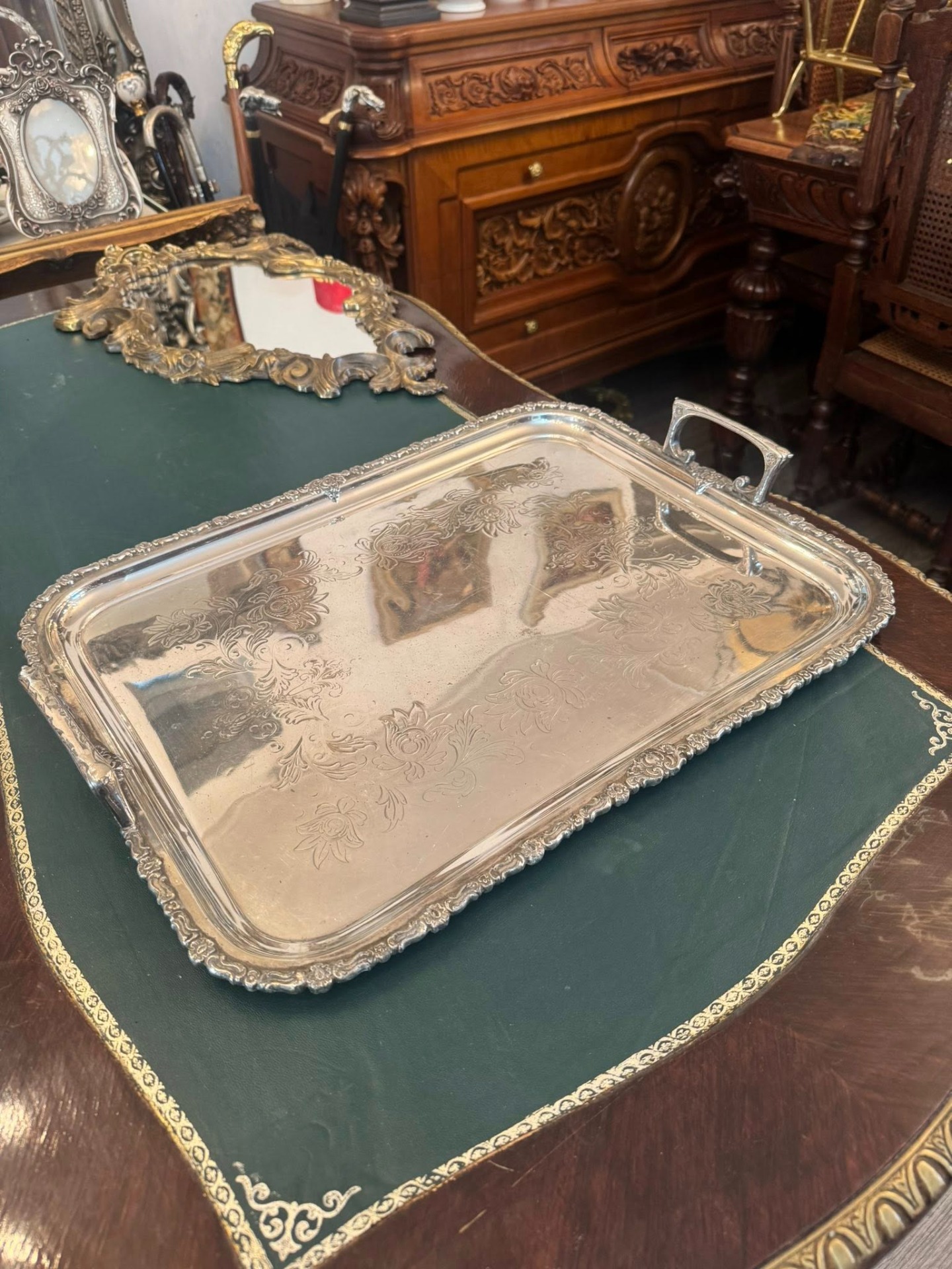 Marginea tăvii este finisată cu o bordură elaborată, ondulată. Suprafața centrală are un decor gravat (sau incizat) cu motive florale sau de frunziș, tipice pentru arta decorativă din secolul al XIX-lea sau începutul secolului al XX-lea.
