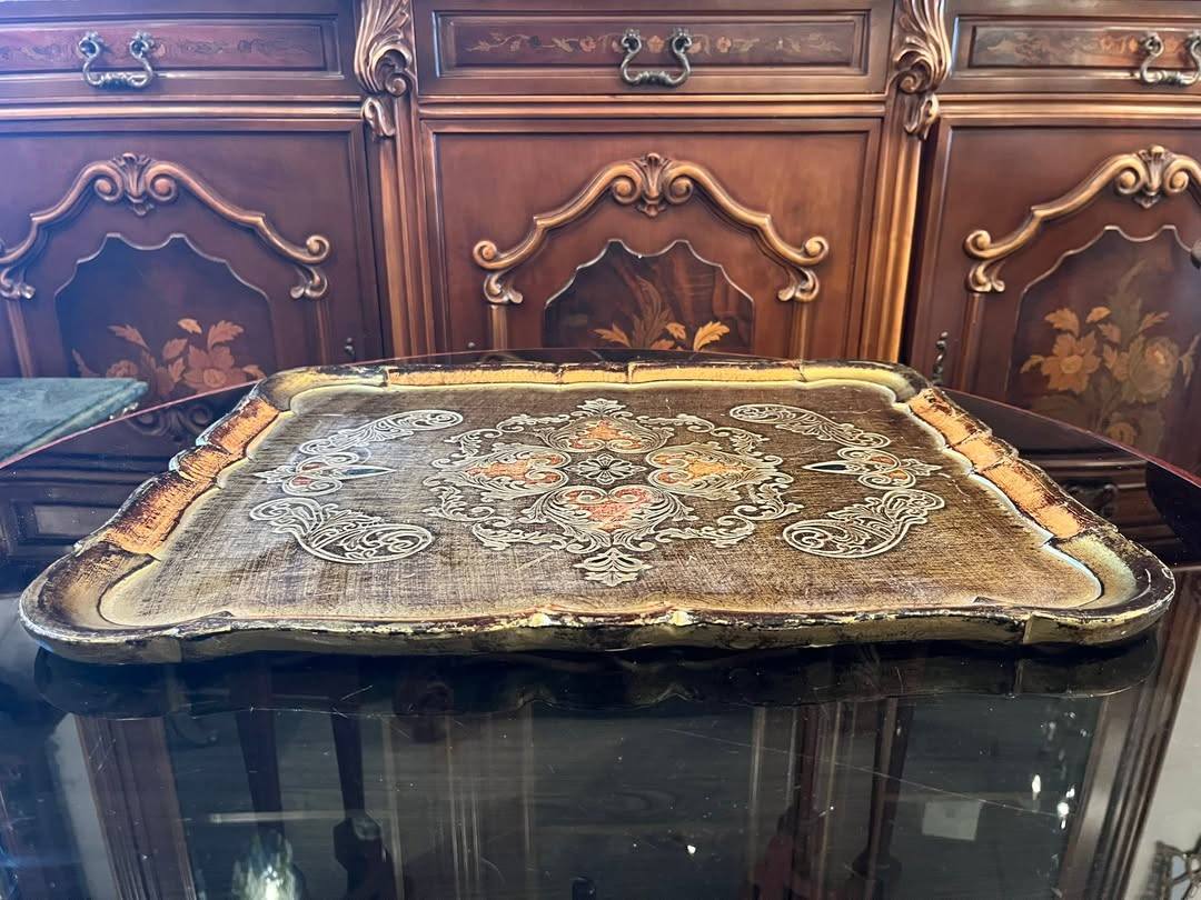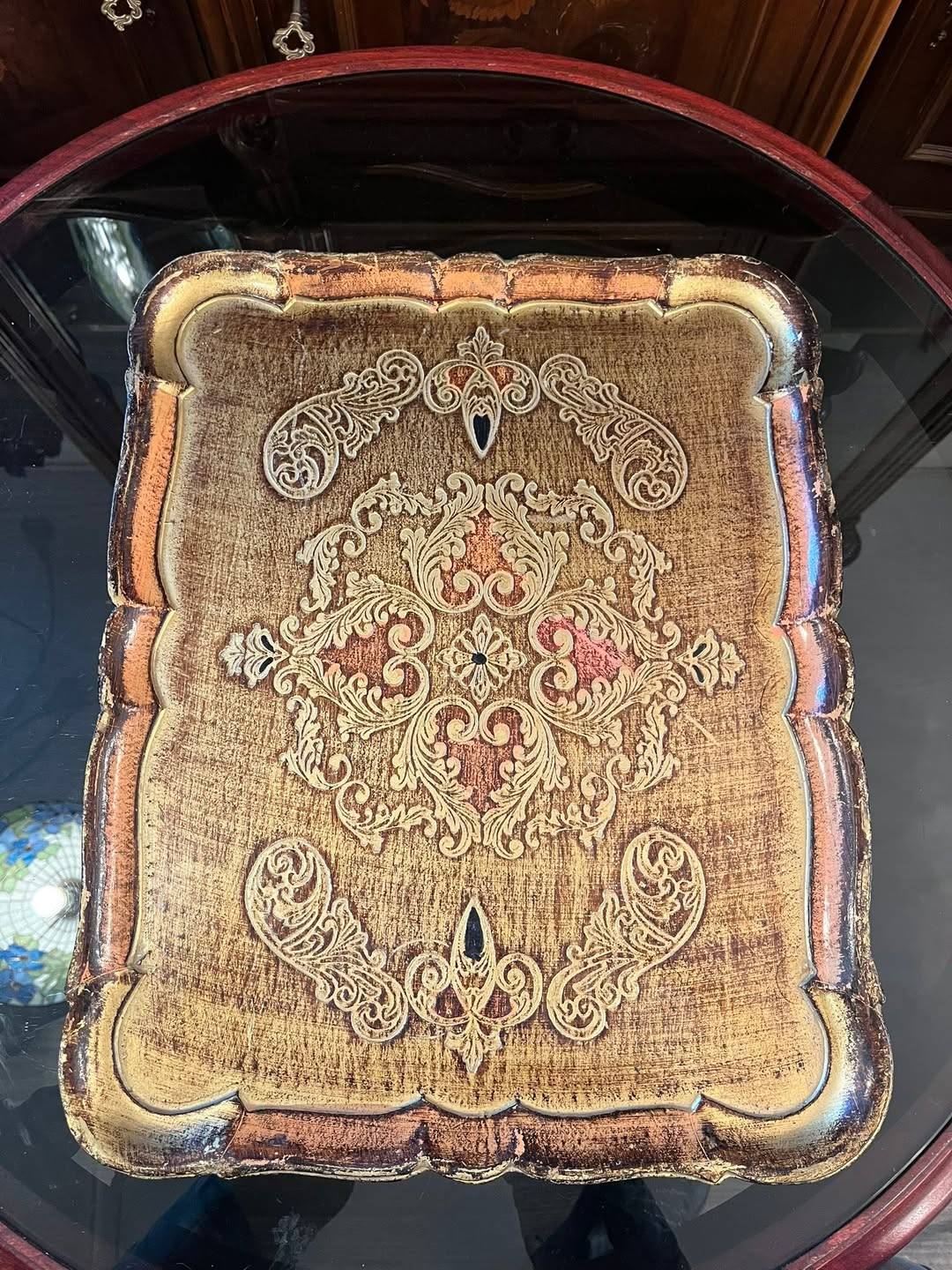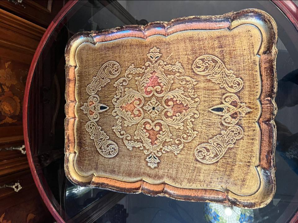 Tavă decorativă deosebită, realizată din lemn, cu model baroc bogat ornamentat și finisaj patinat în nuanțe calde de auriu, bronz și maro. Decorul central este simetric, cu motive florale și arabescuri clasice, oferind un aspect elegant și rafinat.
