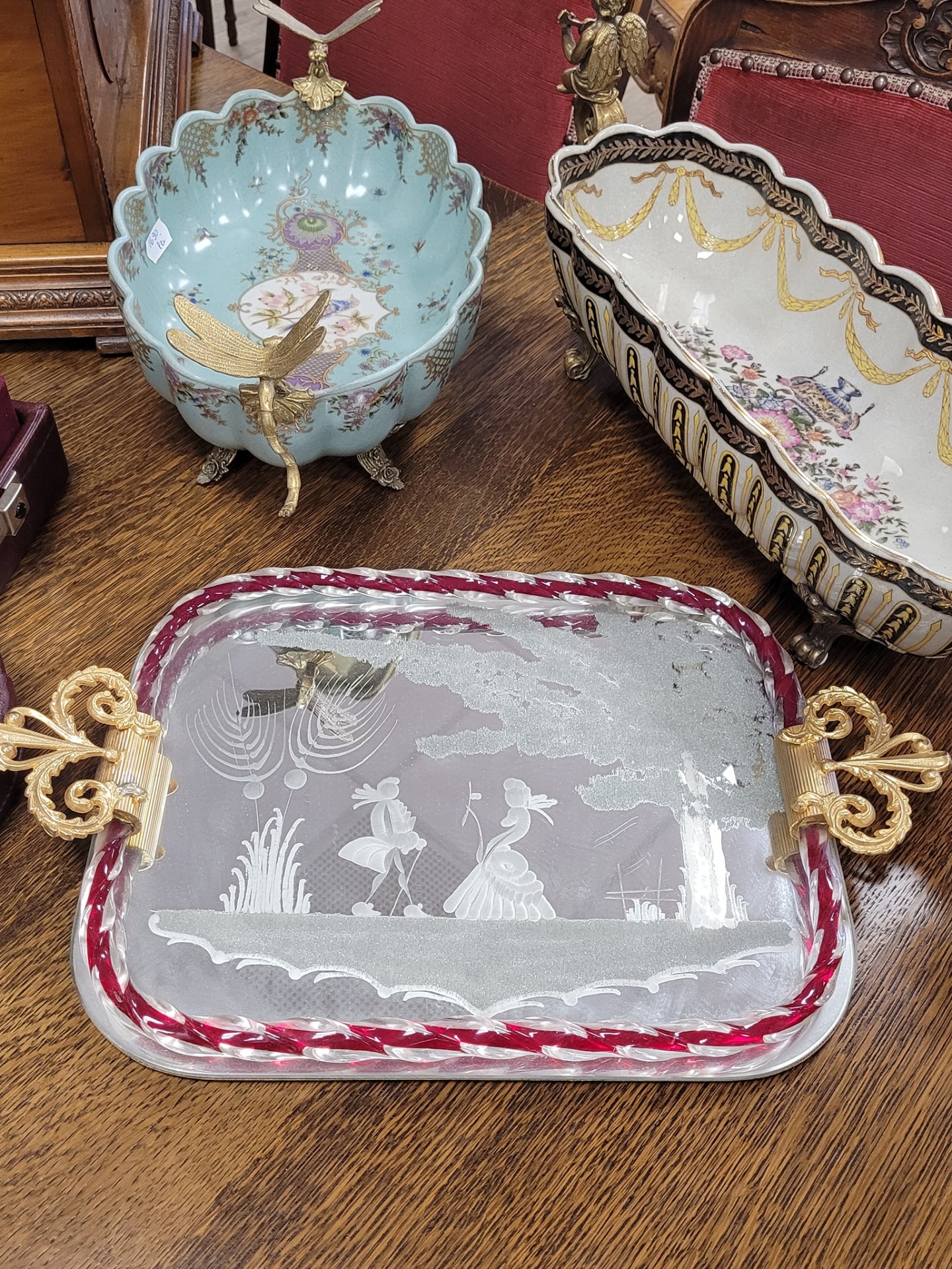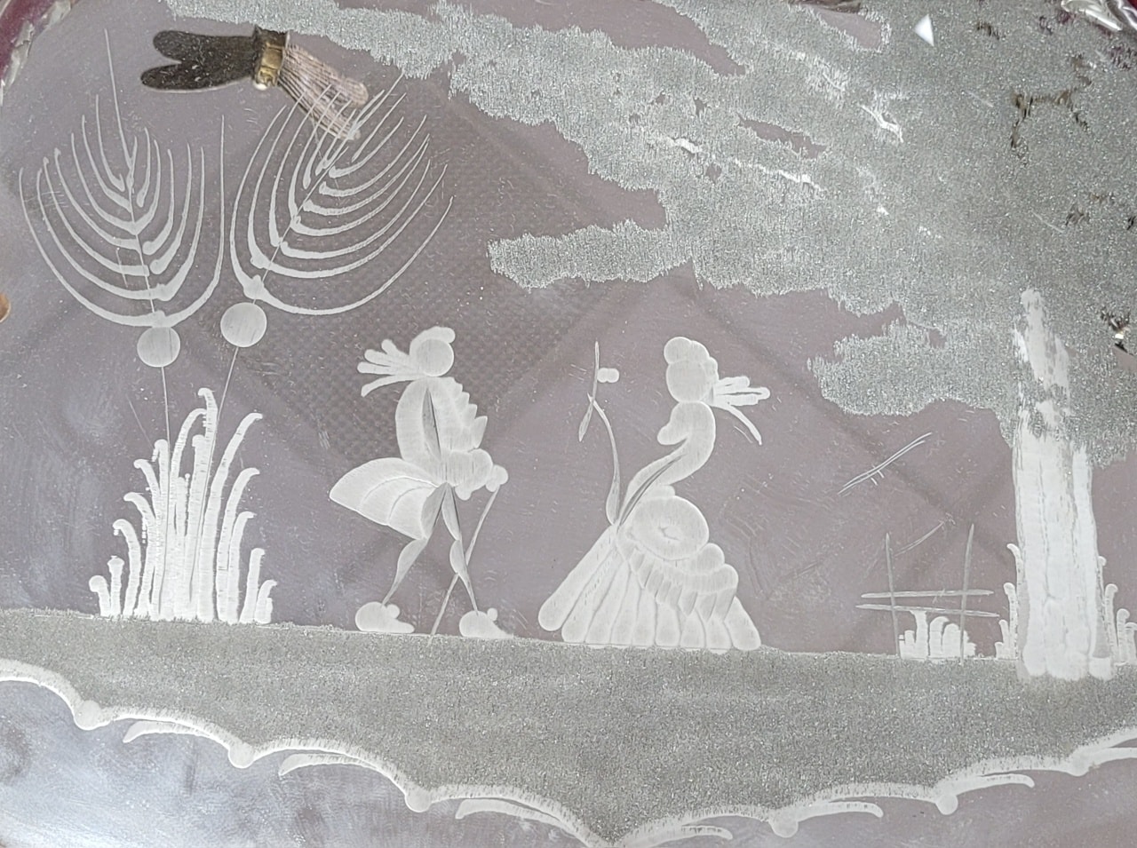 Tavă decorativă vintage autentică Murano, din sticlă gravată,