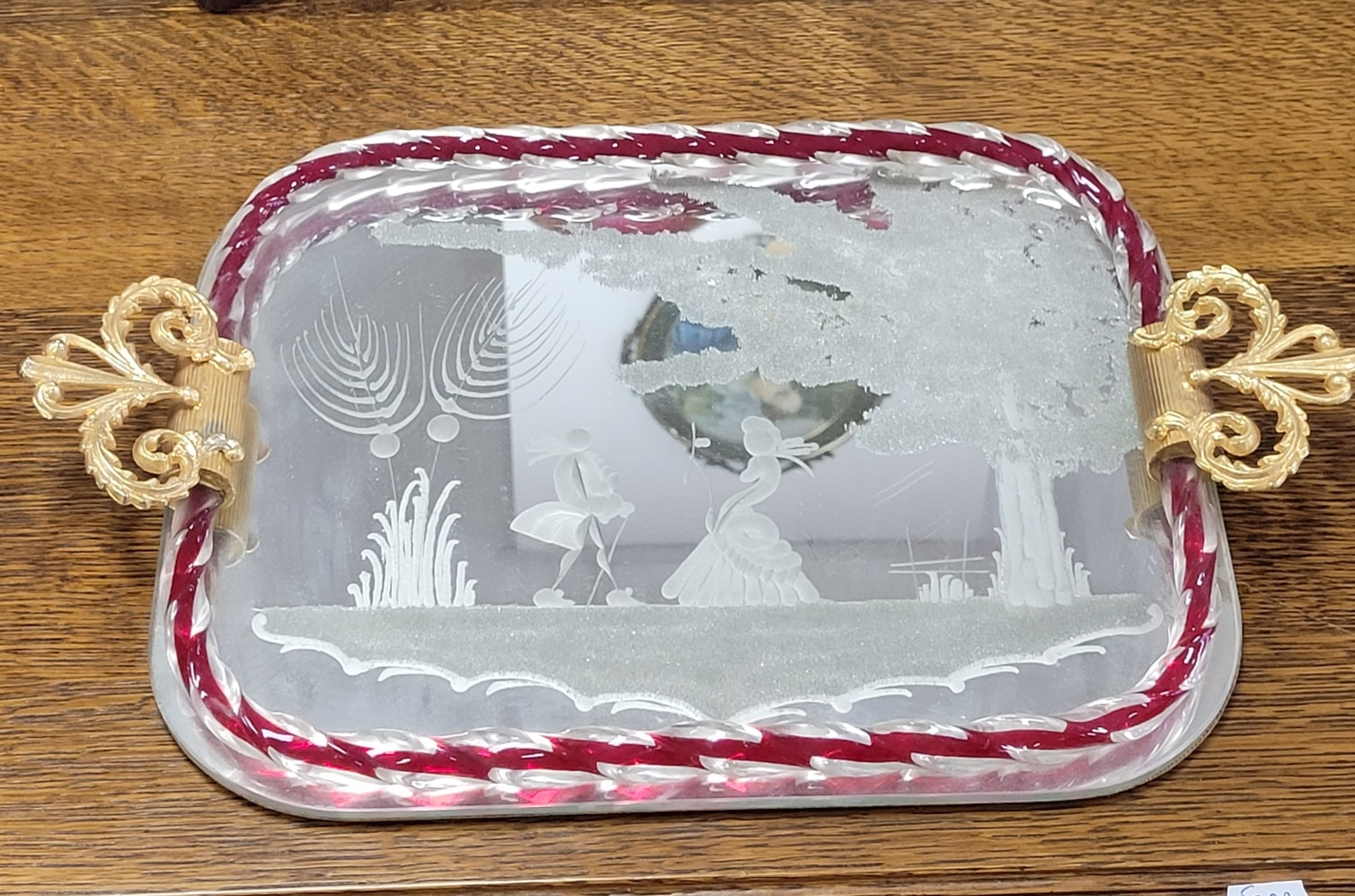 Tavă decorativă vintage autentică Murano, din sticlă gravată și ramă din cristal răsucit.