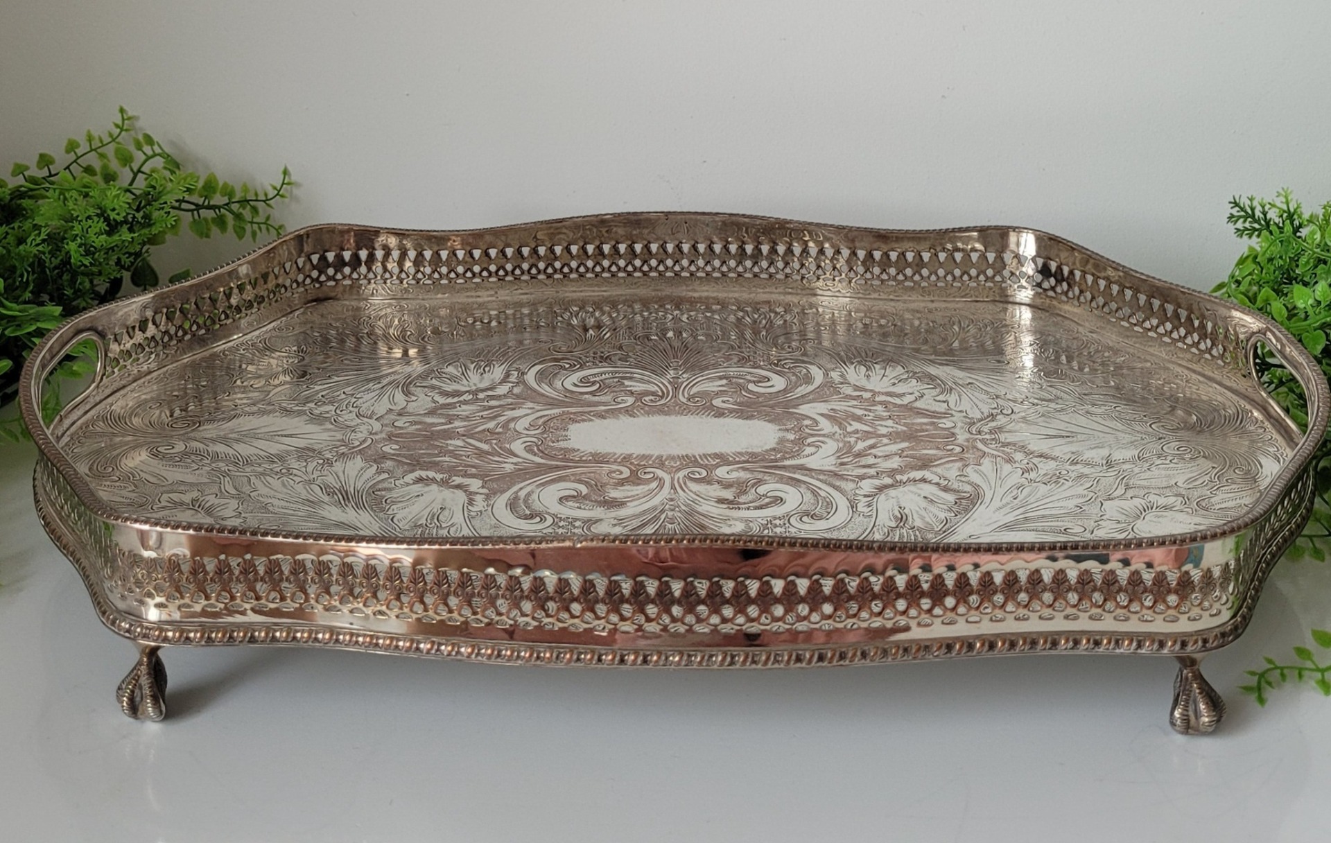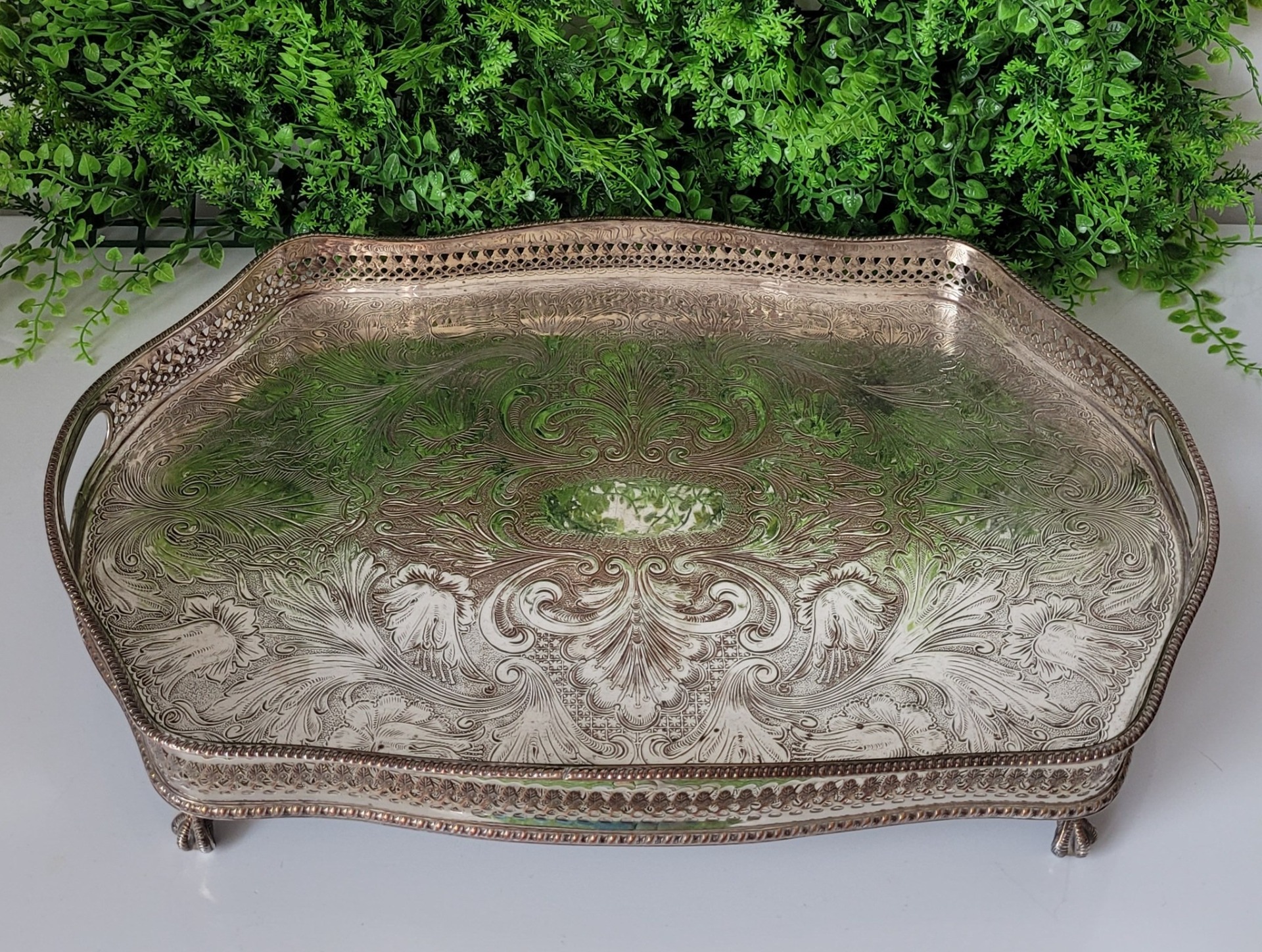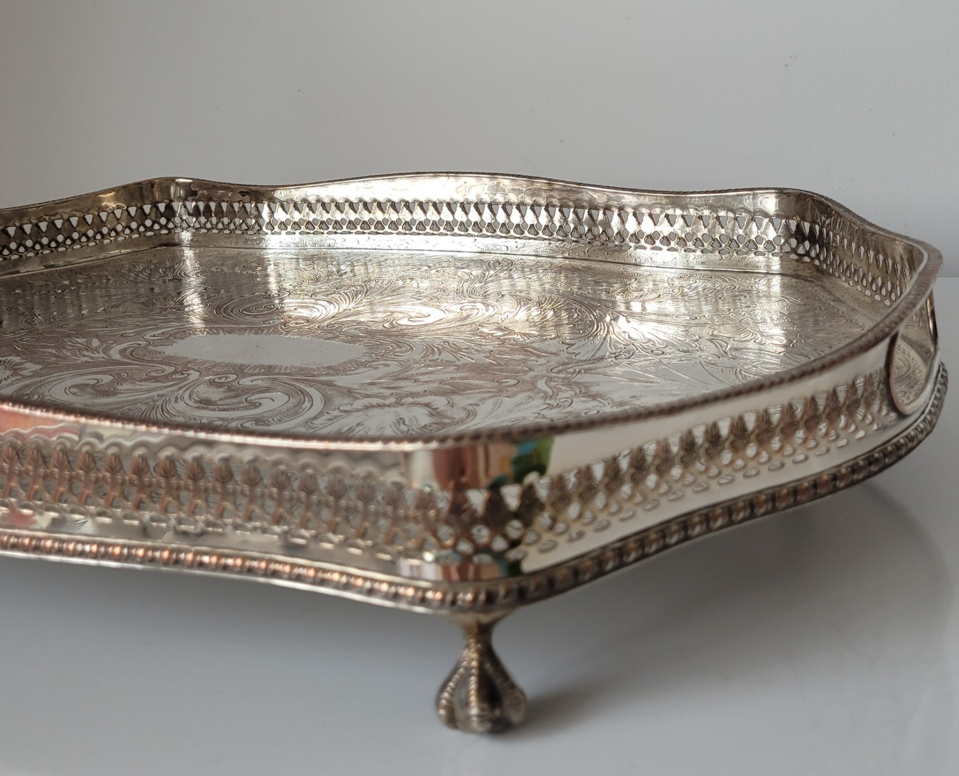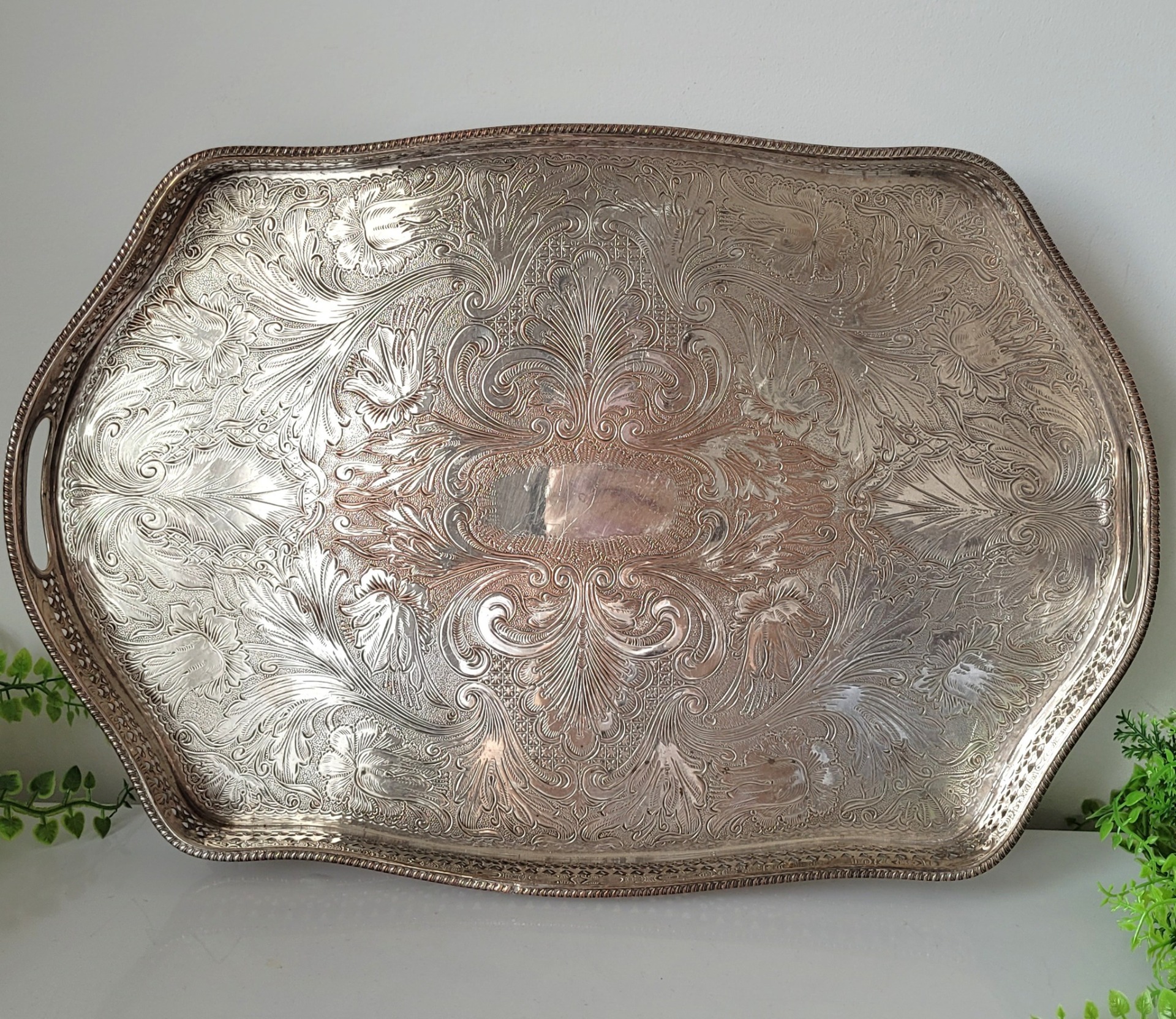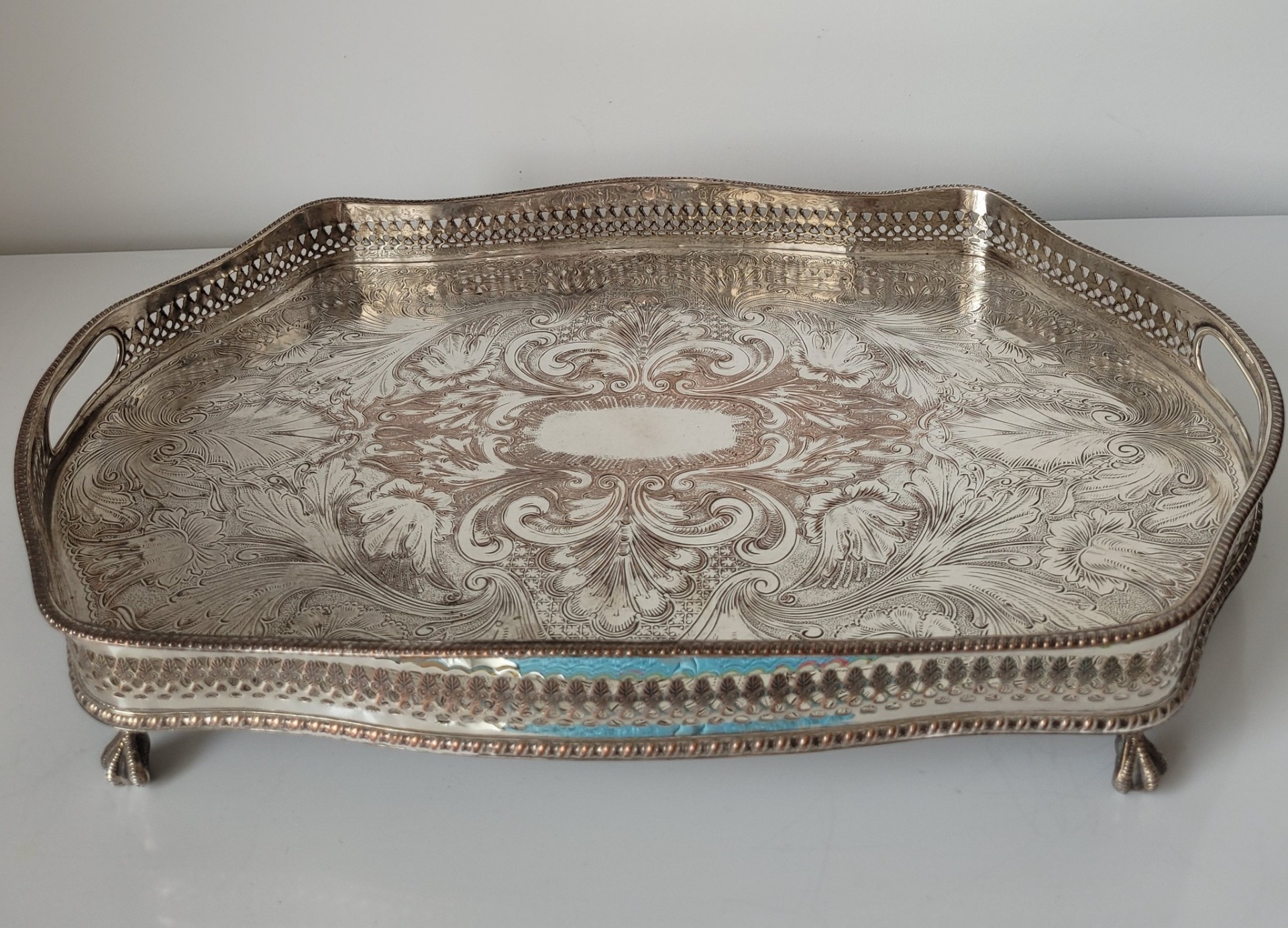 Tavă veche din cupru, placată cu argint, cu design elaborat și ornamente gravate.
