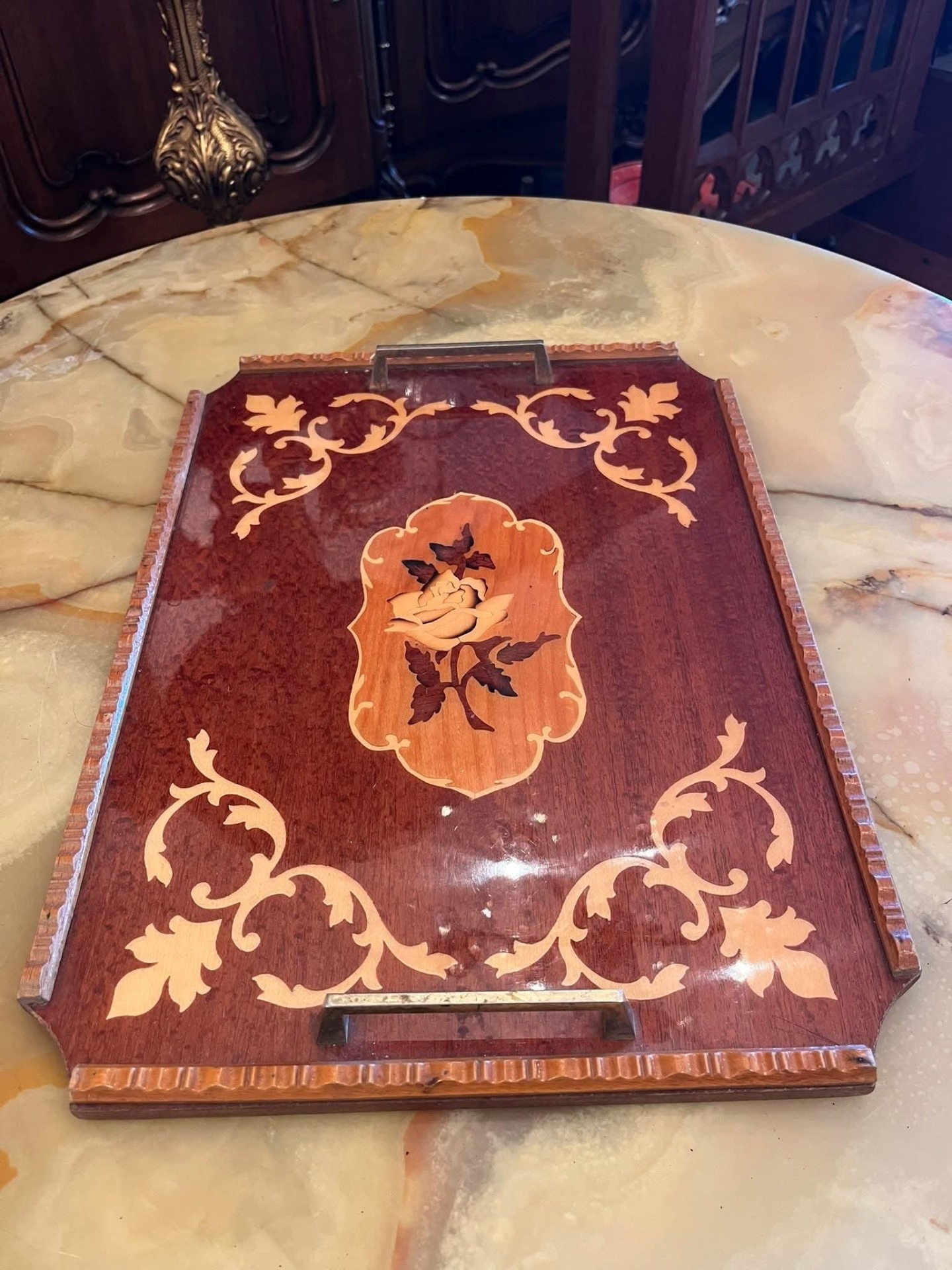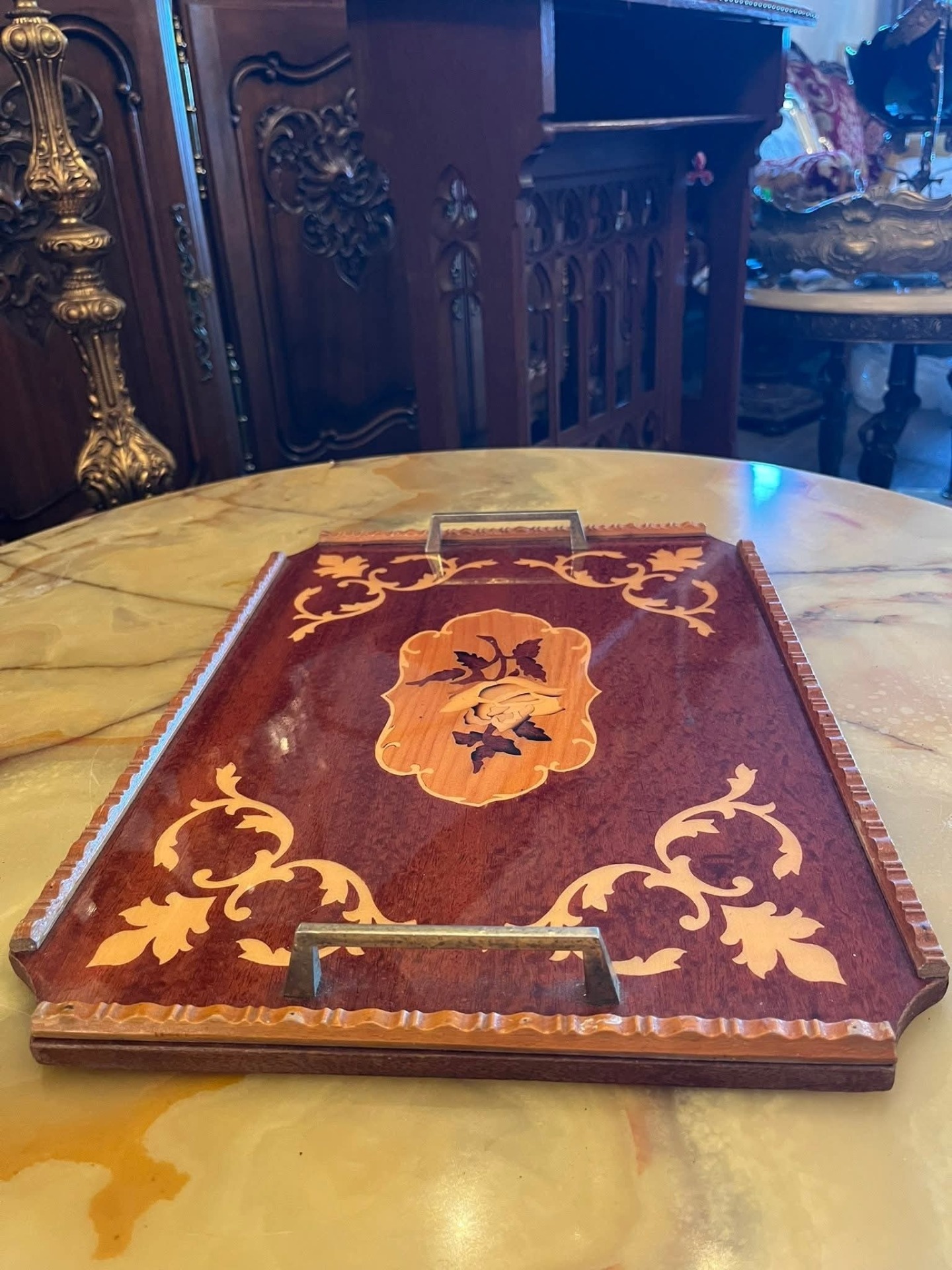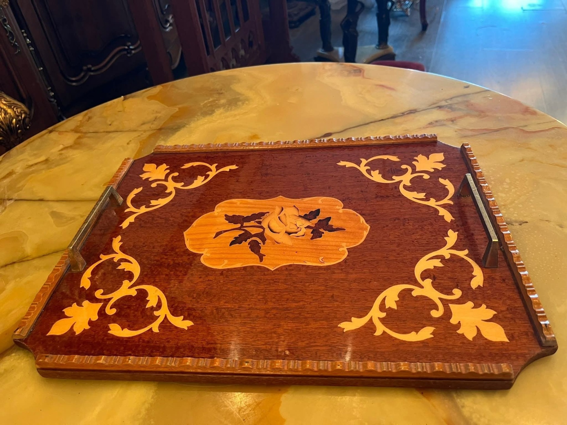 Realizată manual din lemn de esență nobilă, decorată cu intarsie fină reprezentând motiv floral central și ornamente clasice pe margini. Prevăzută cu mânere laterale solide, funcționale, și margini profilate. Lac original cu patină frumoasă, care evidențiază vechimea și autenticitatea piesei.