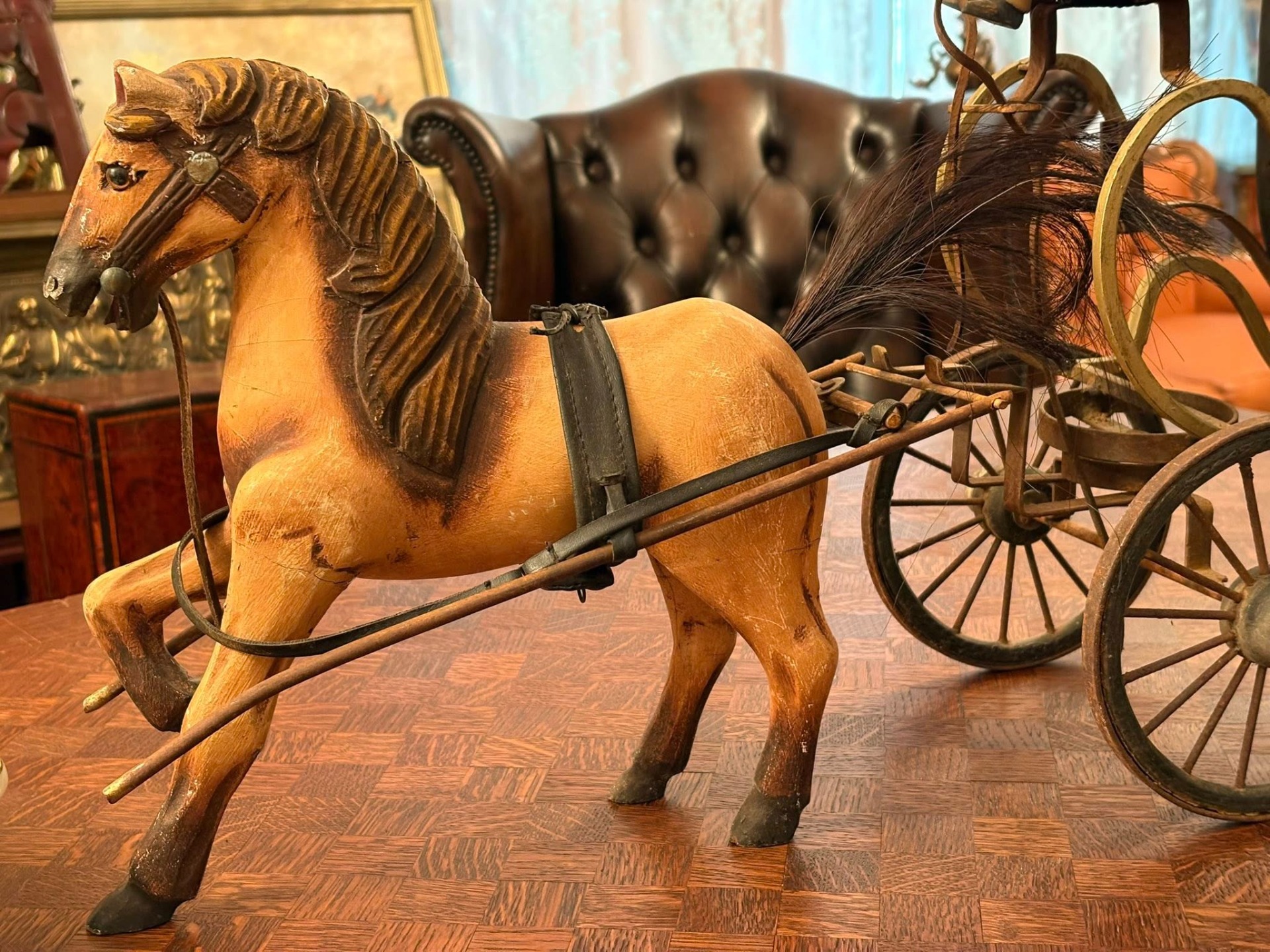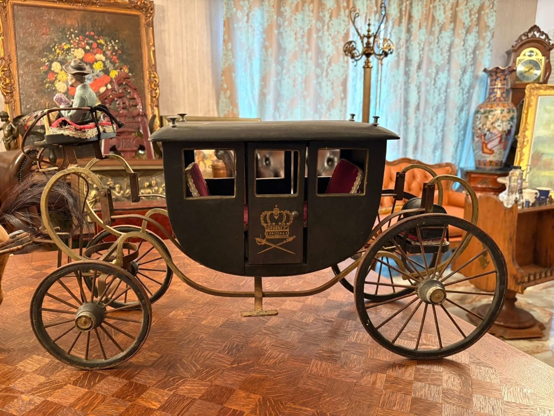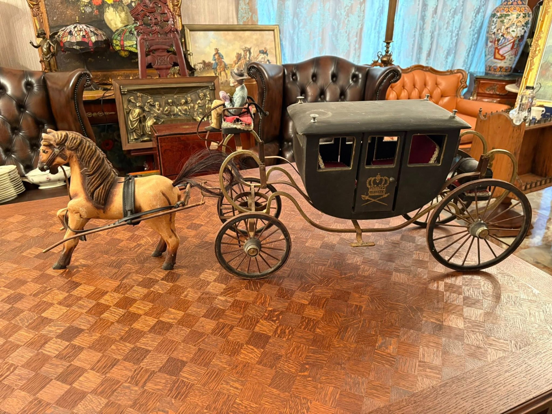 Trăsură decorativă de epocă, realizată manual, formată dintr-un cal sculptat în lemn și o caleașcă elegantă, cu detalii fine și interior tapițat ( cca 1950