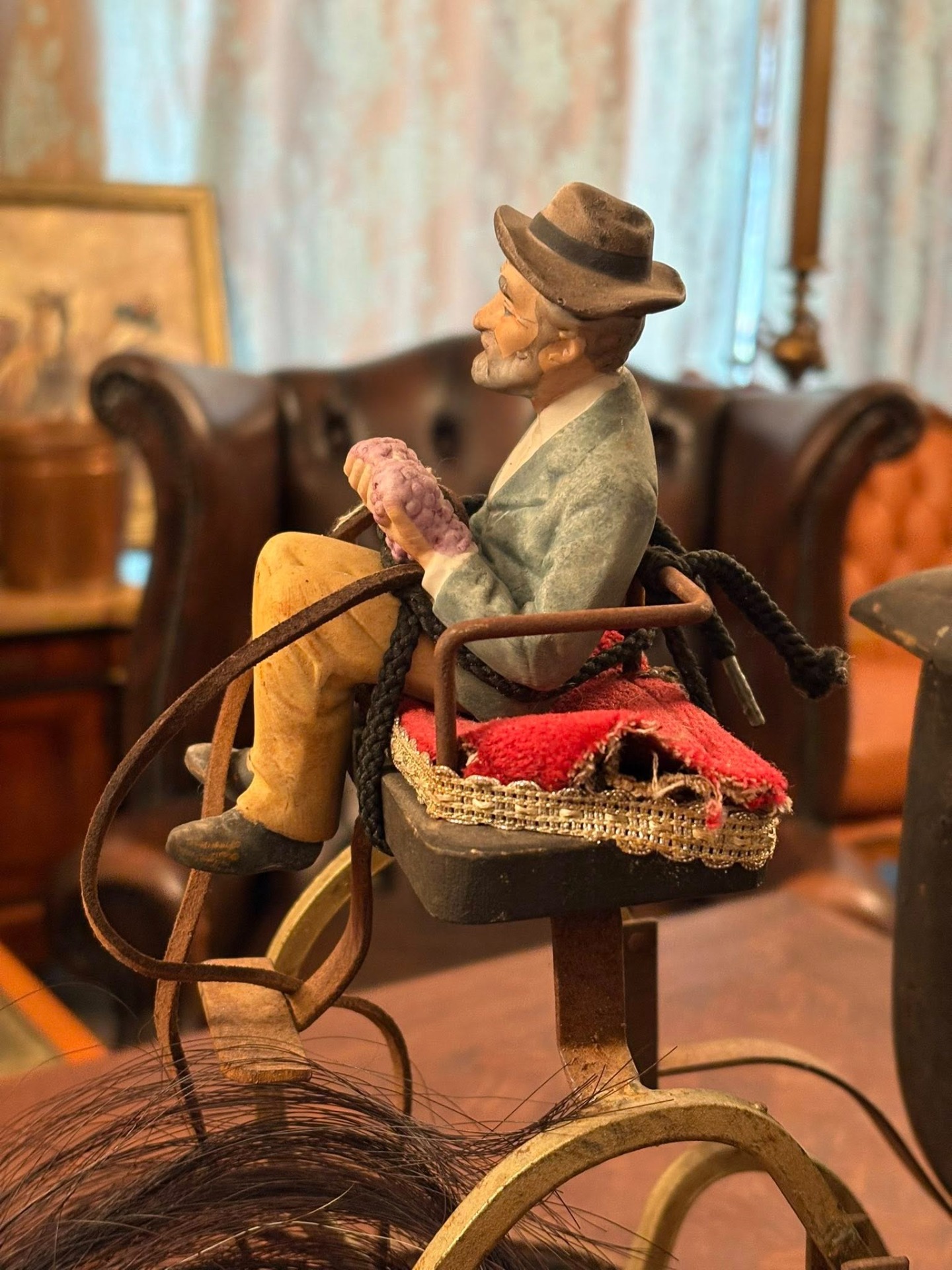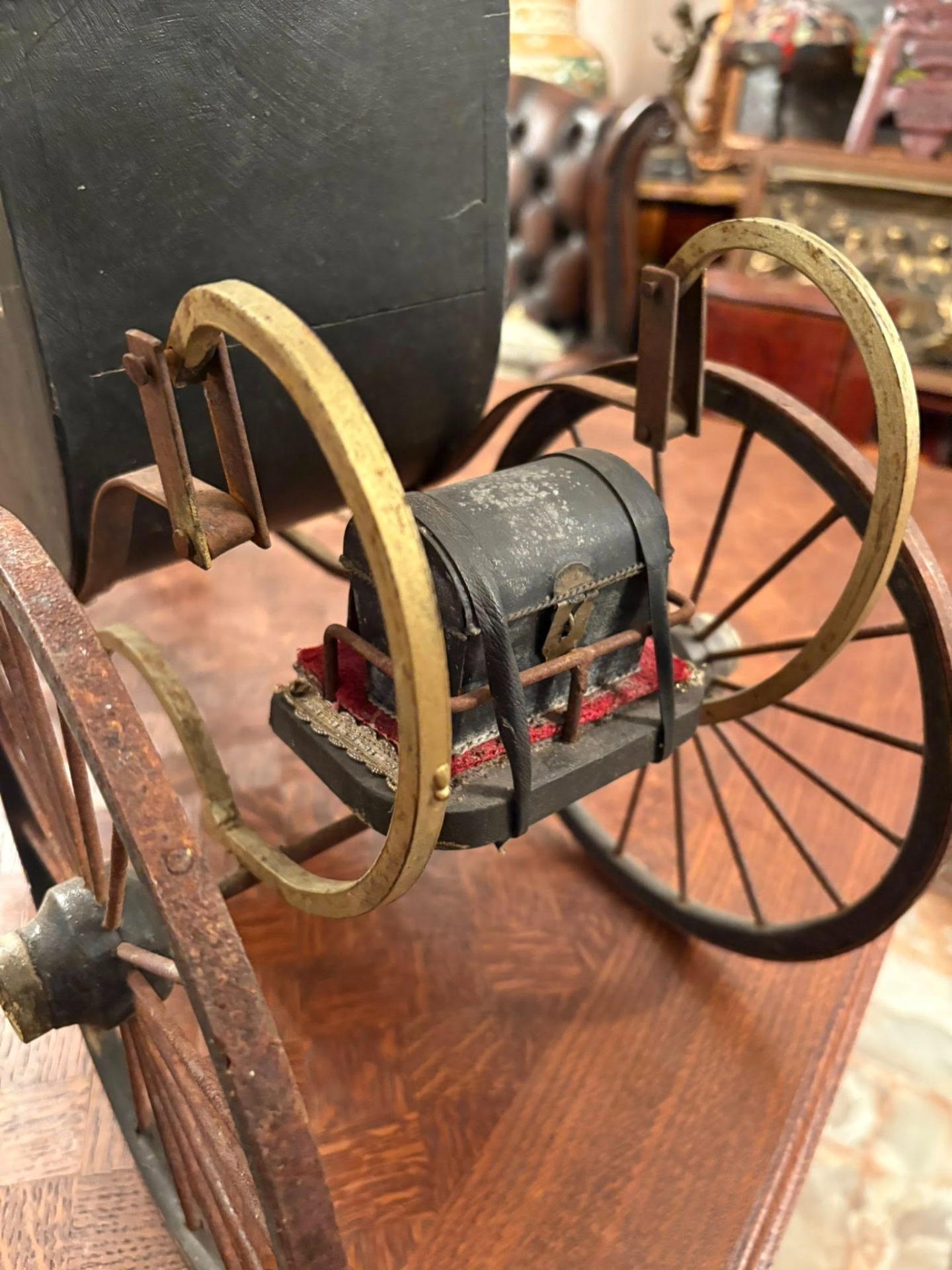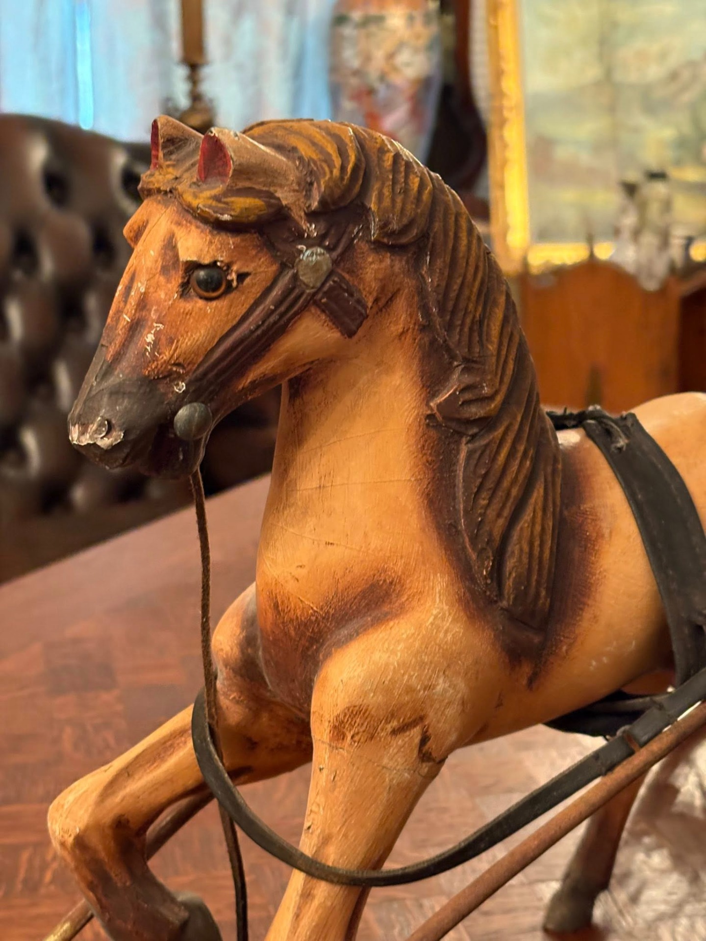 Trăsură decorativă de epocă, realizată manual, formată dintr-un cal sculptat în lemn și o caleașcă elegantă, cu detalii fine și interior tapițat ( cca 1950