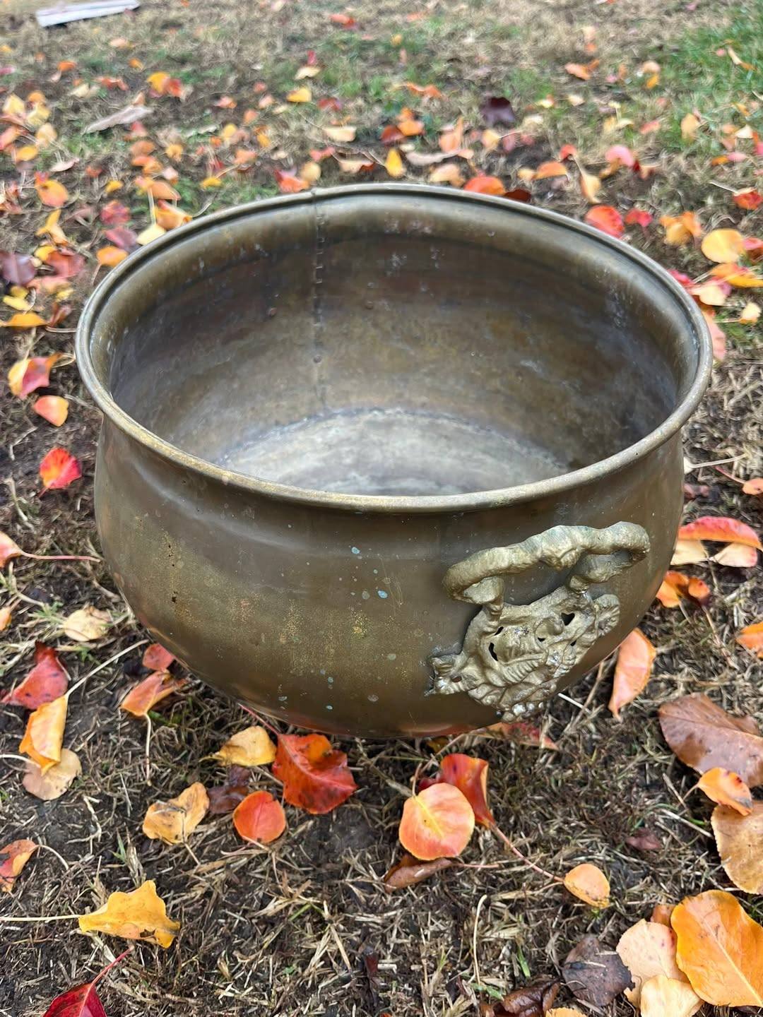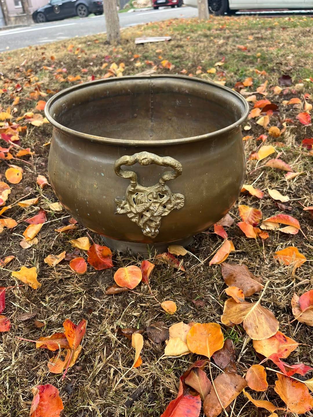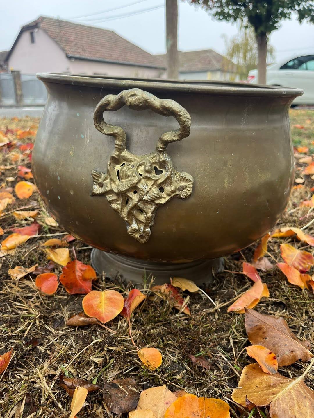 Vas antic din alamă, lucrat manual, cu două mânere ornamentale din bronz în stil clasic. Piesa are un aspect autentic, patină naturală și urme de vechime care îi