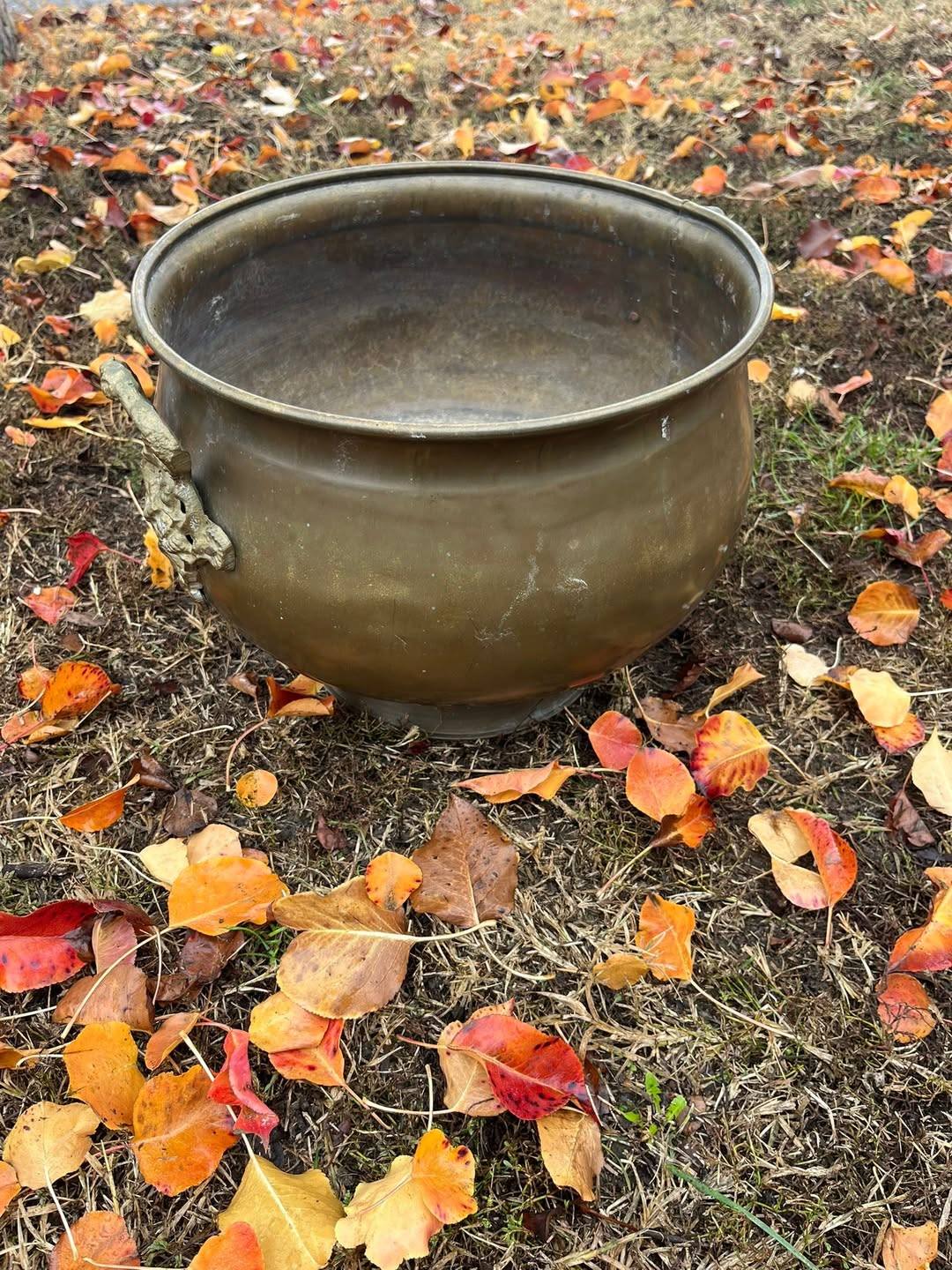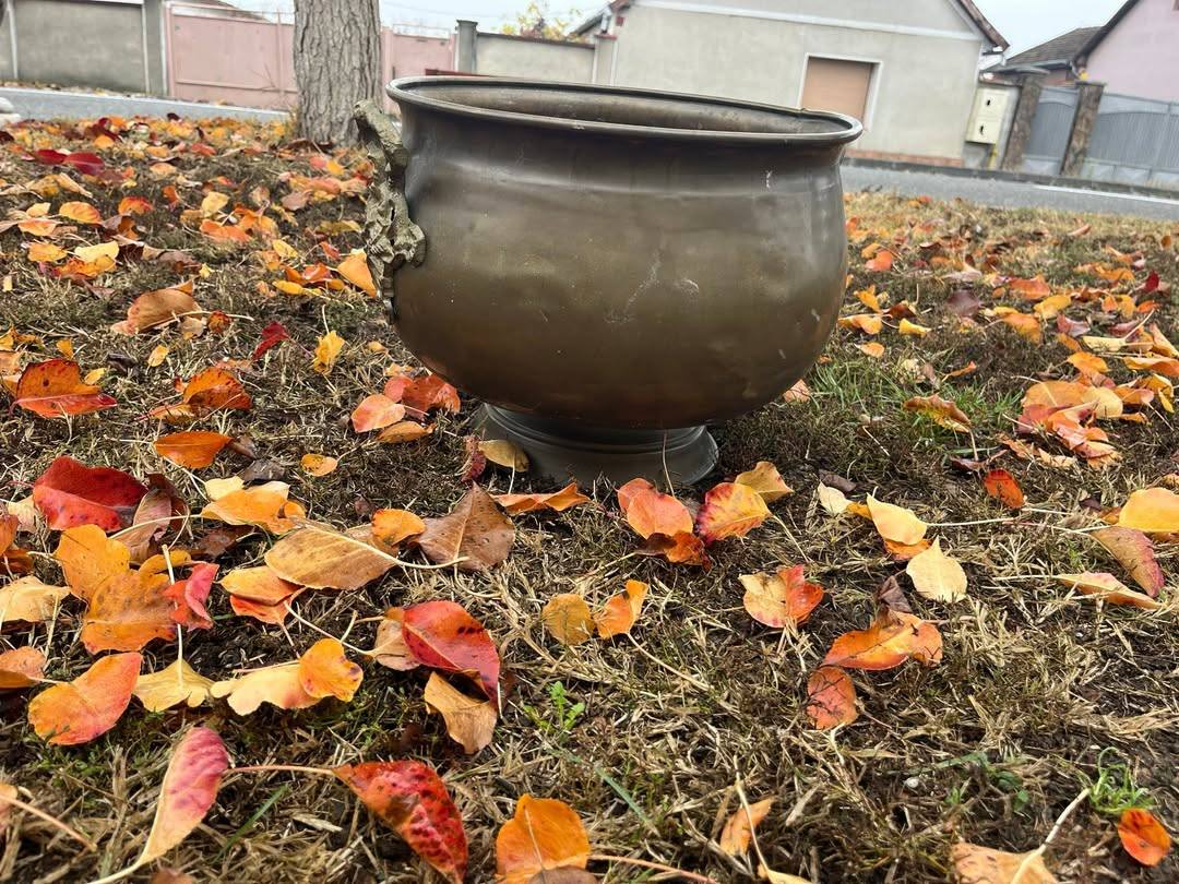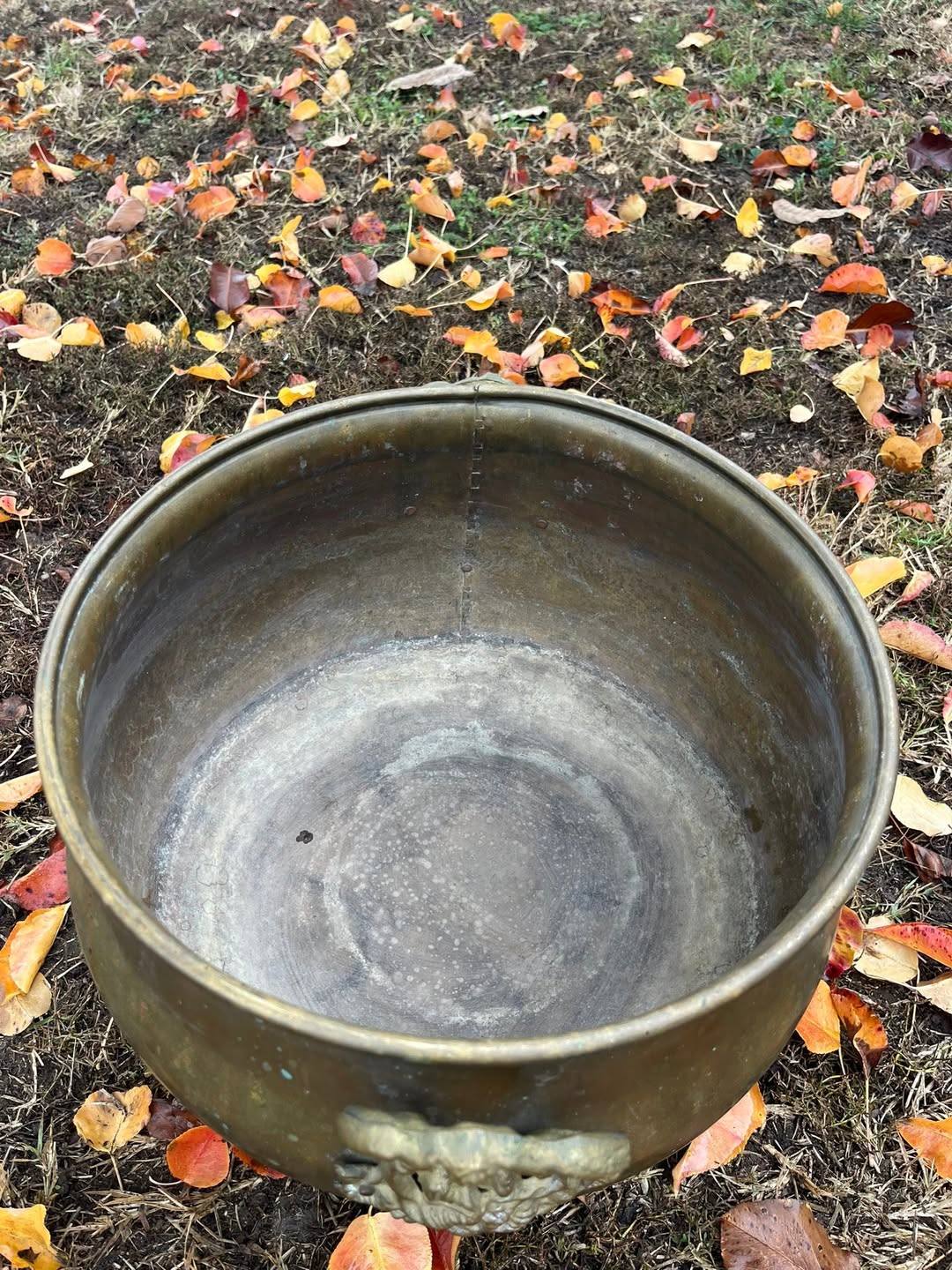 Vas antic din alamă, lucrat manual, cu două mânere ornamentale din bronz în stil clasic. Piesa are un aspect autentic, patină naturală și urme de vechime care îi