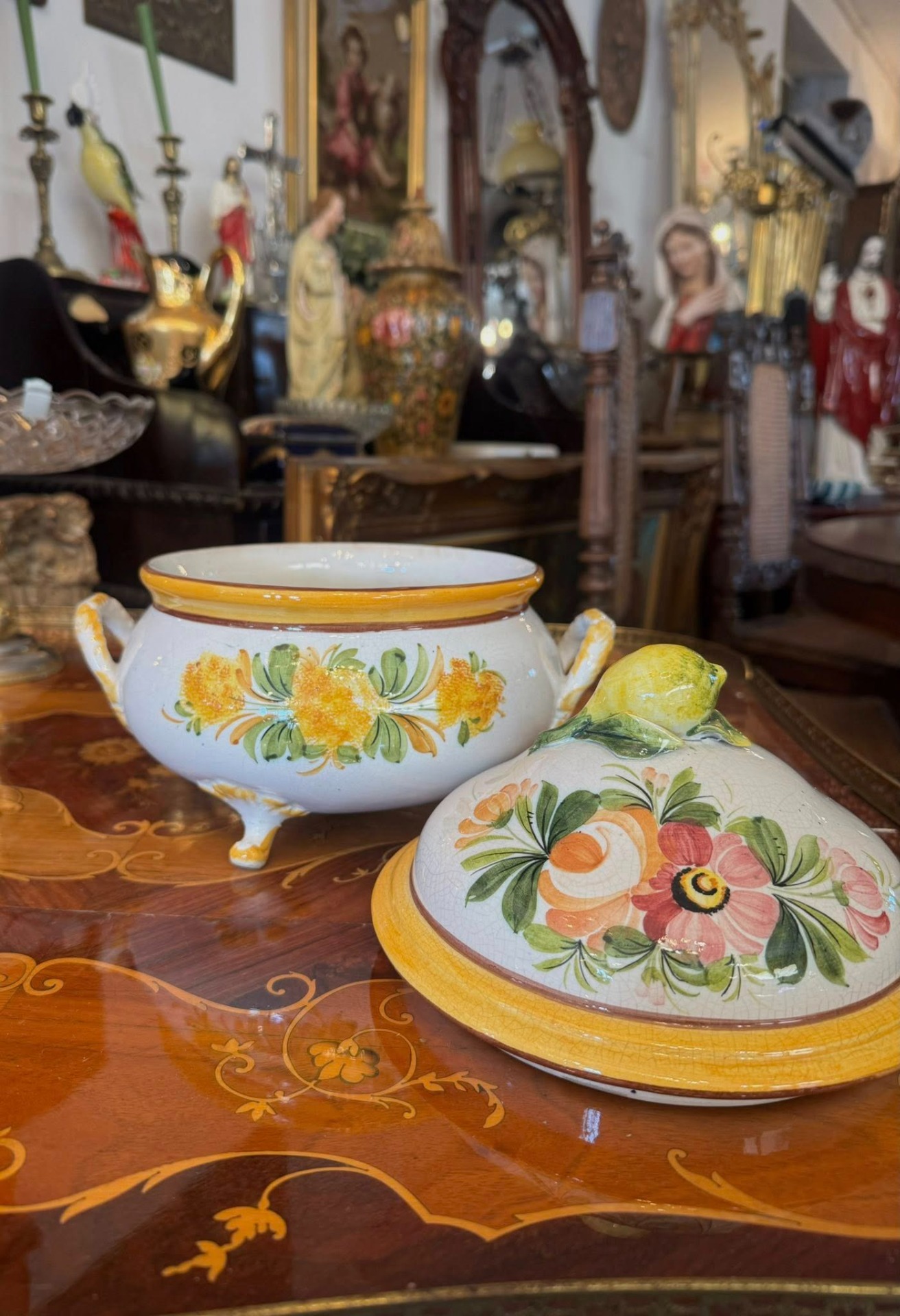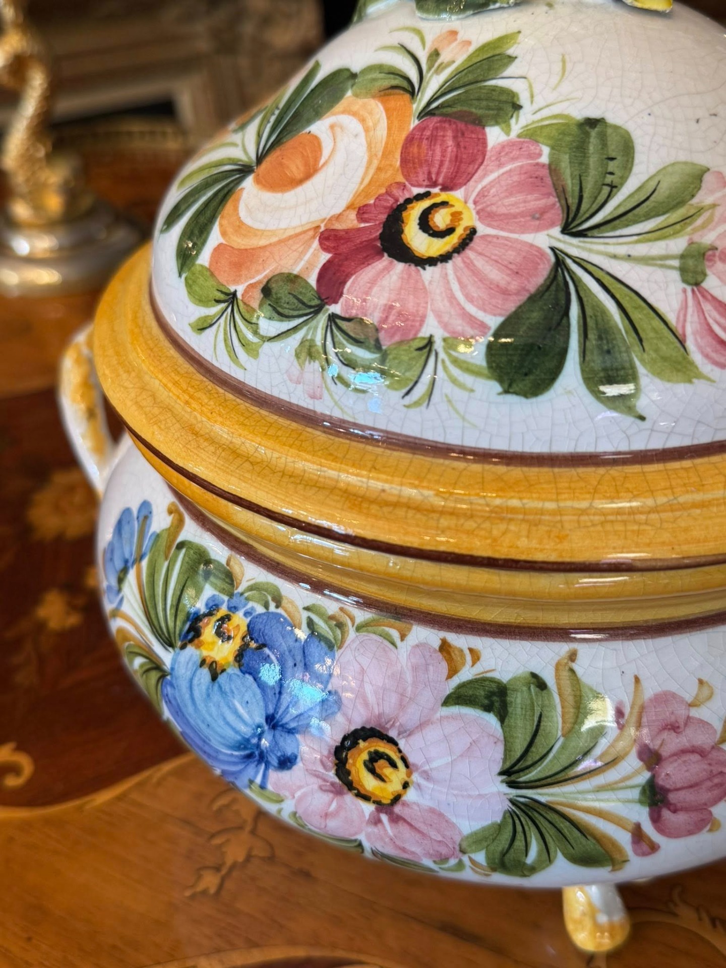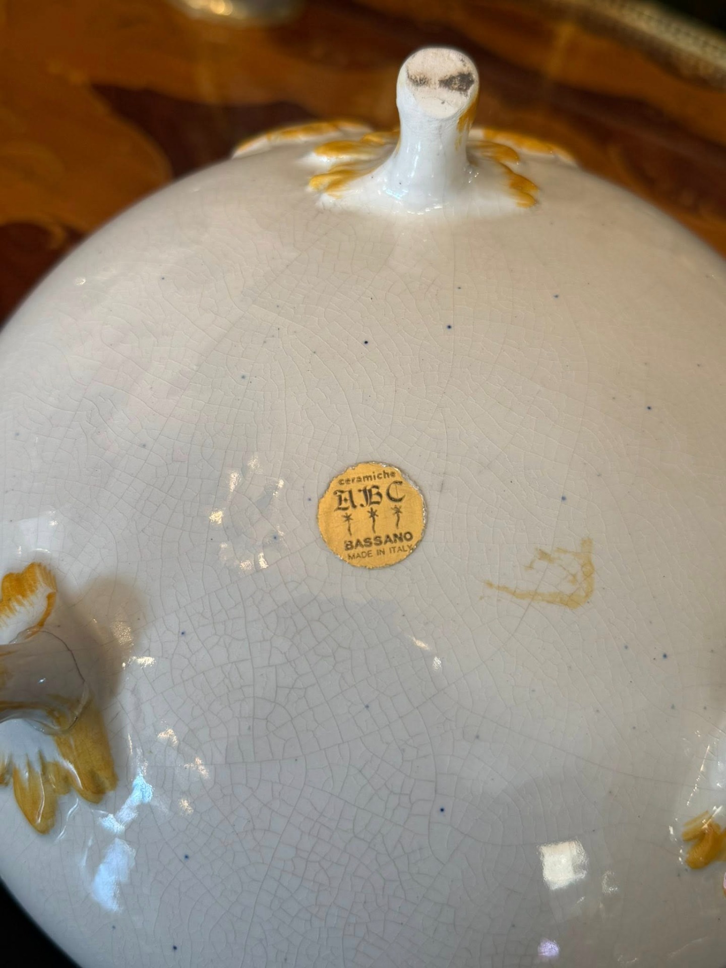 Vas cu capac din ceramică, de tip supieră realizat în stilul tradițional Bassano, caracterizat prin forme bogate și motive naturale.