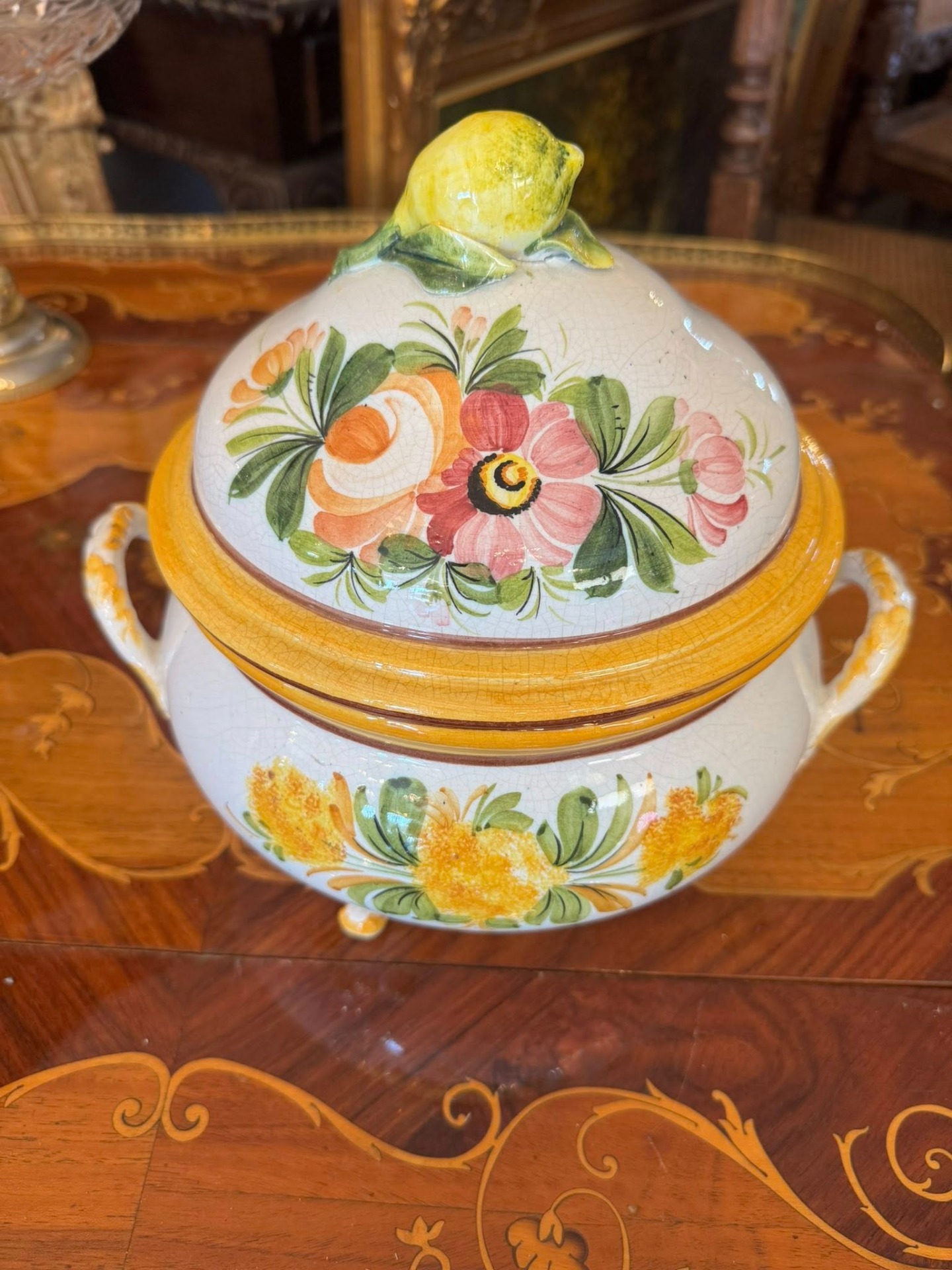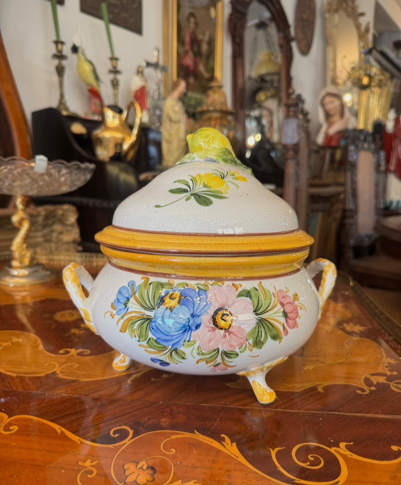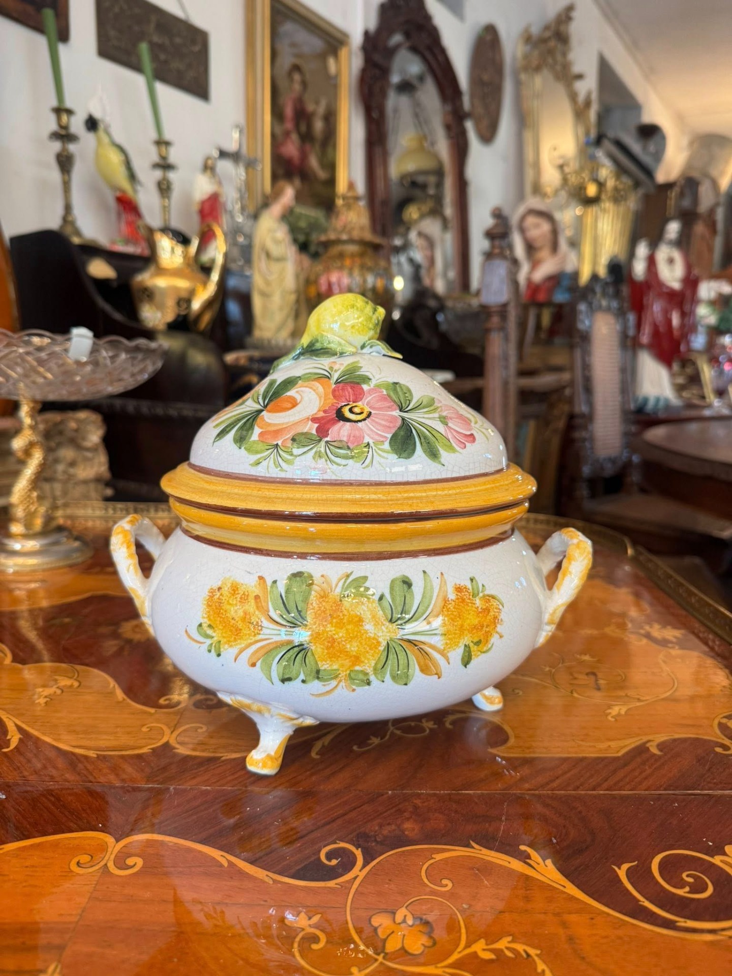 Vas cu capac din ceramică, de tip supieră realizat în stilul tradițional Bassano, caracterizat prin forme bogate și motive naturale.