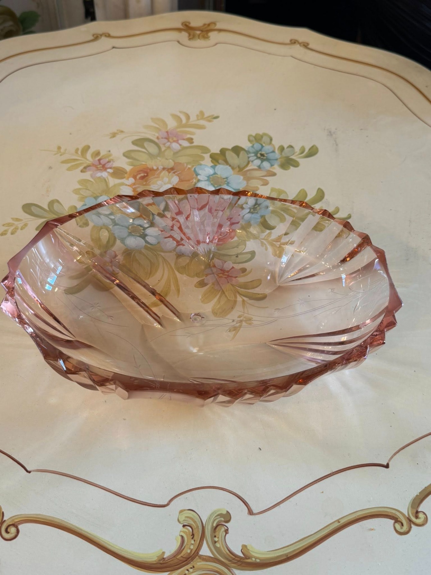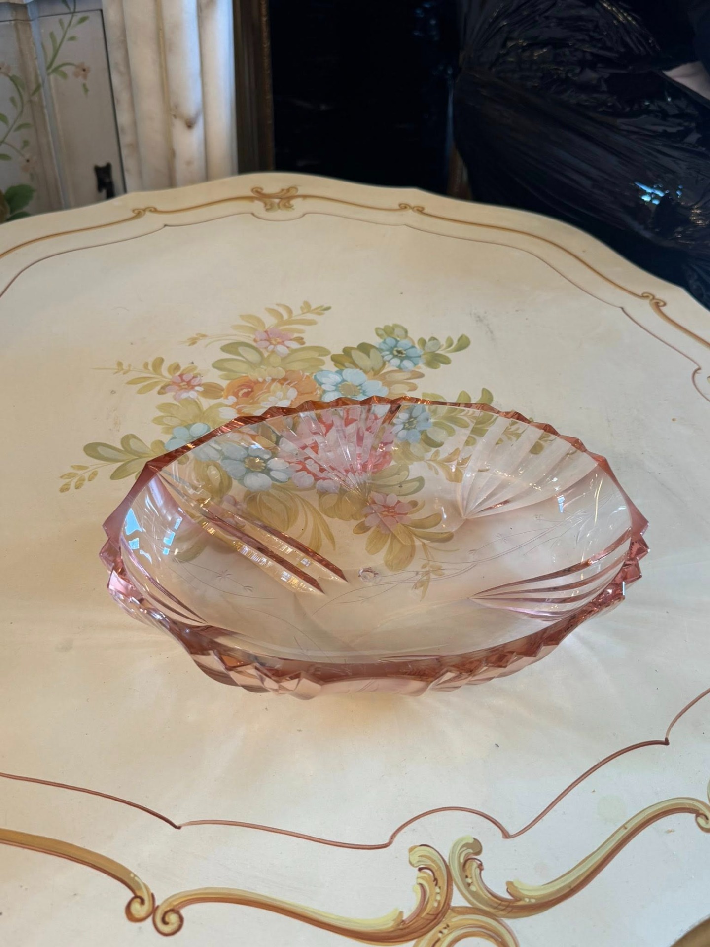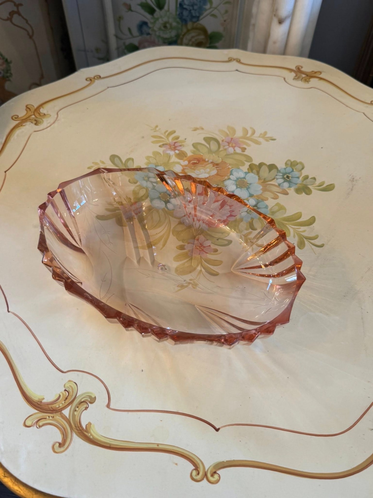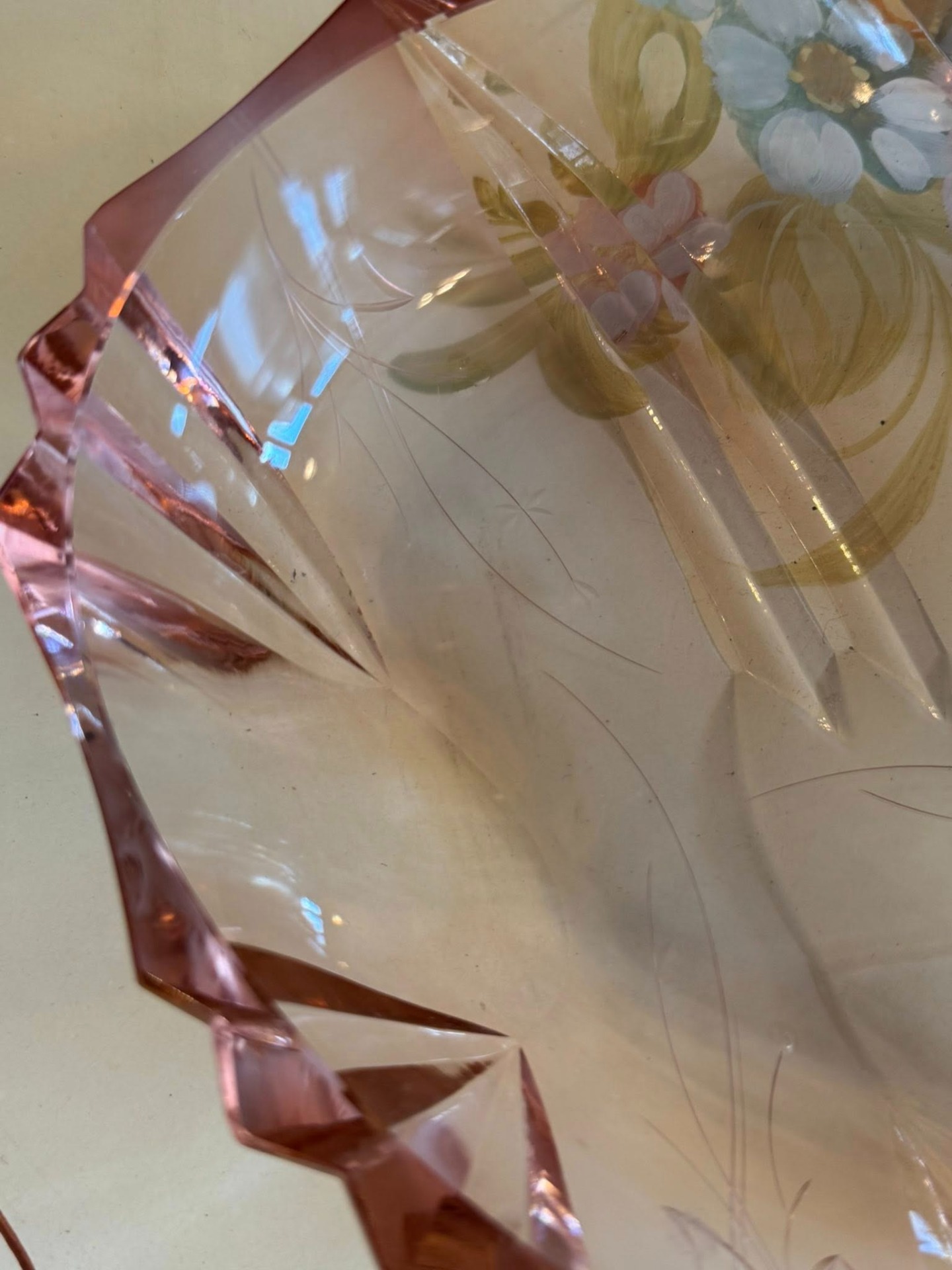Vasul are un design geometric pronunțat, cu margini tăiate în unghiuri ascuțite (în zig-zag sau „sawtooth”), tipic stilului Art Deco din anii 1930. Astfel de piese erau adesea produse în ateliere renumite din Cehoslovacia (Bohemia) sau Germania.