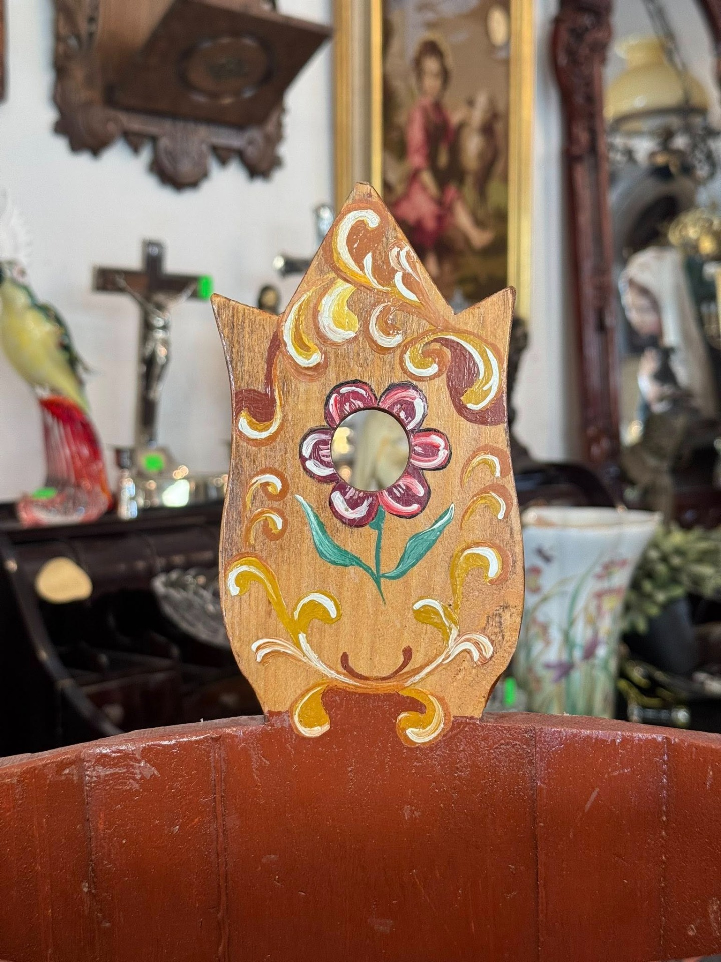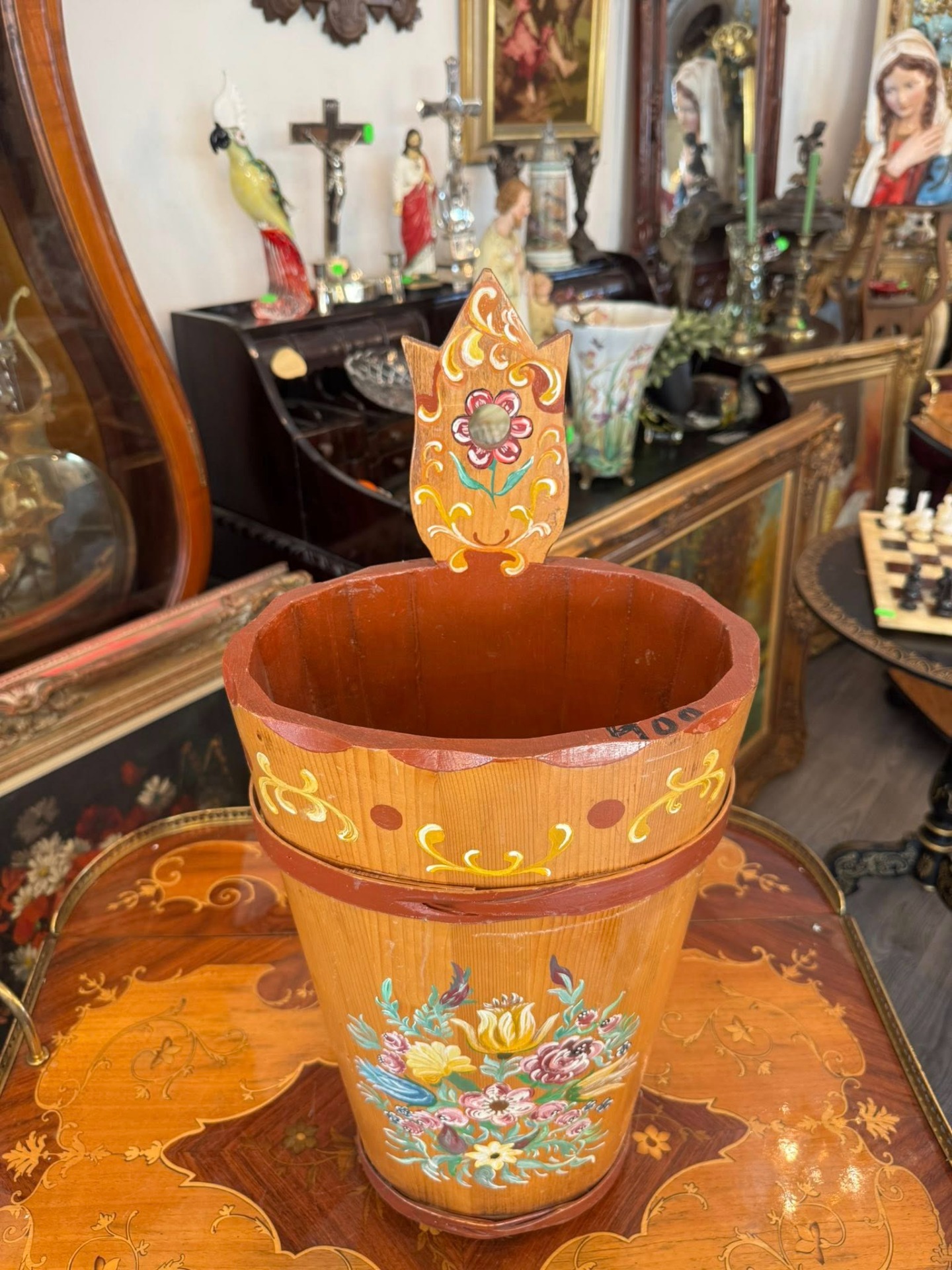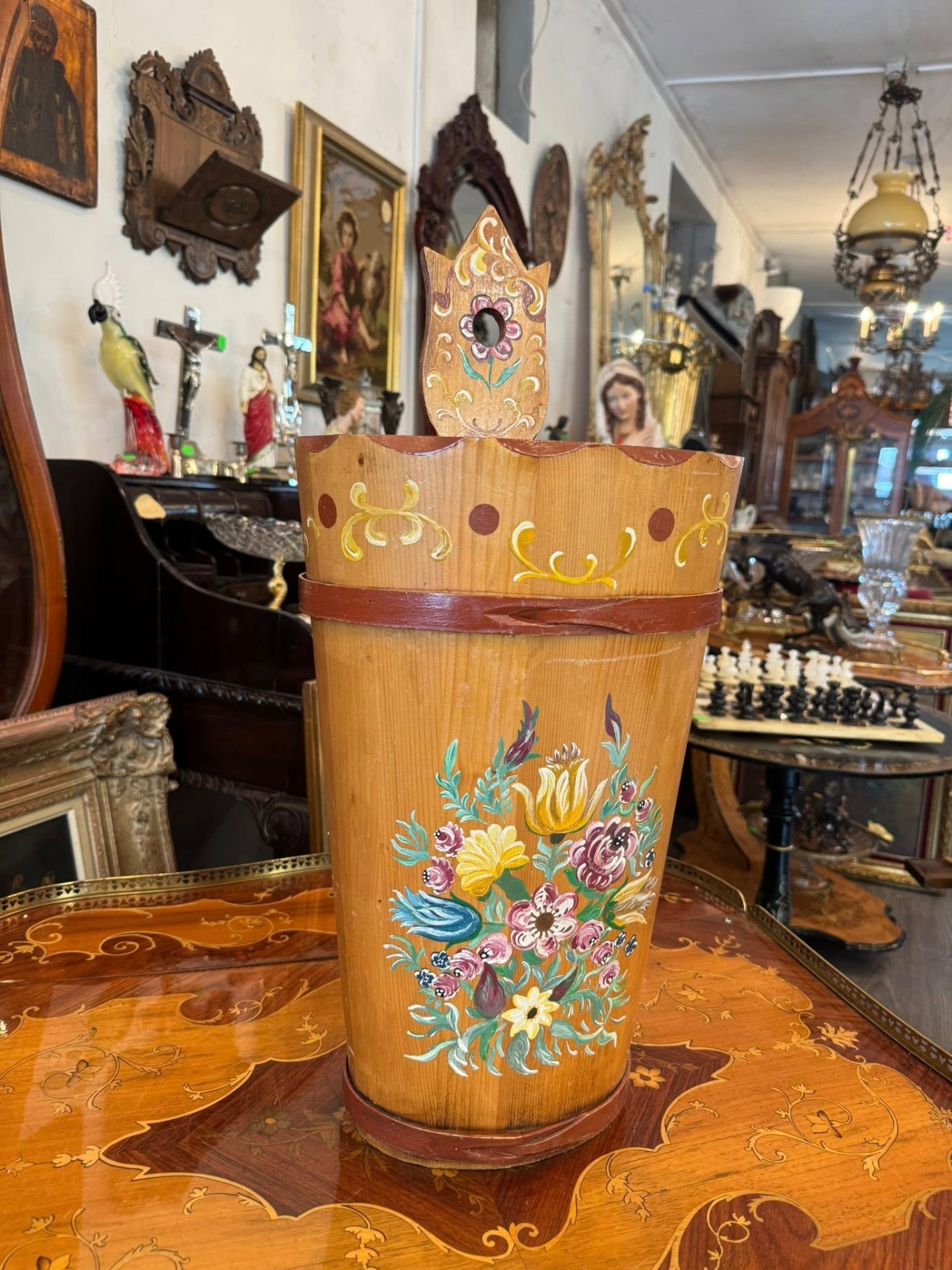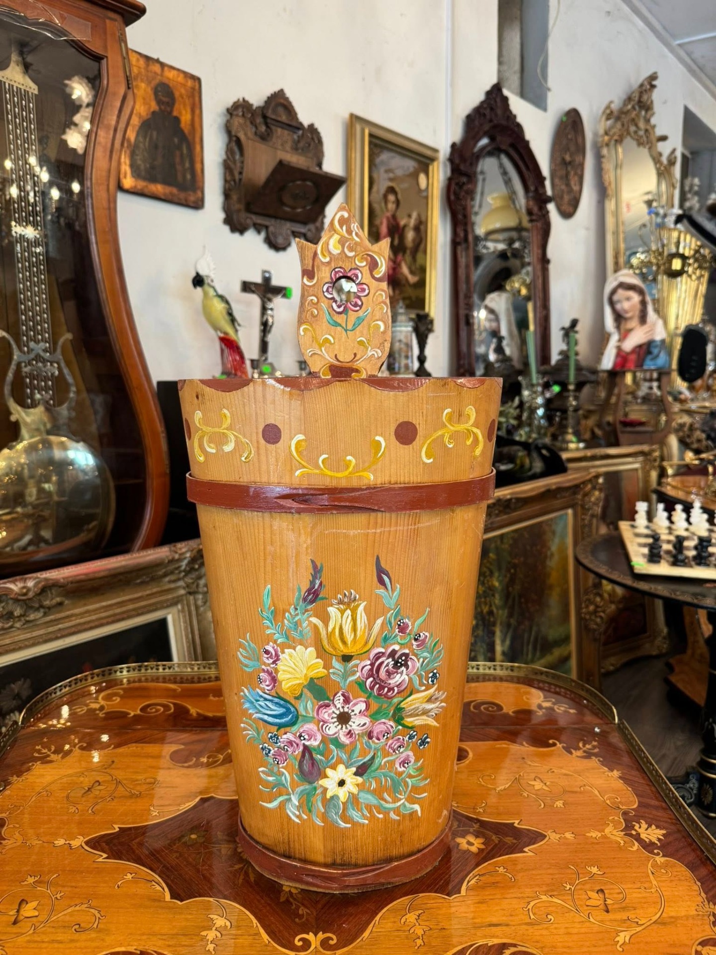 Vas din lemn pictat manual. Obiectul este decorat manual folosind tehnica picturii pe lemn de tip floral. Acest stil de decorare este foarte popular în arta tradițională din zonele rurale din Austria și Bavaria.