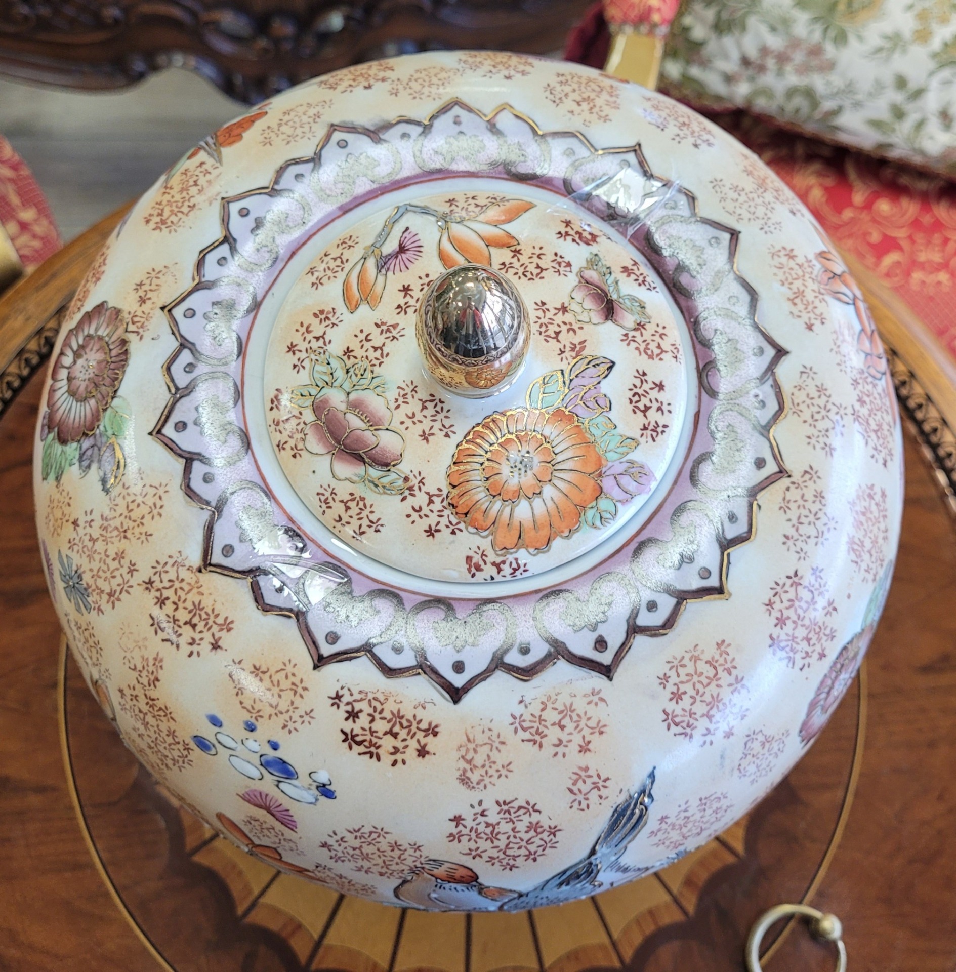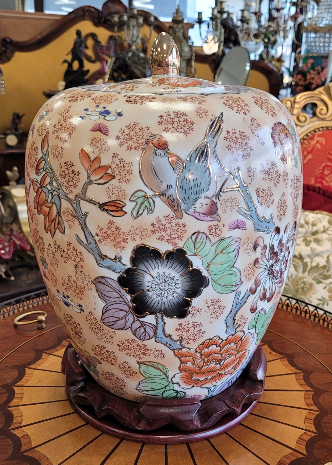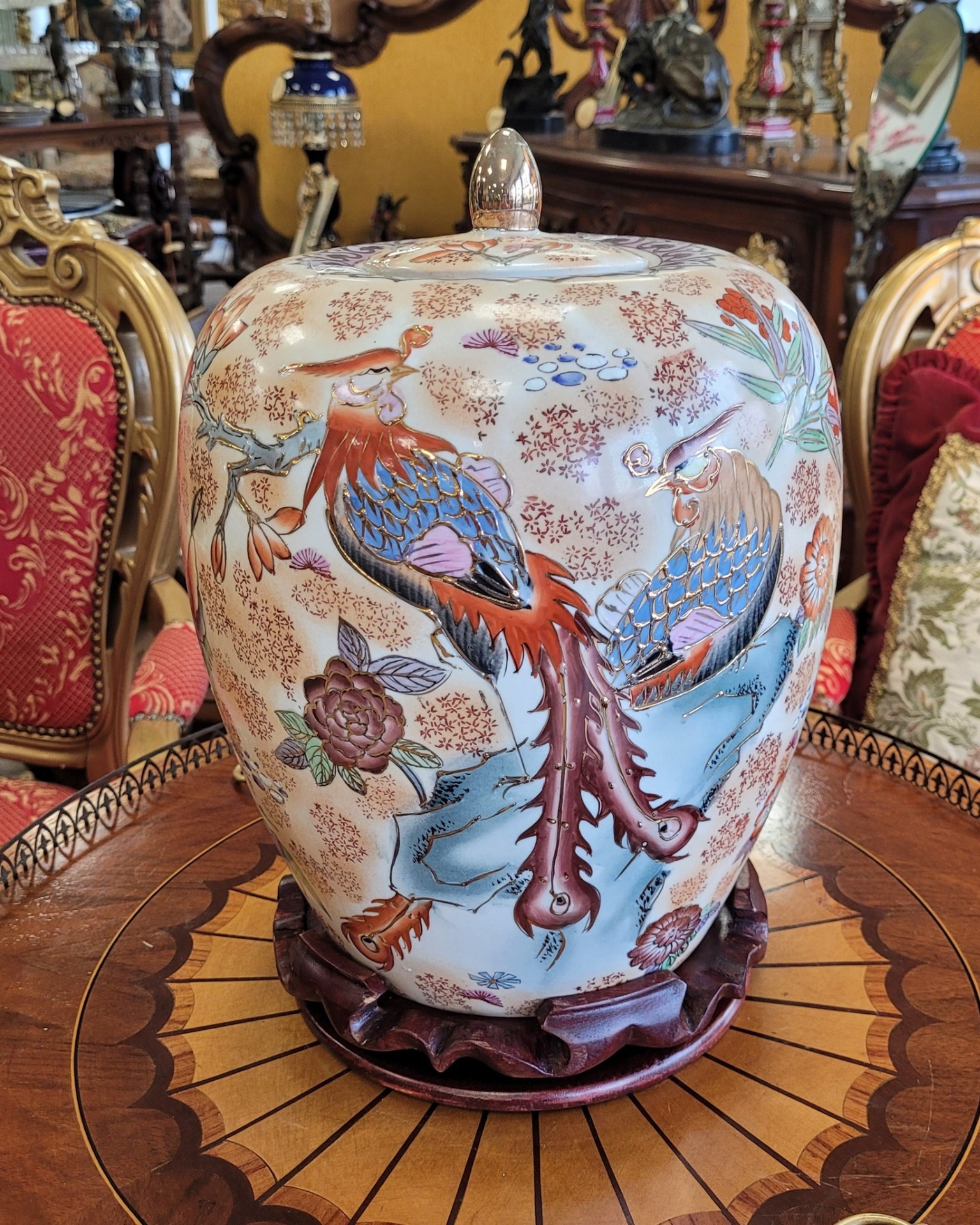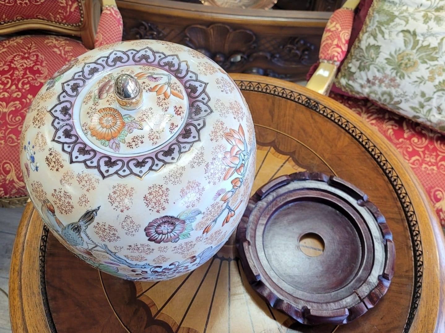 Vas din porțelan pictat cu motive florale și păsări, cu capac, așezat pe un suport din lemn.