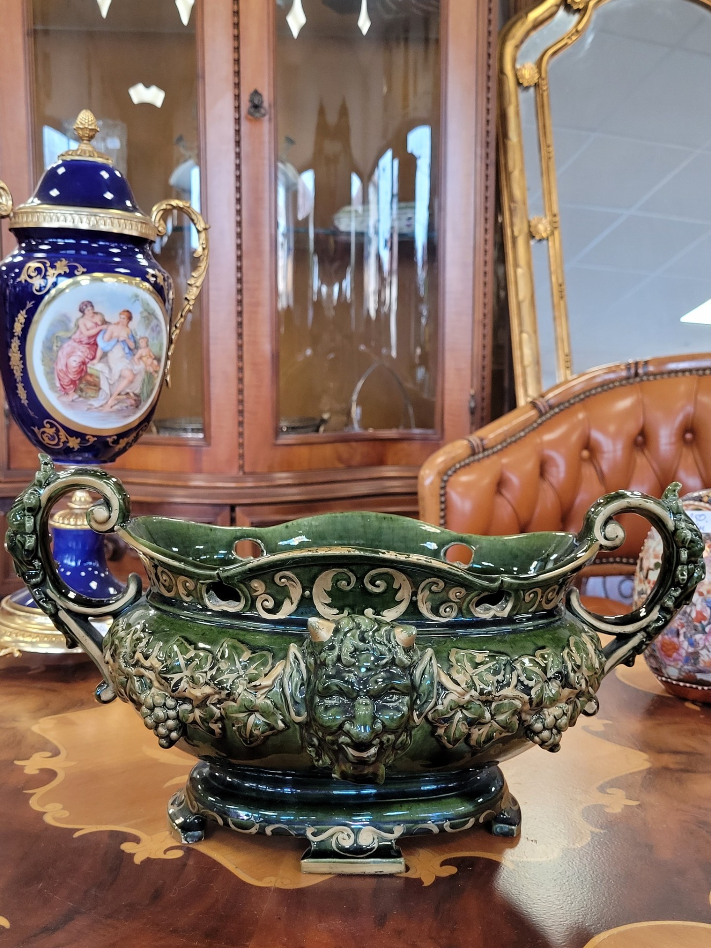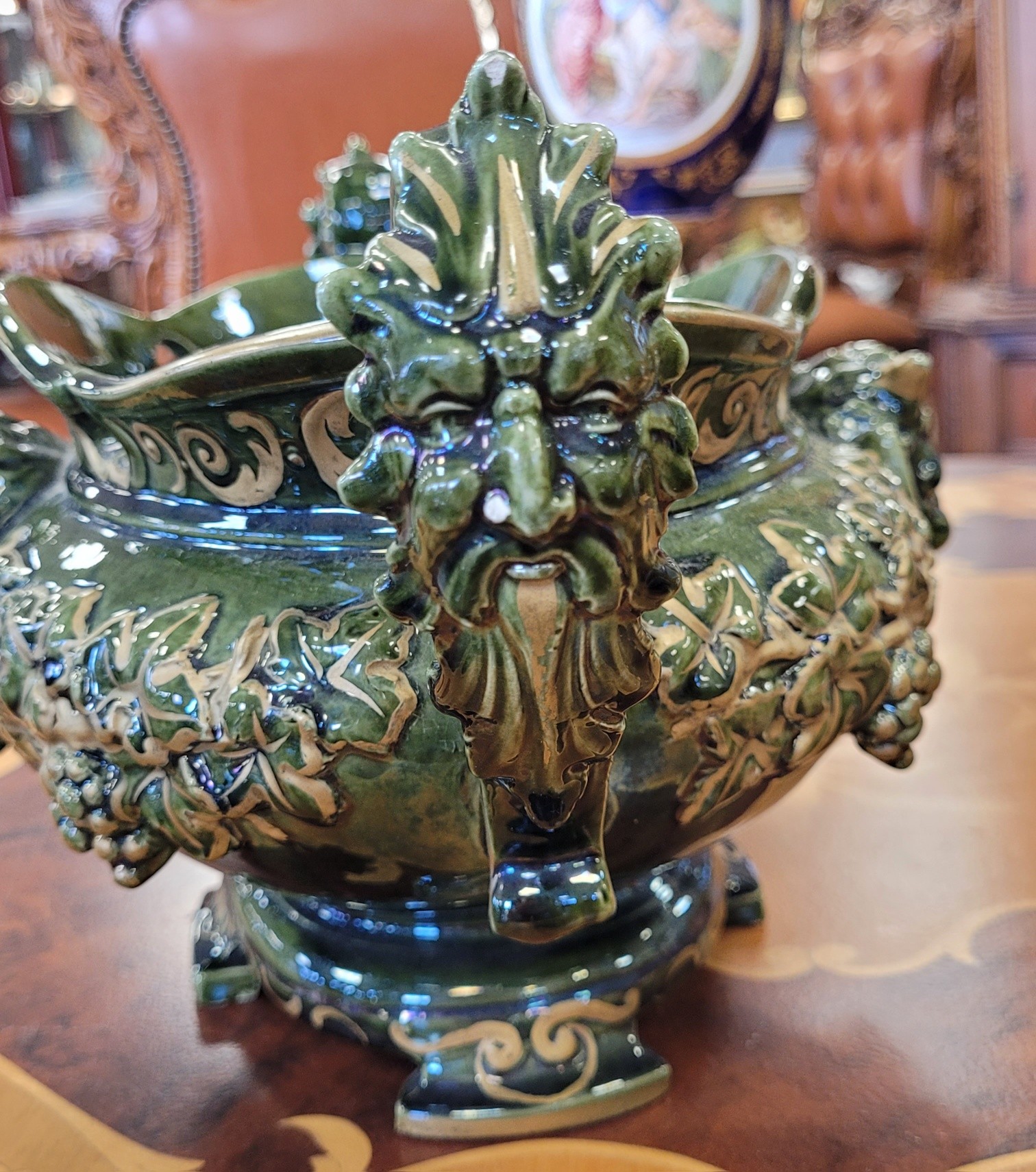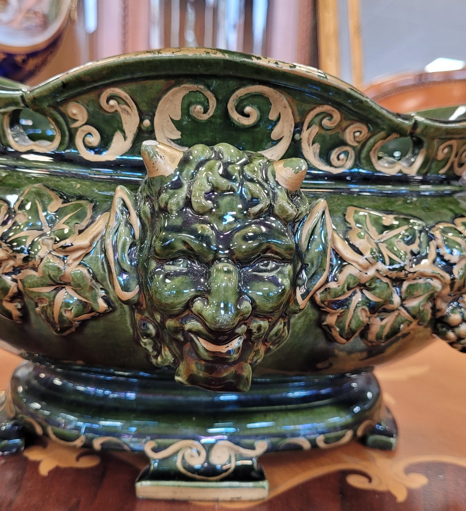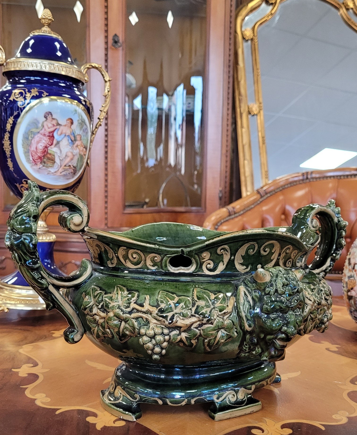 Vas impresionant din ceramică smălțuită (majolică), într-o nuanță superbă de verde smarald închis, decorată cu detalii în relief și simbolistică mitologică.