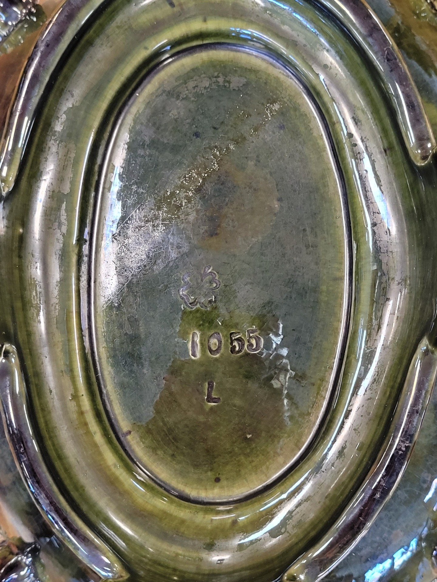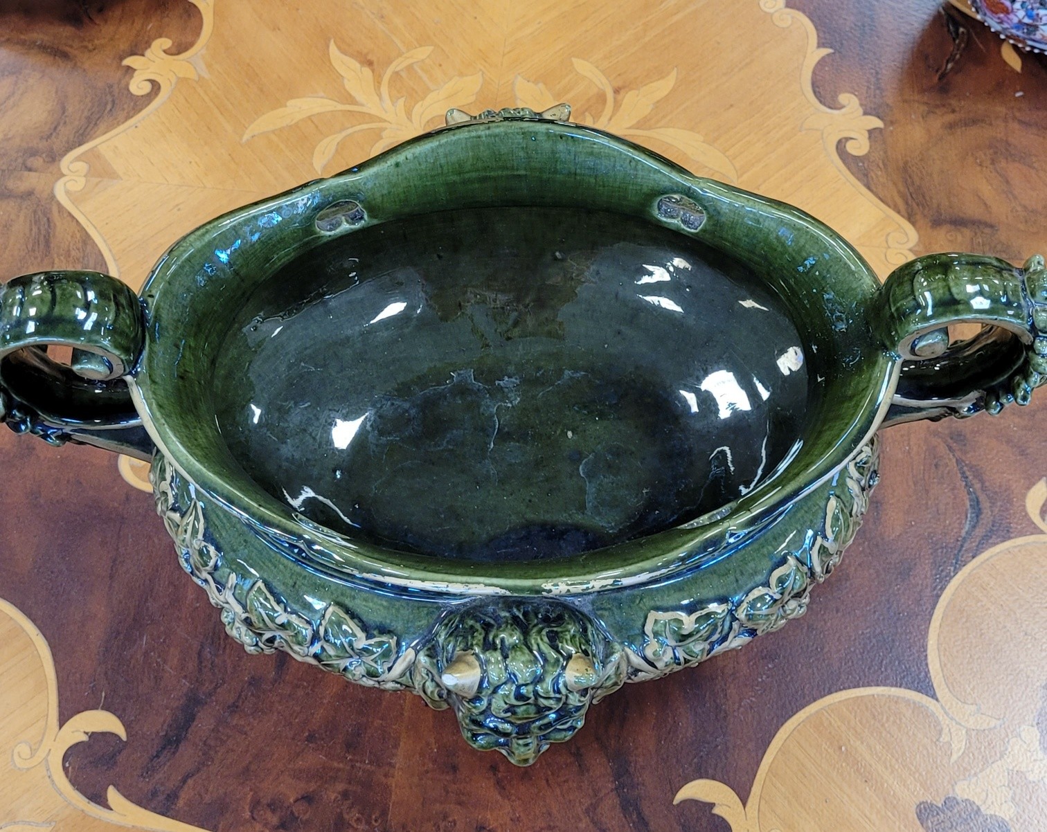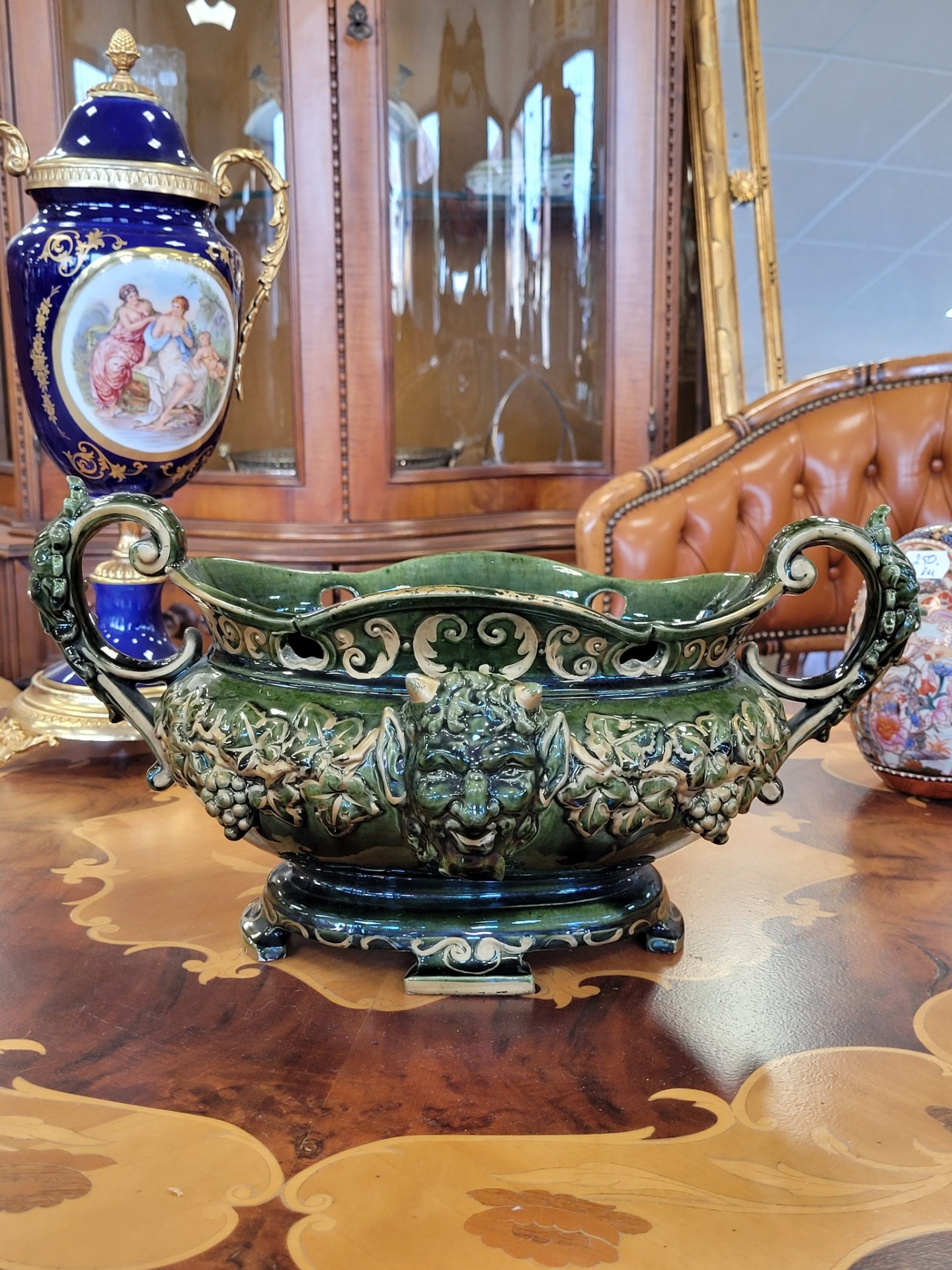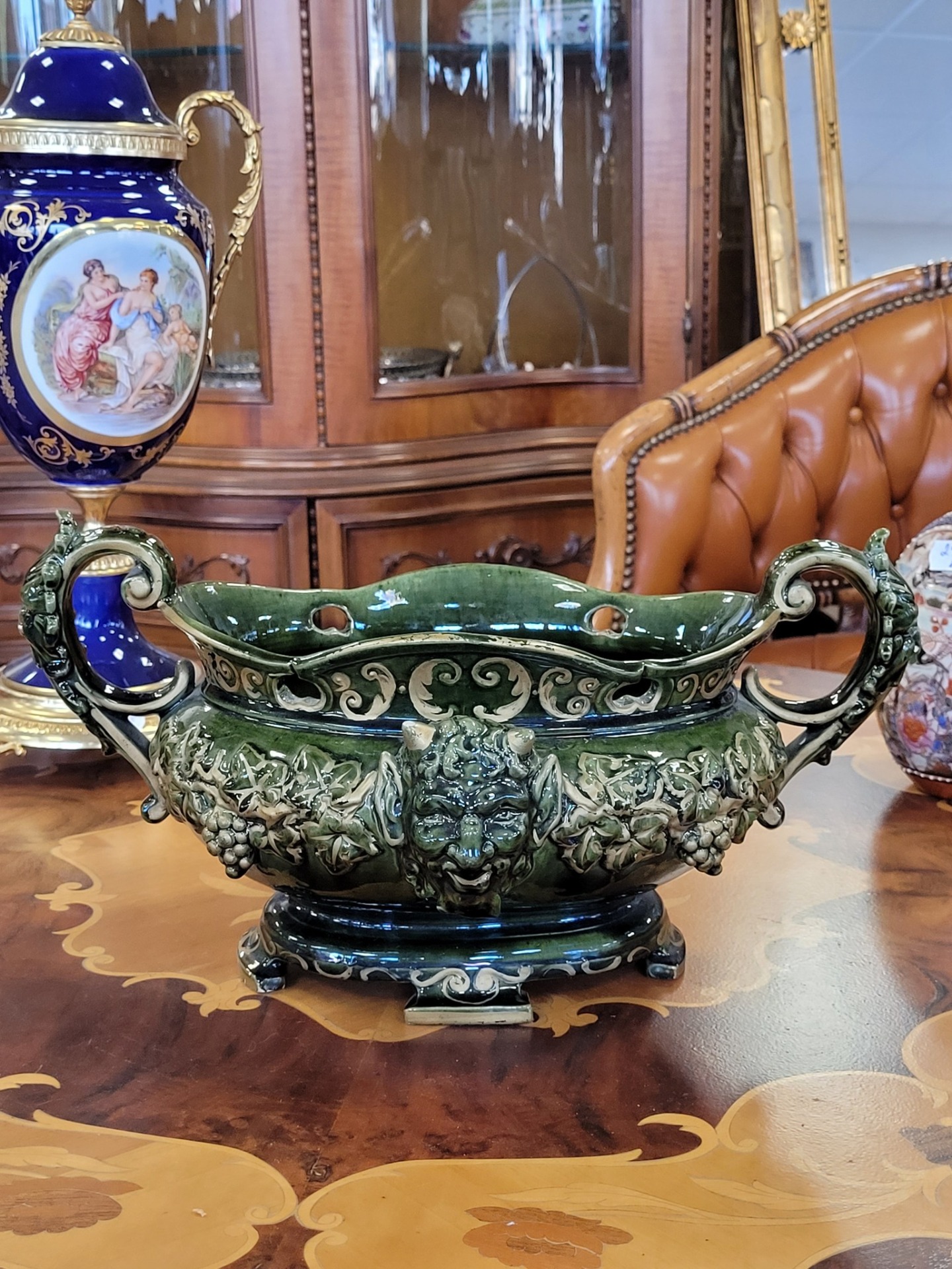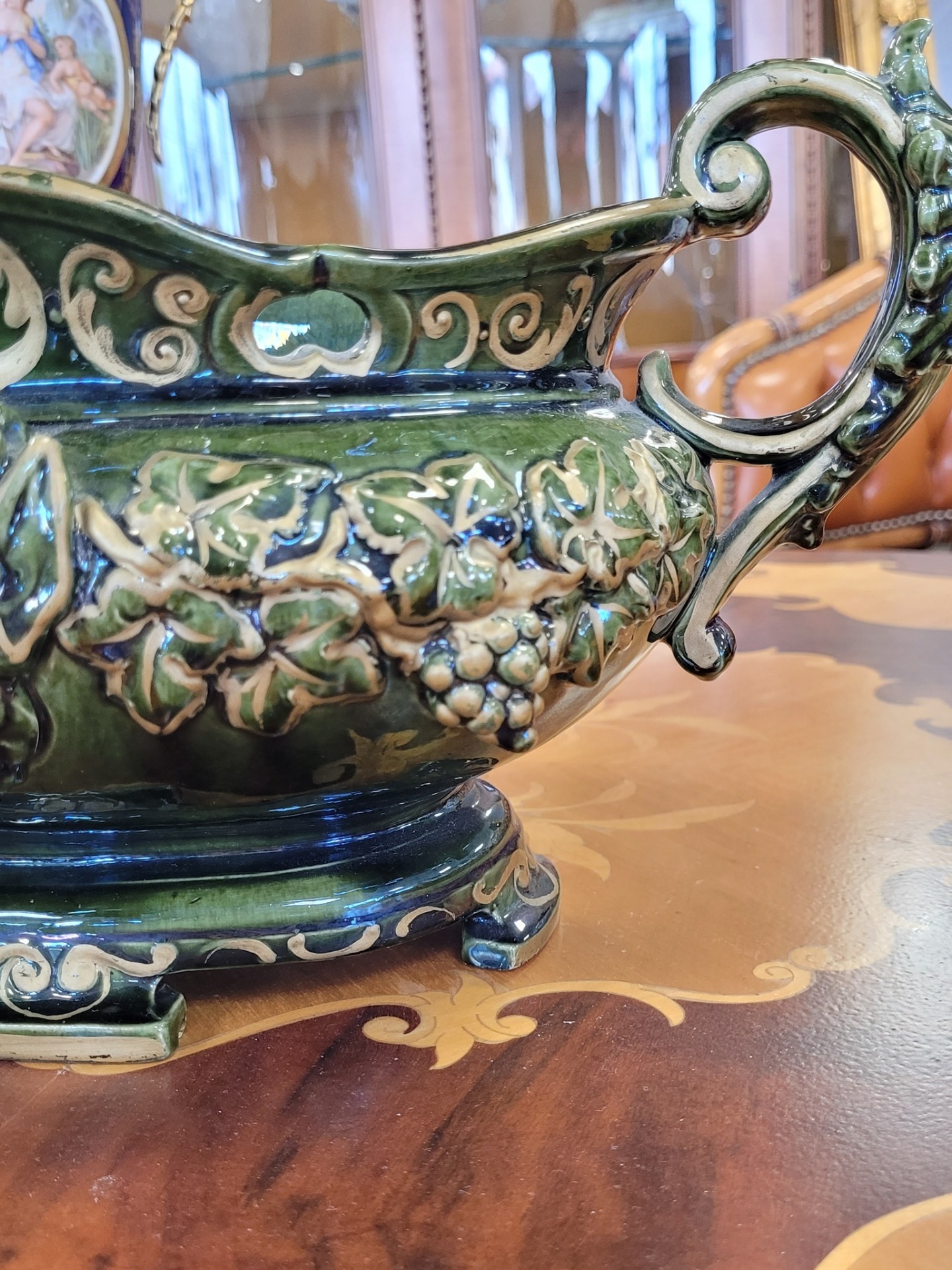 Vas impresionant din ceramică smălțuită (majolică), într-o nuanță superbă de verde smarald închis, decorată cu detalii în relief și simbolistică mitologică.
