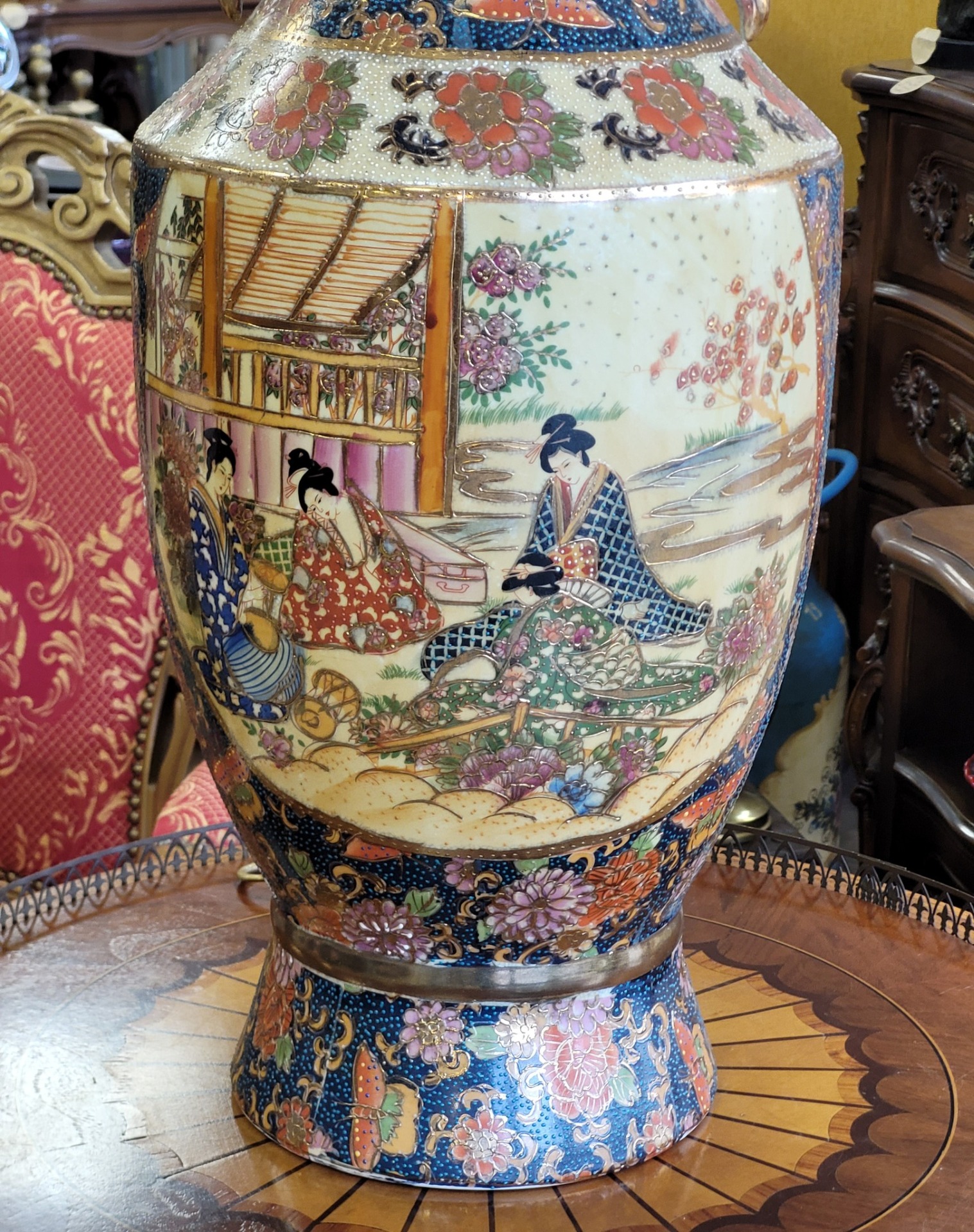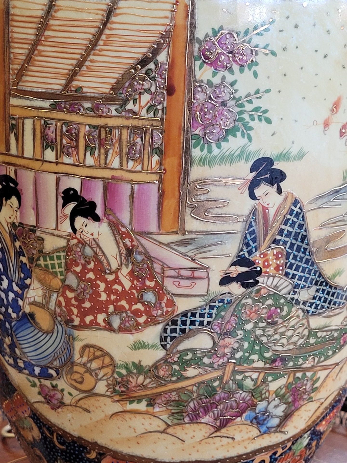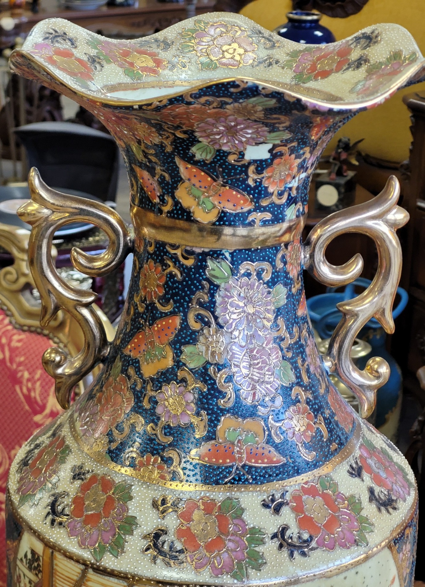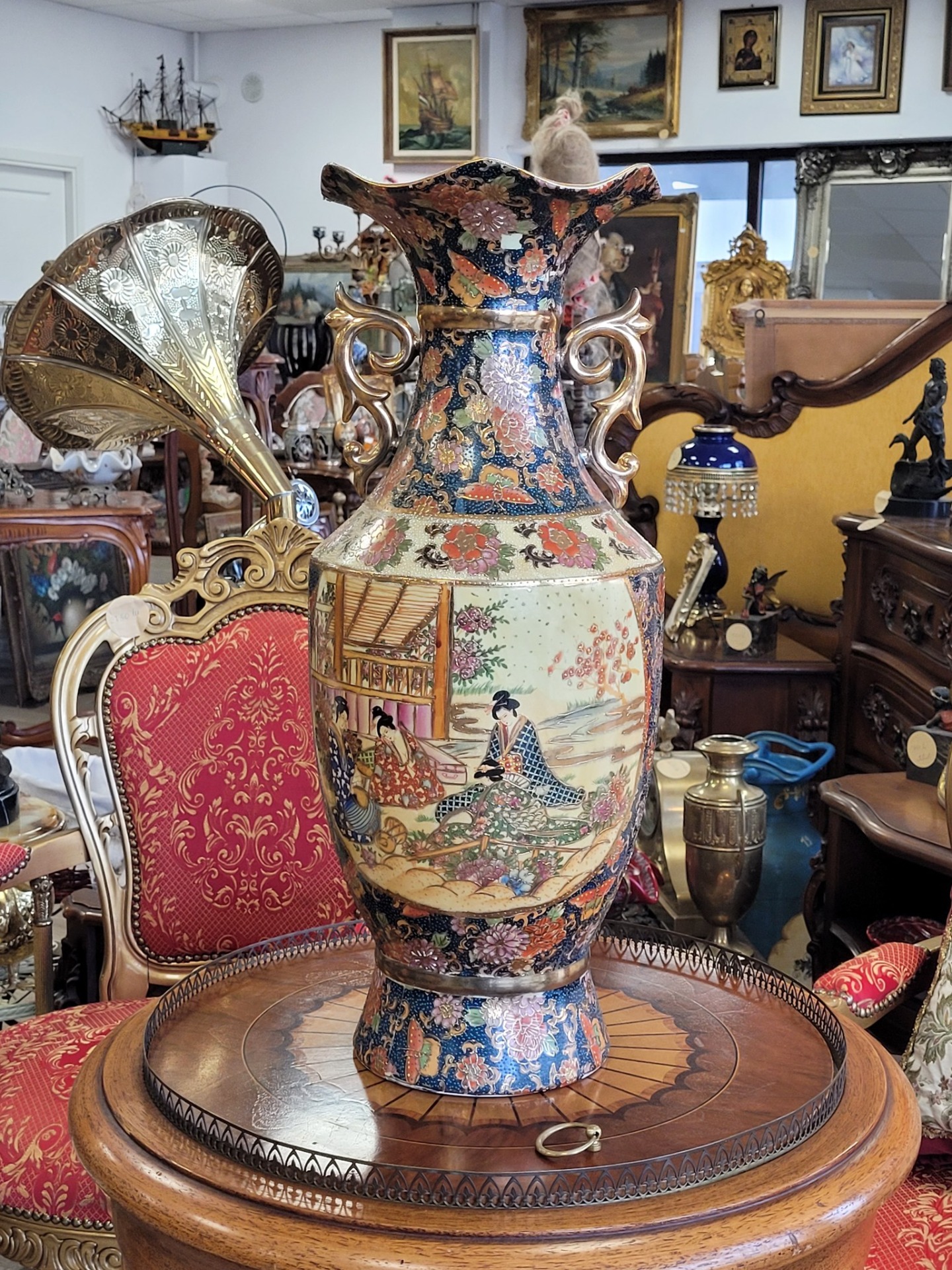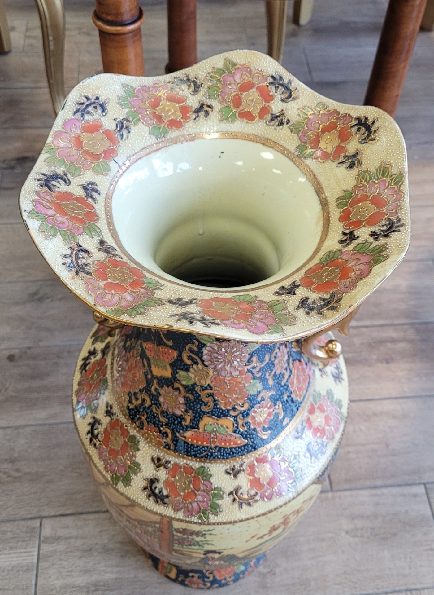 Vază asiatică de colecție în stil Satsuma, cu decor bogat și culori vibrante, realizată în stilul bogat și detaliat al porțelanului asiatic, impunătoare,