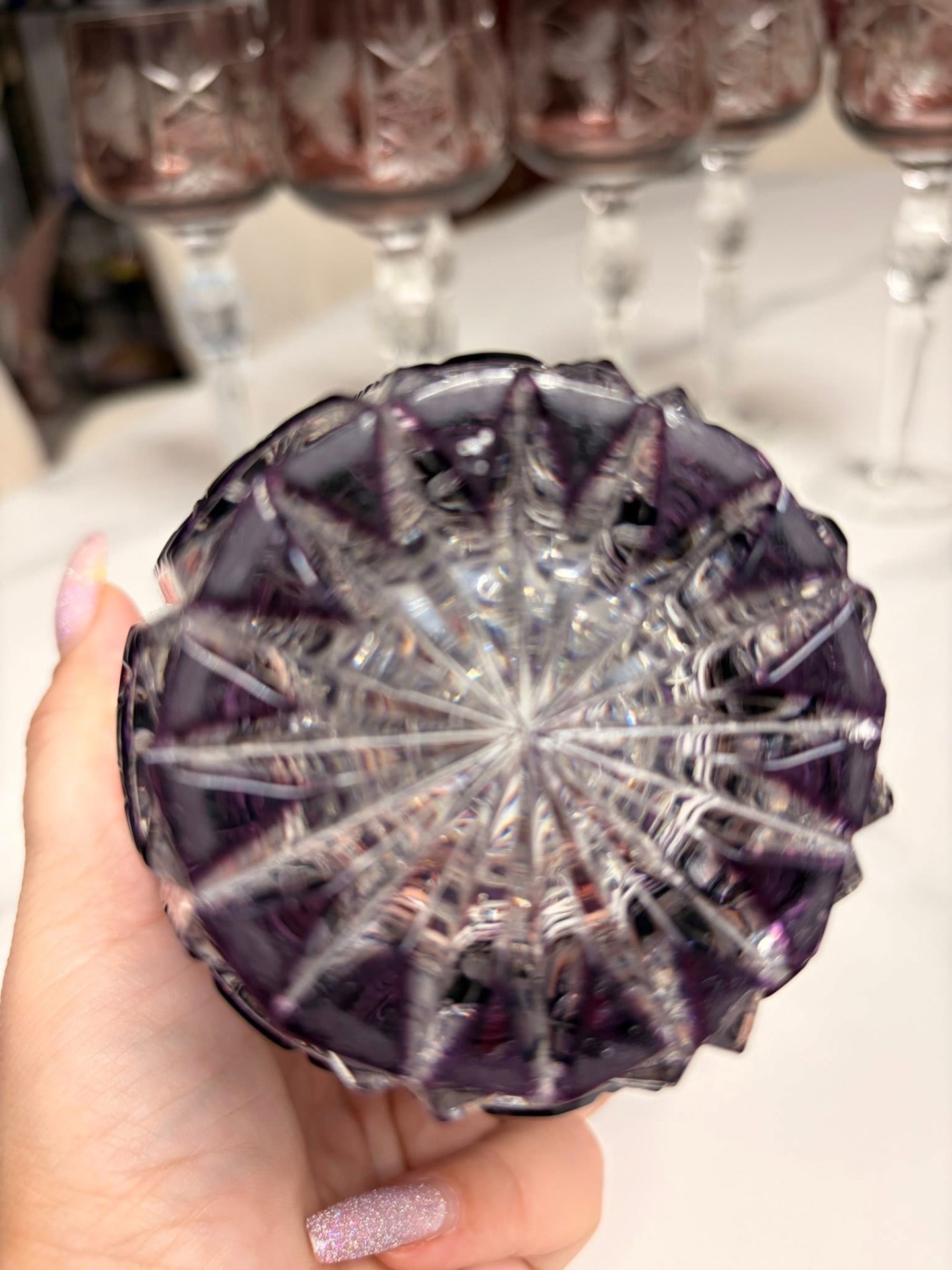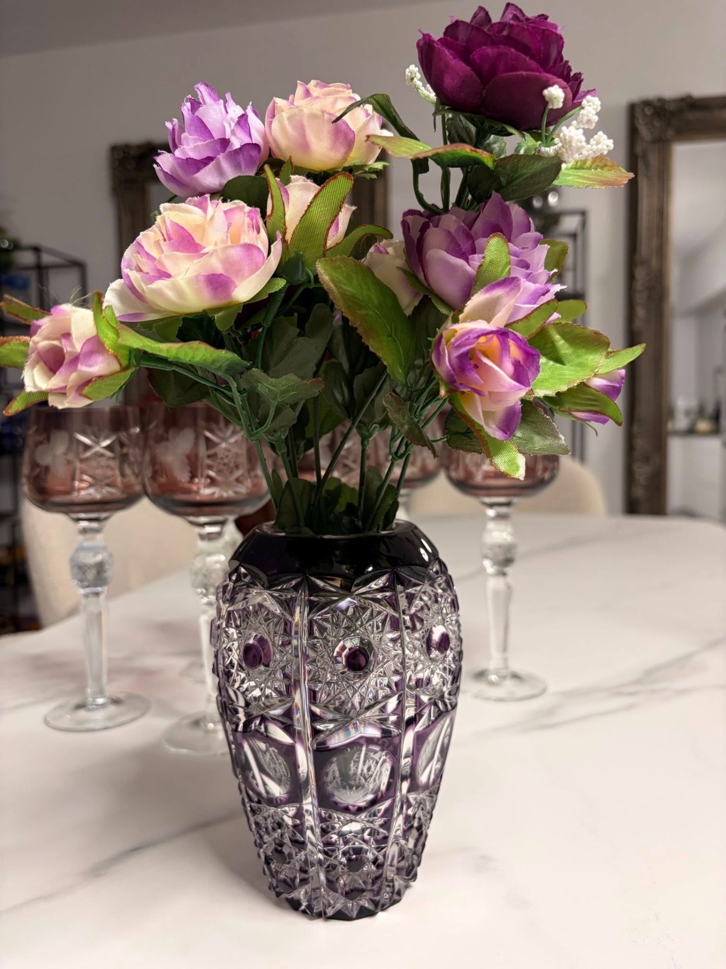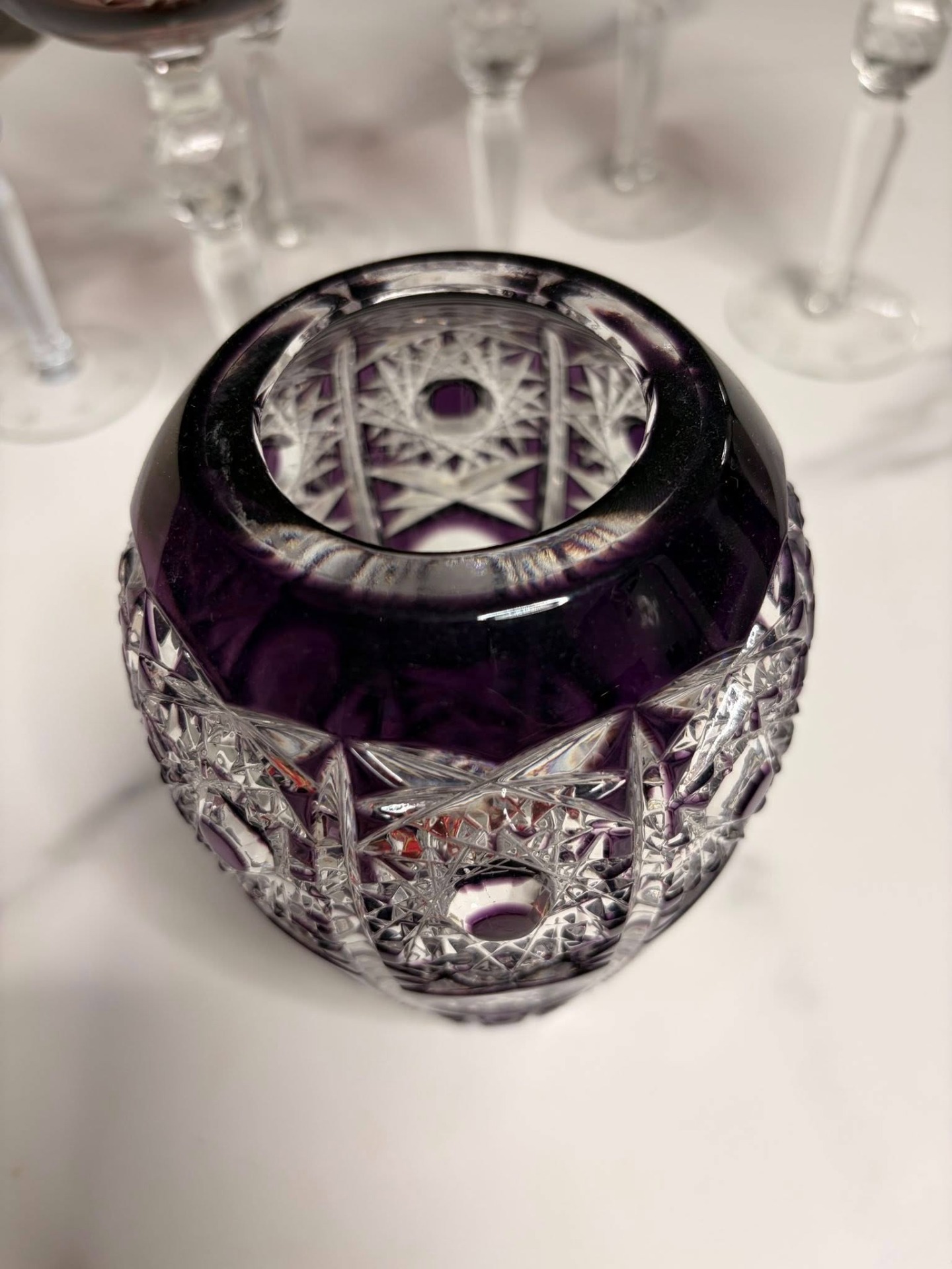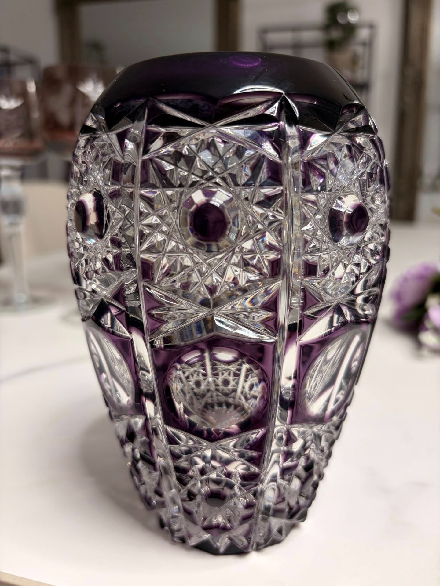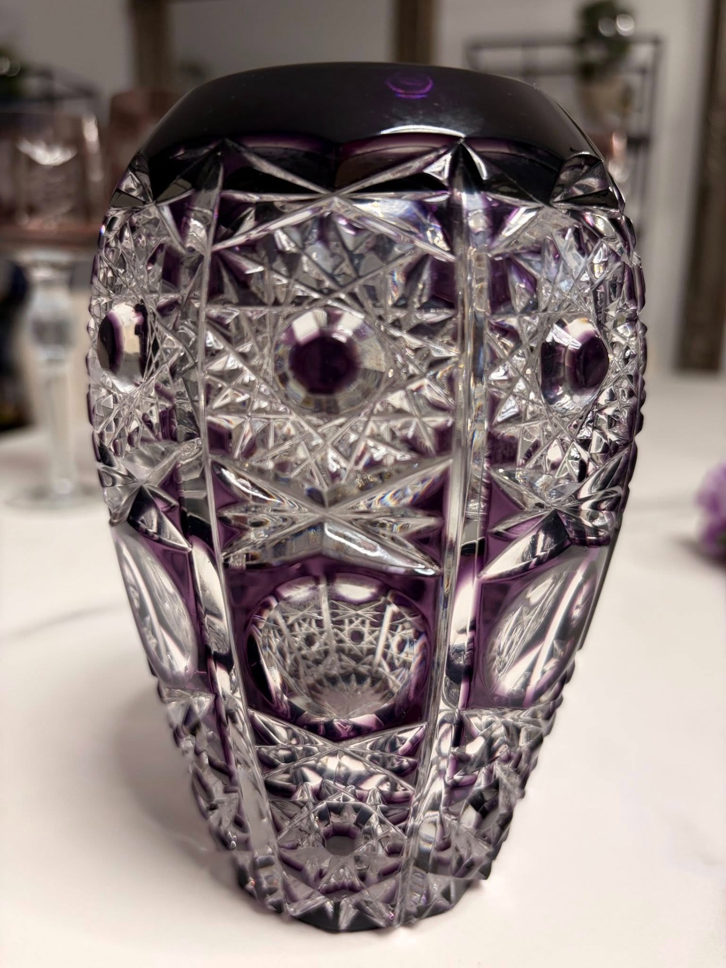 Vază decorativă din cristal gros, de calitate superioară, cu nuanță rafinată de mov-ambră și tăieturi manuale adânci în motive geometrice și stelare. Fațetele
