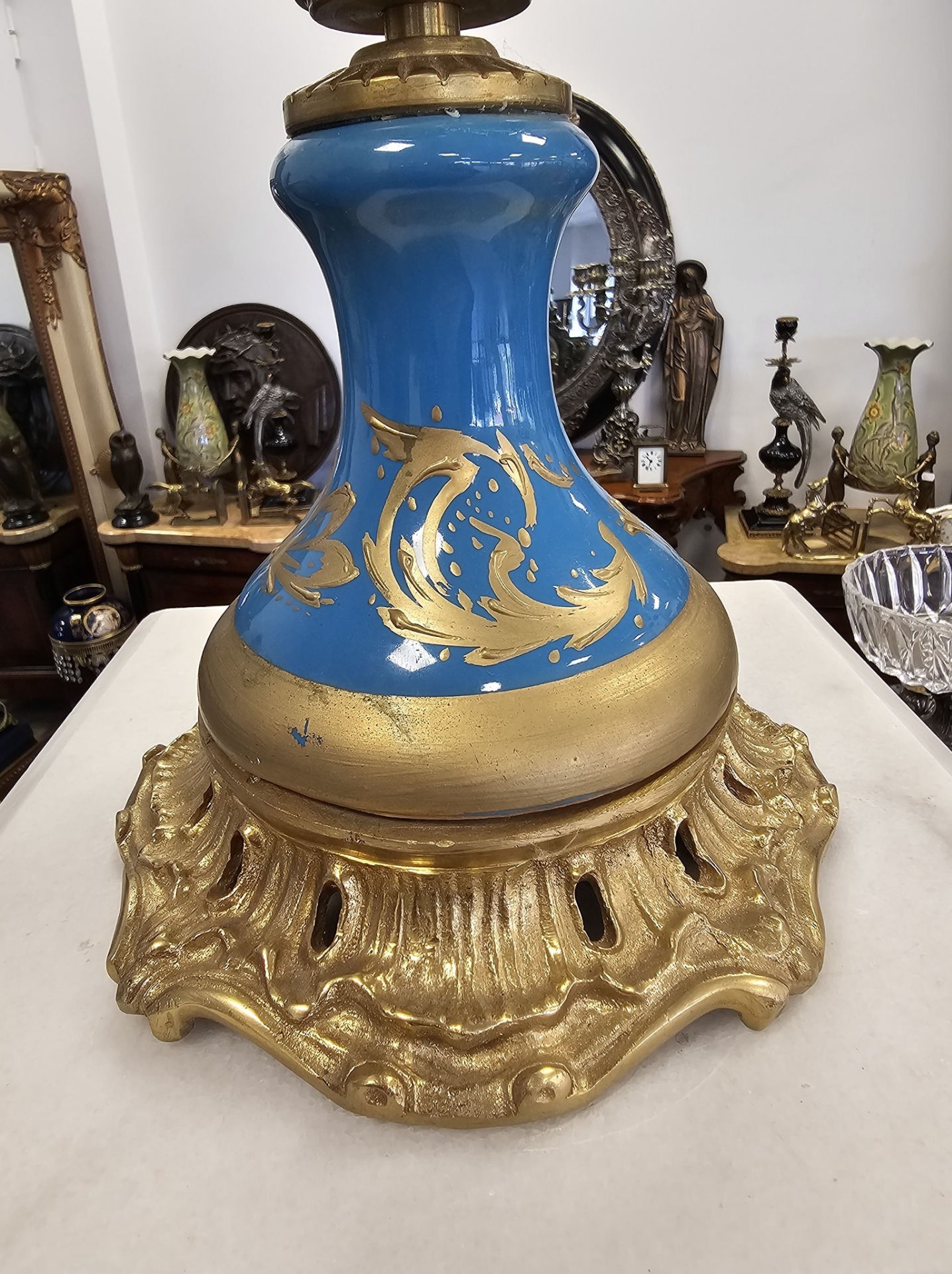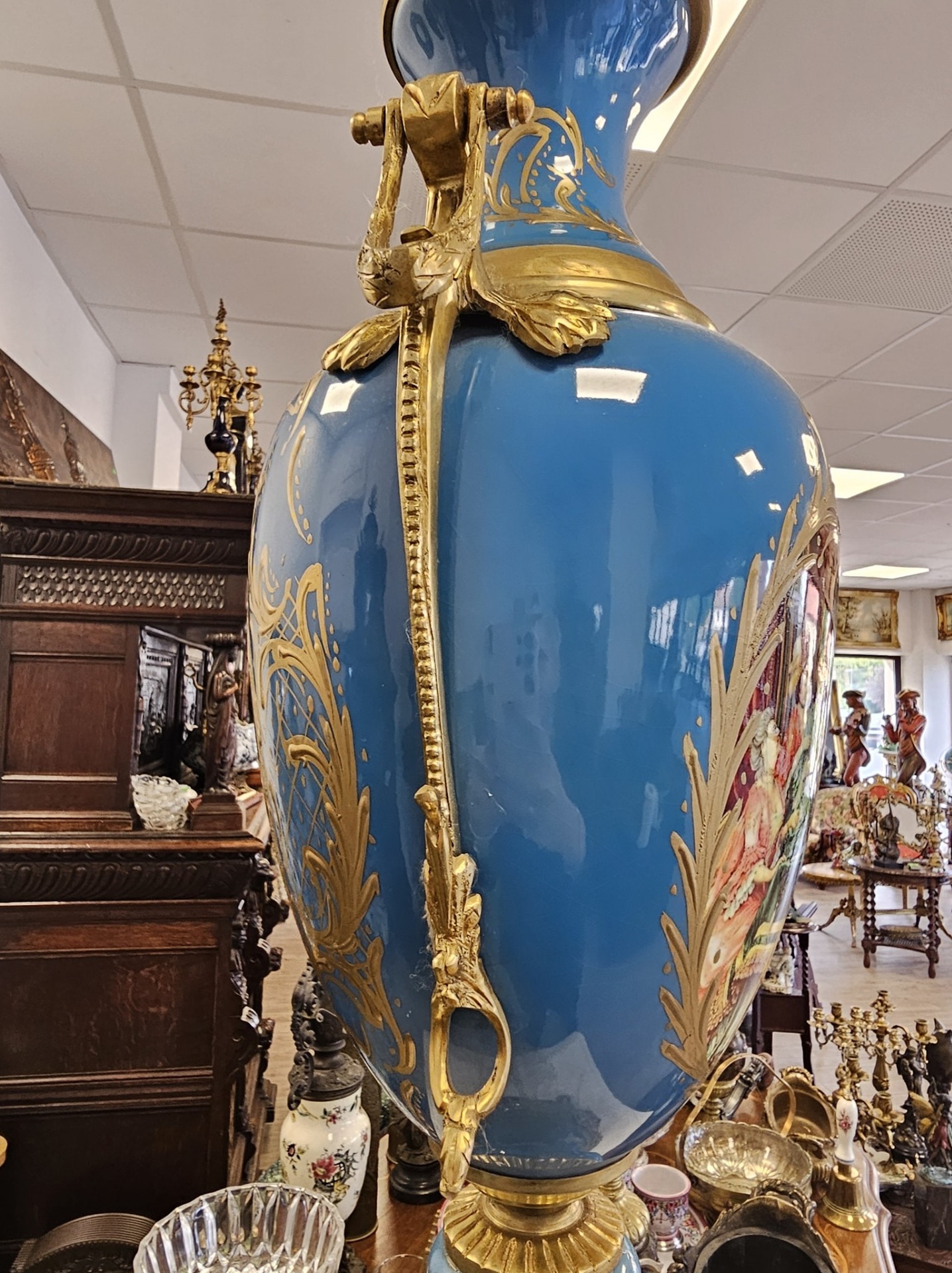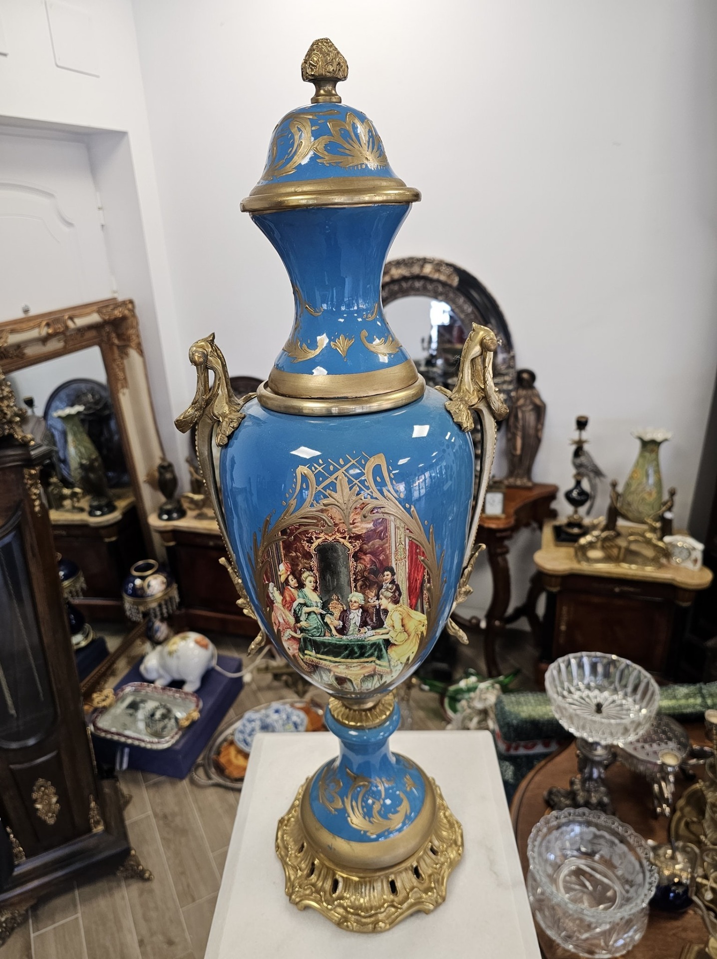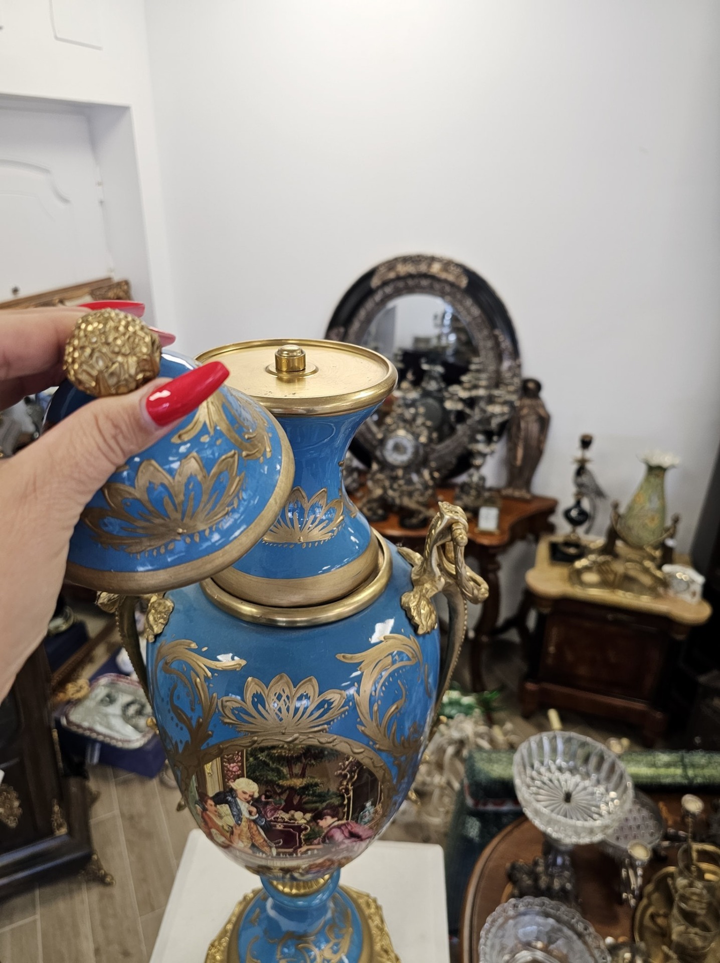 Piesă elegantă și impunătoare, realizată din porțelan fin de culoare albastru , decorată cu scene romantice de salon în stil Rococo, pictate manual cu mare atenție la detalii. Ornamentația aurie aplicată manual adaugă un plus de rafinament și noblețe, iar elementele metalice aurite completează perfect ansamblul.