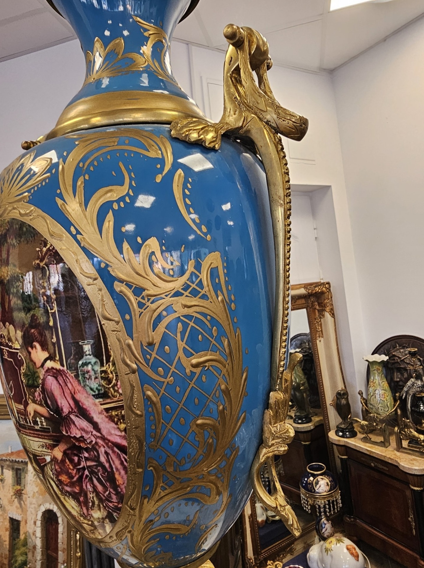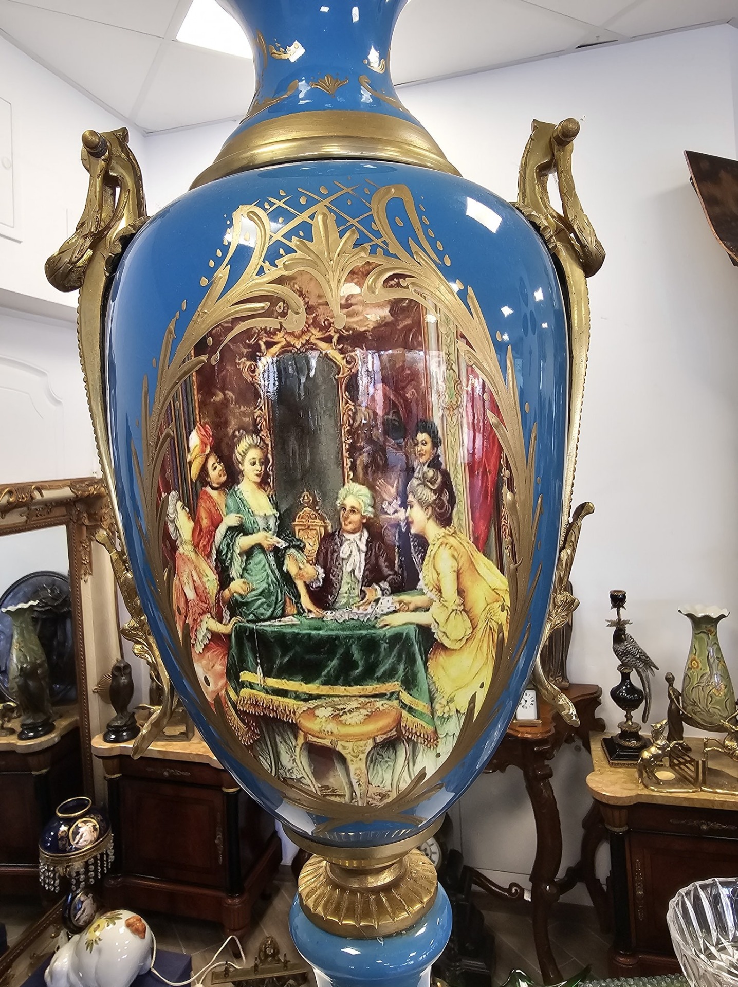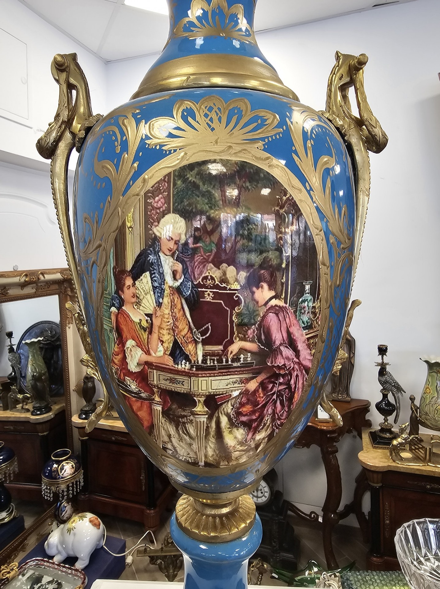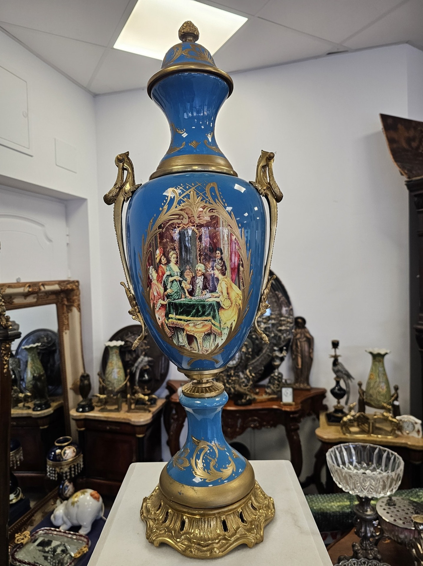 Bazată pe modele clasice franceze de manufactură Sevres, această vază impresionează prin proporțiile armonioase, culorile vii și tematica aristocratică. Ideală pentru colecționari, decoruri clasice sau interioare luxoase.
