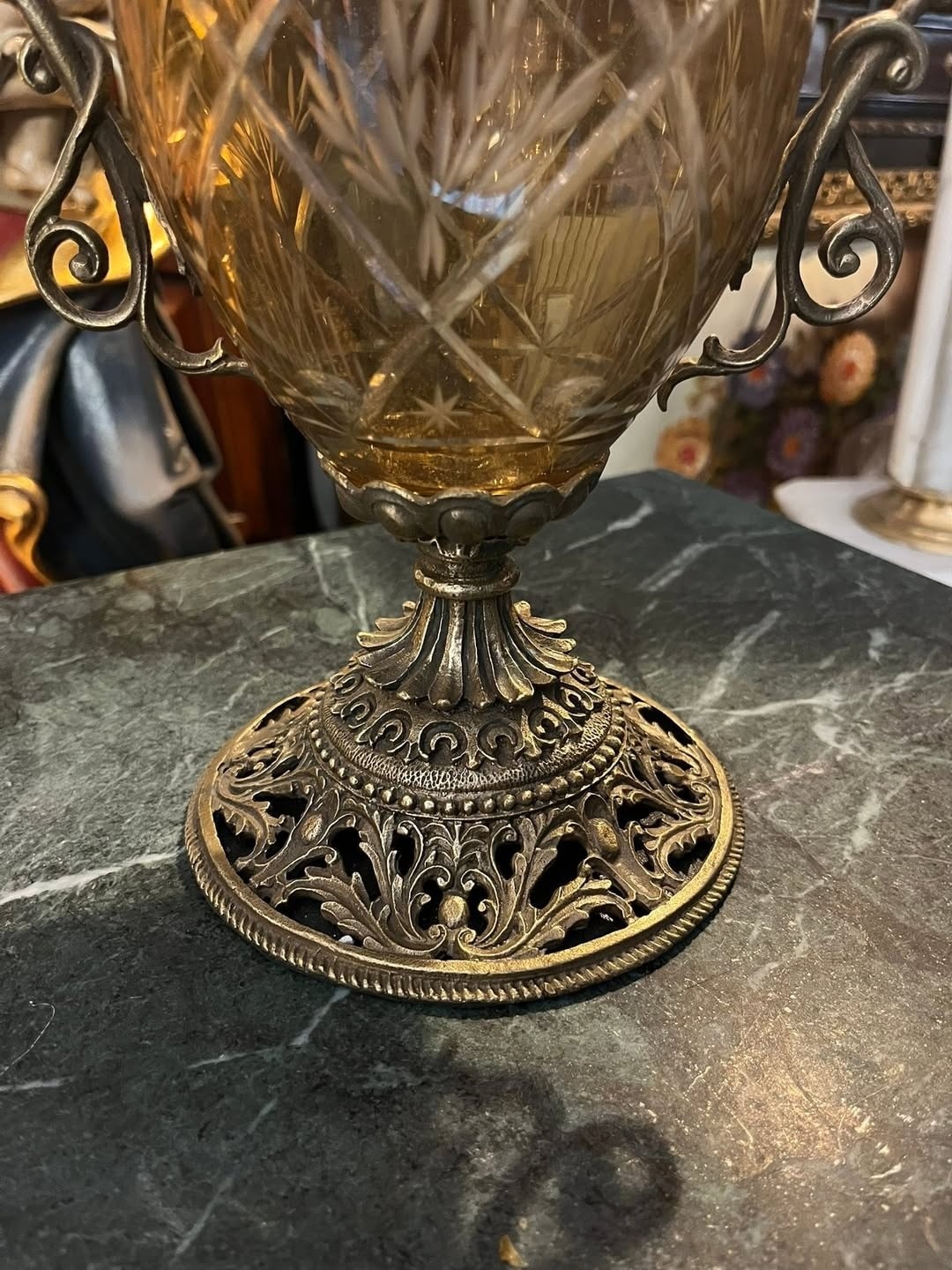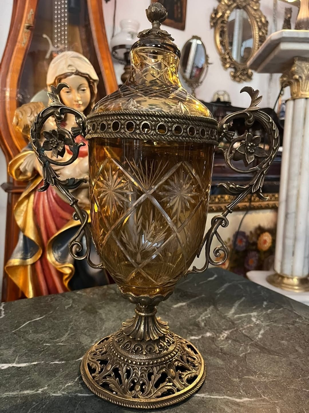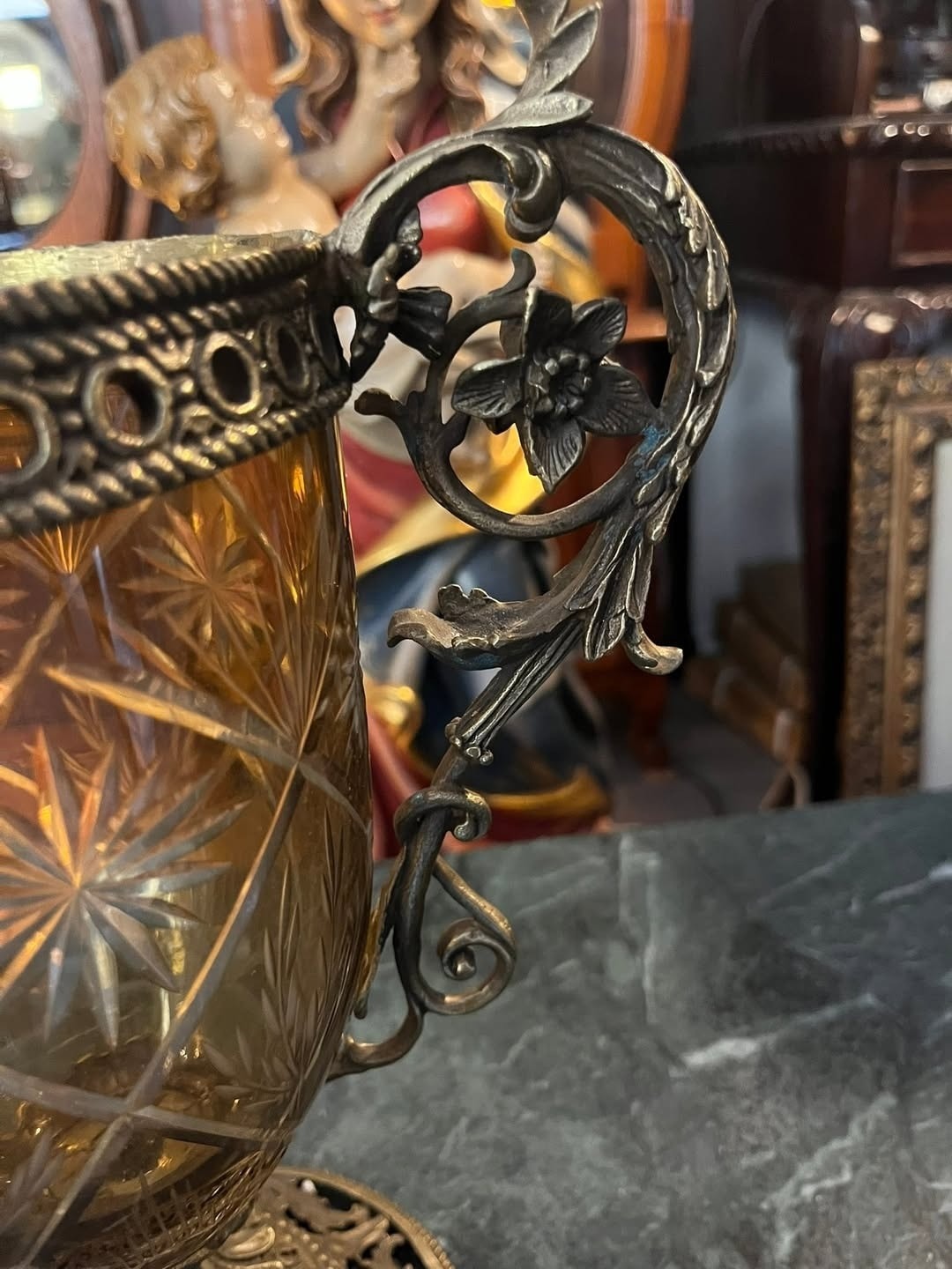 Piesă impunătoare, realizată din cristal tăiat manual de culoare fumuriu-aurie, montată într-o structură solidă din bronz bogat ornamentat, cu detalii florale și mânere elegante în stil baroc. Capacul este decorat cu un motiv floral superb, completând armonios designul rafinat.
