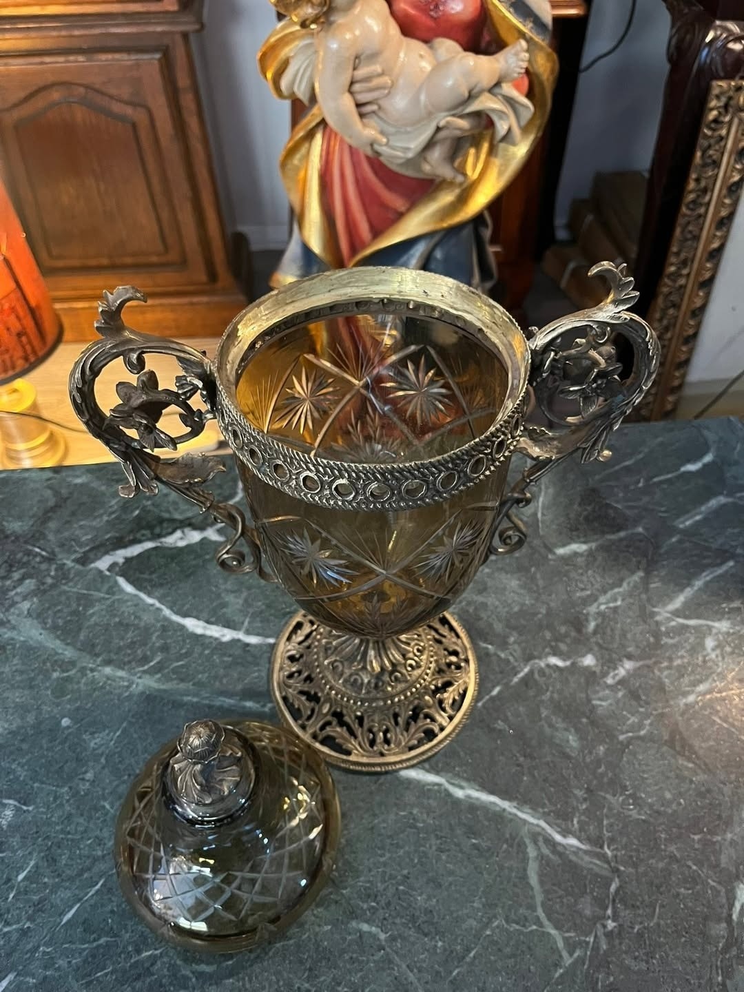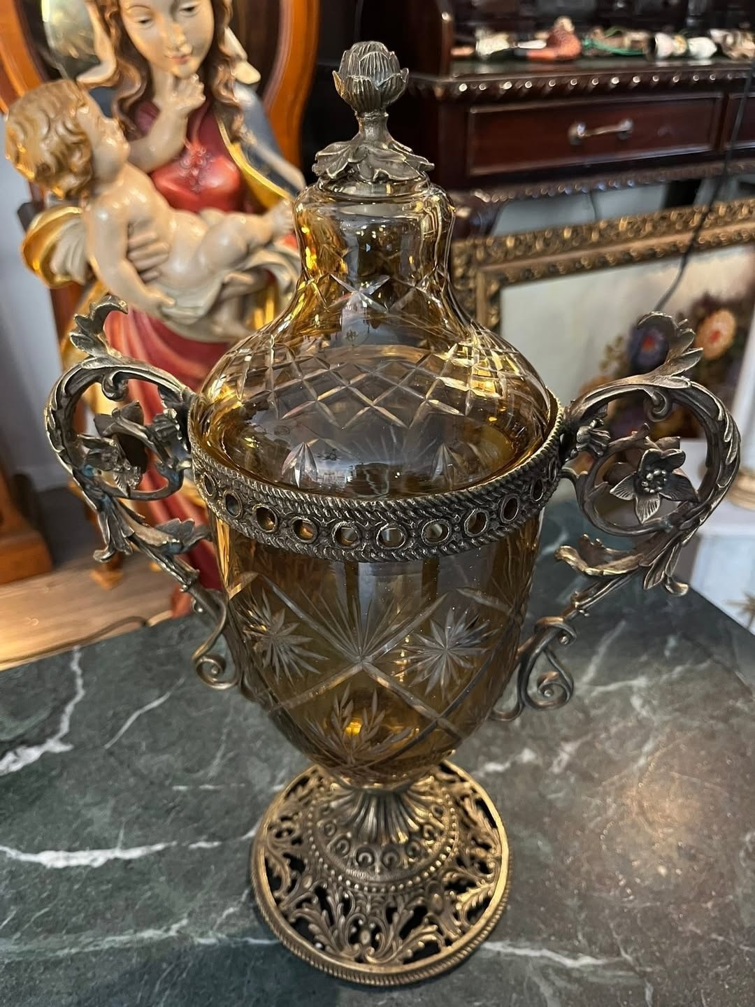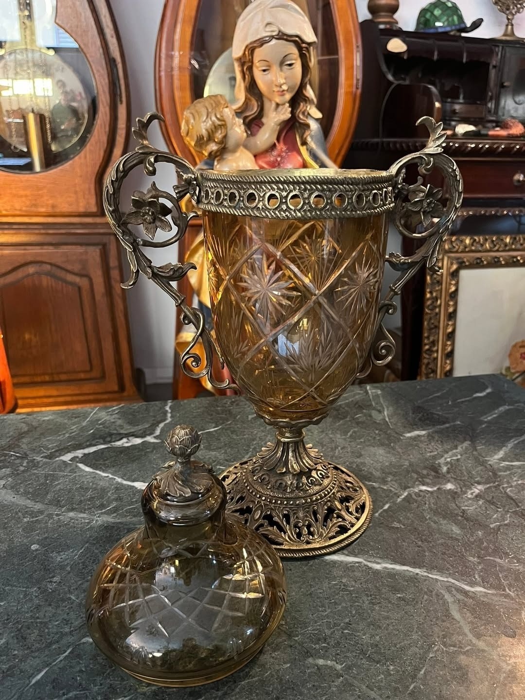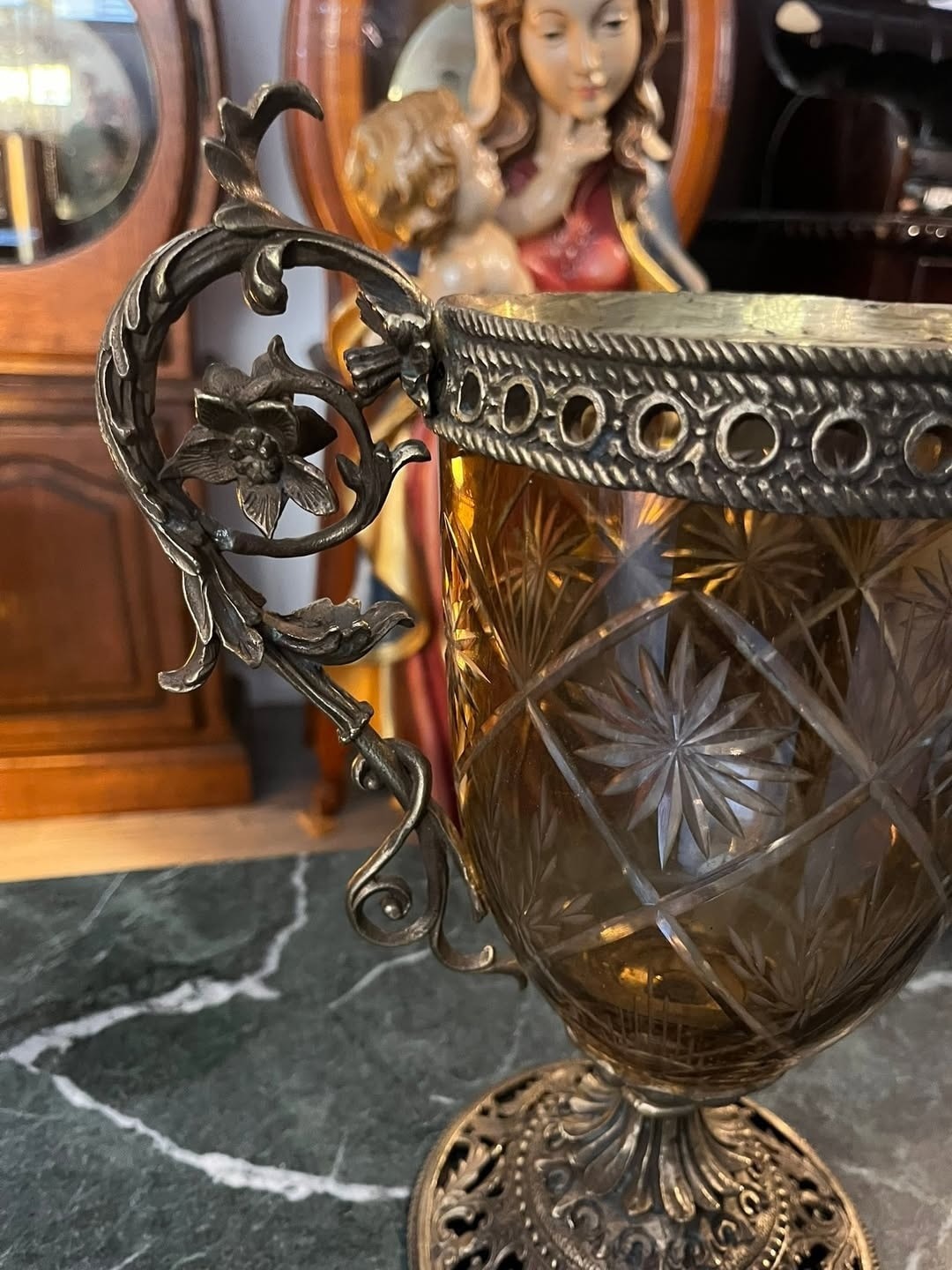Piesă impunătoare, realizată din cristal tăiat manual de culoare fumuriu-aurie, montată într-o structură solidă din bronz bogat ornamentat, cu detalii florale și mânere elegante în stil baroc. Capacul este decorat cu un motiv floral superb, completând armonios designul rafinat.