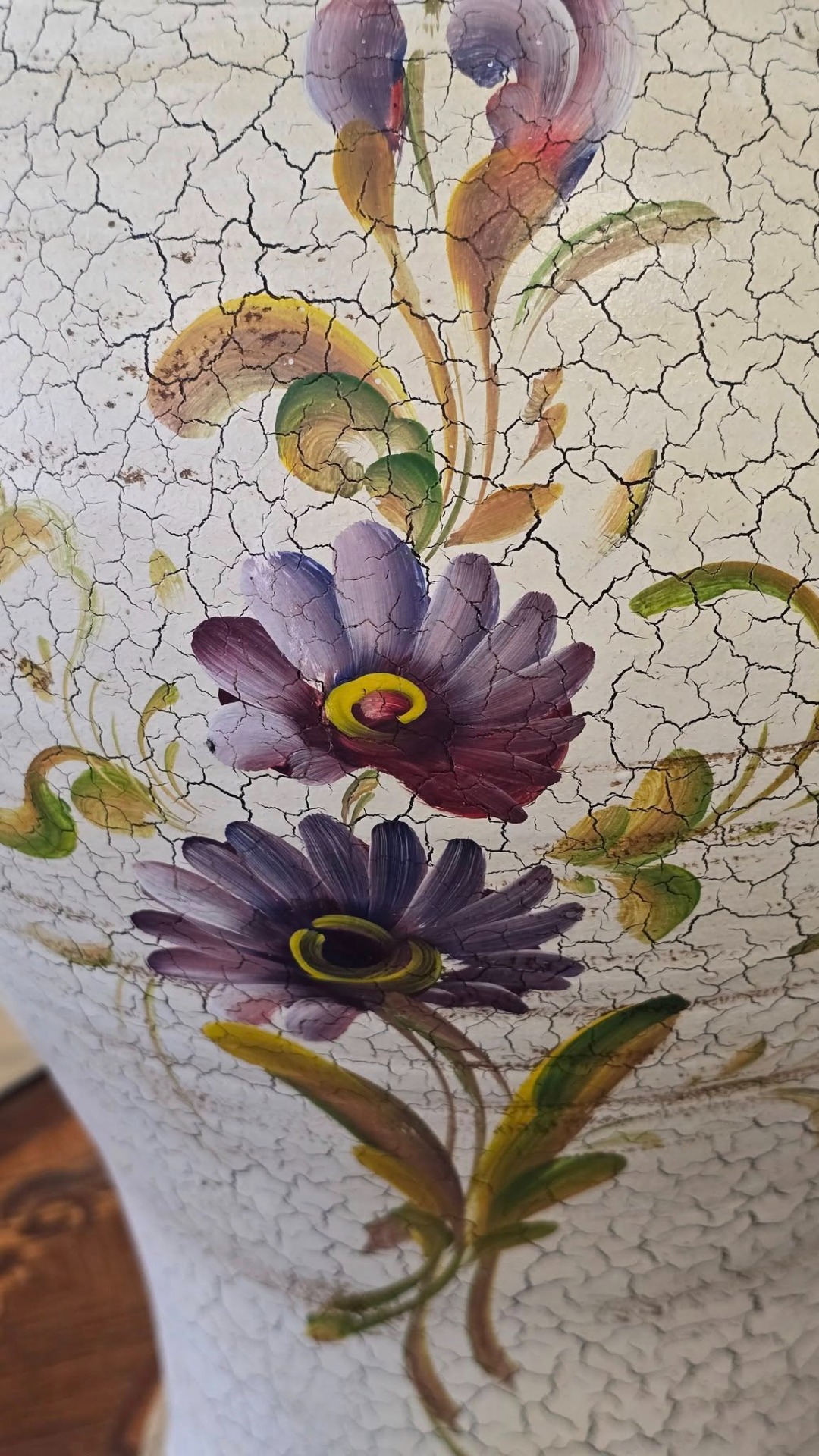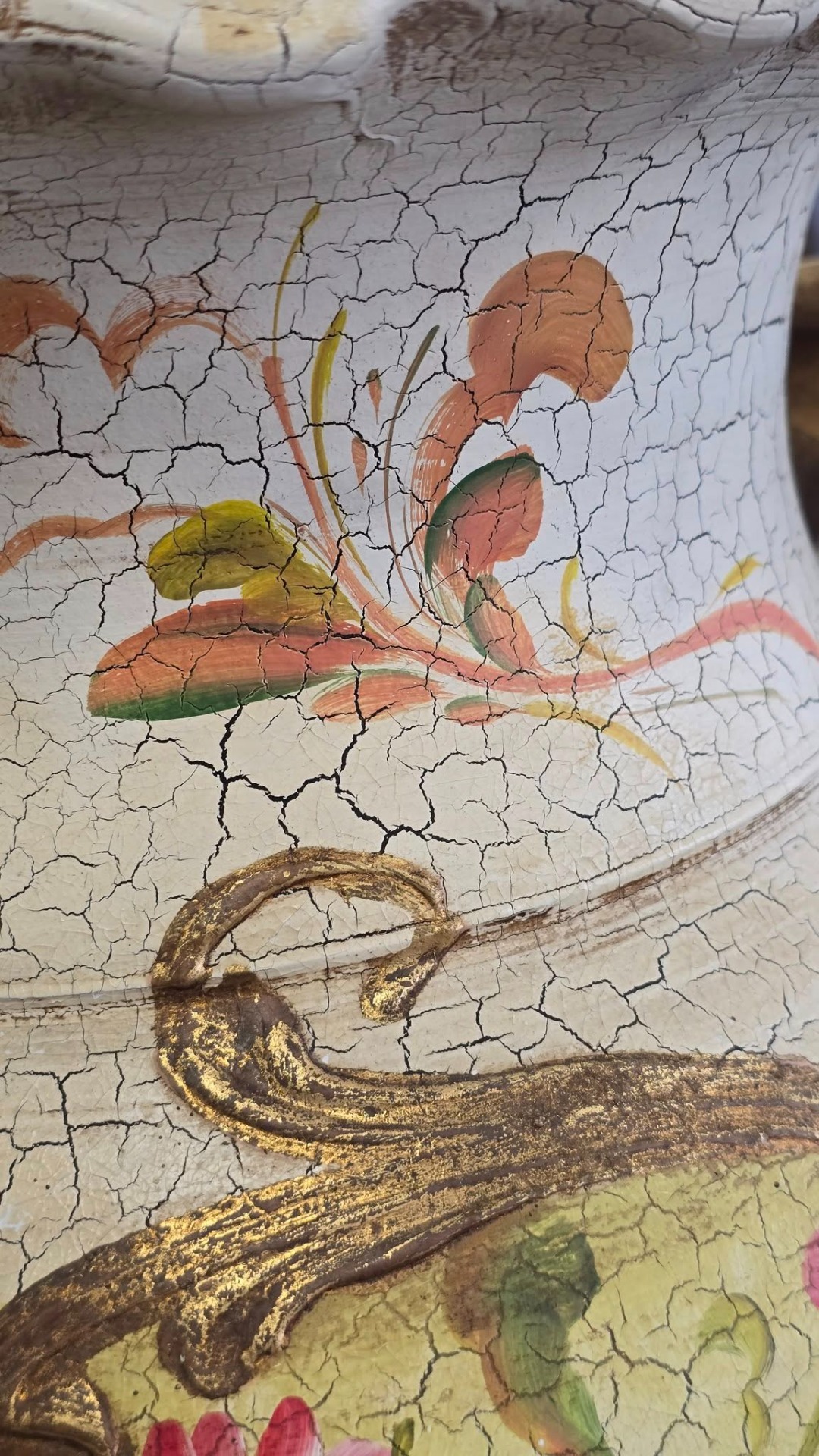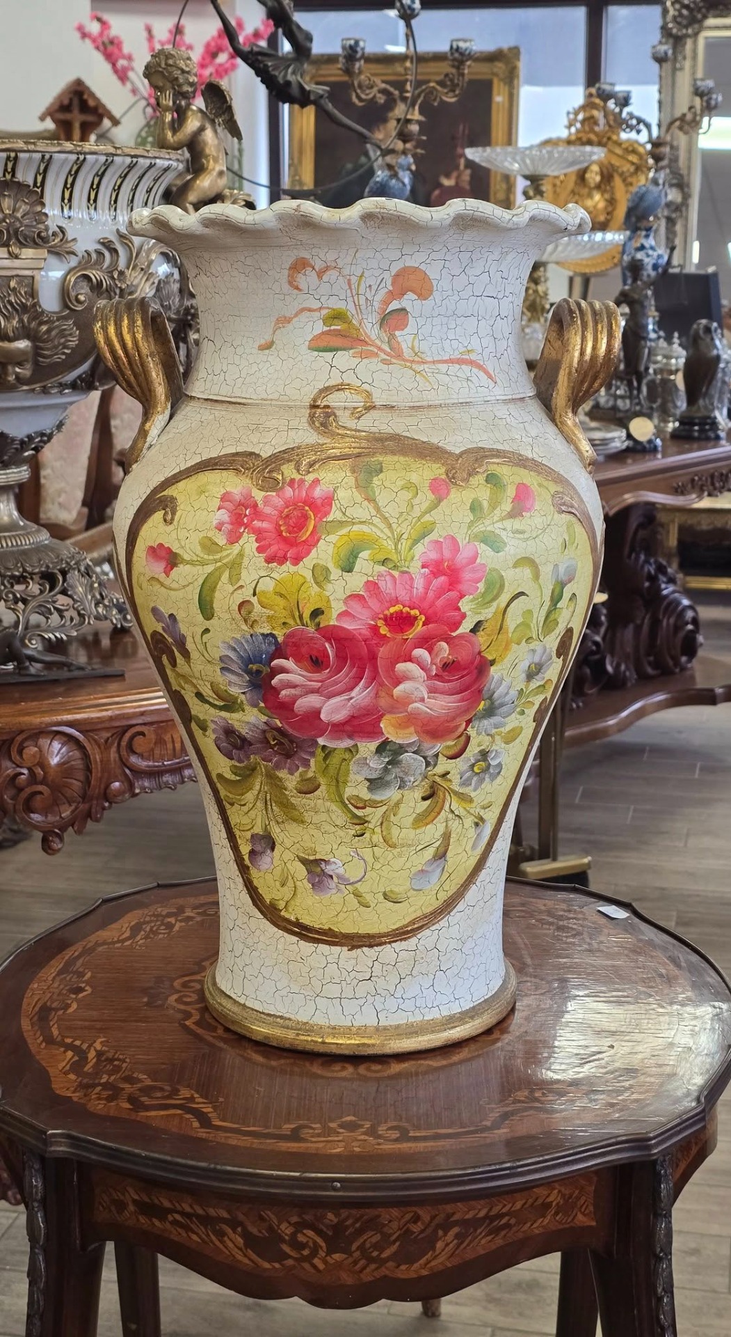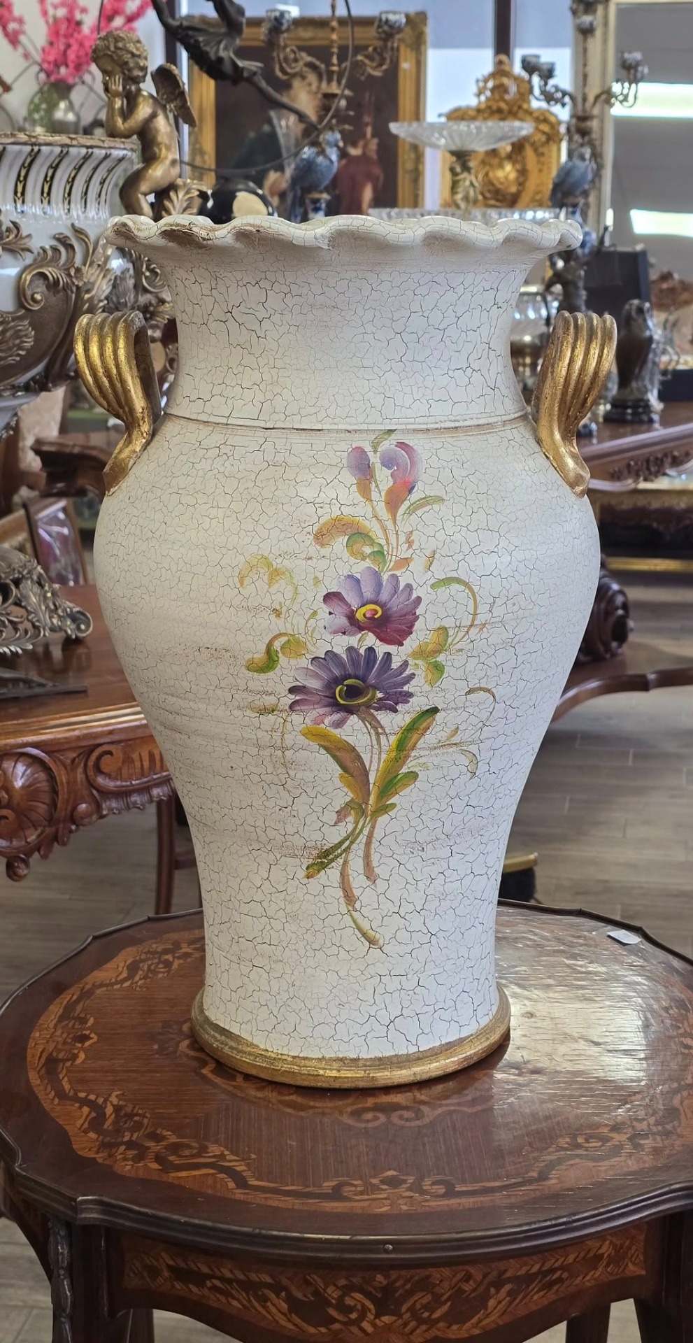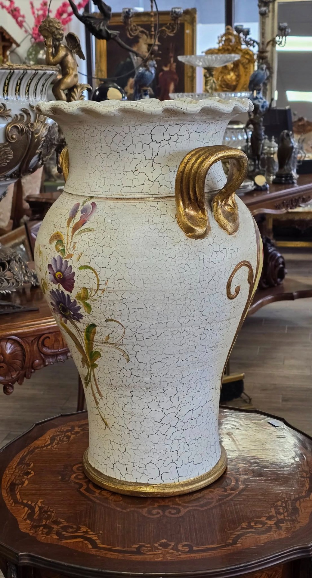 Vază din ceramică de tip amforă, design "Shabby Chic", cu finisaj "craquelure" (aspect de crăpături fine), formă clasică cu buza ondulată și toarte laterale