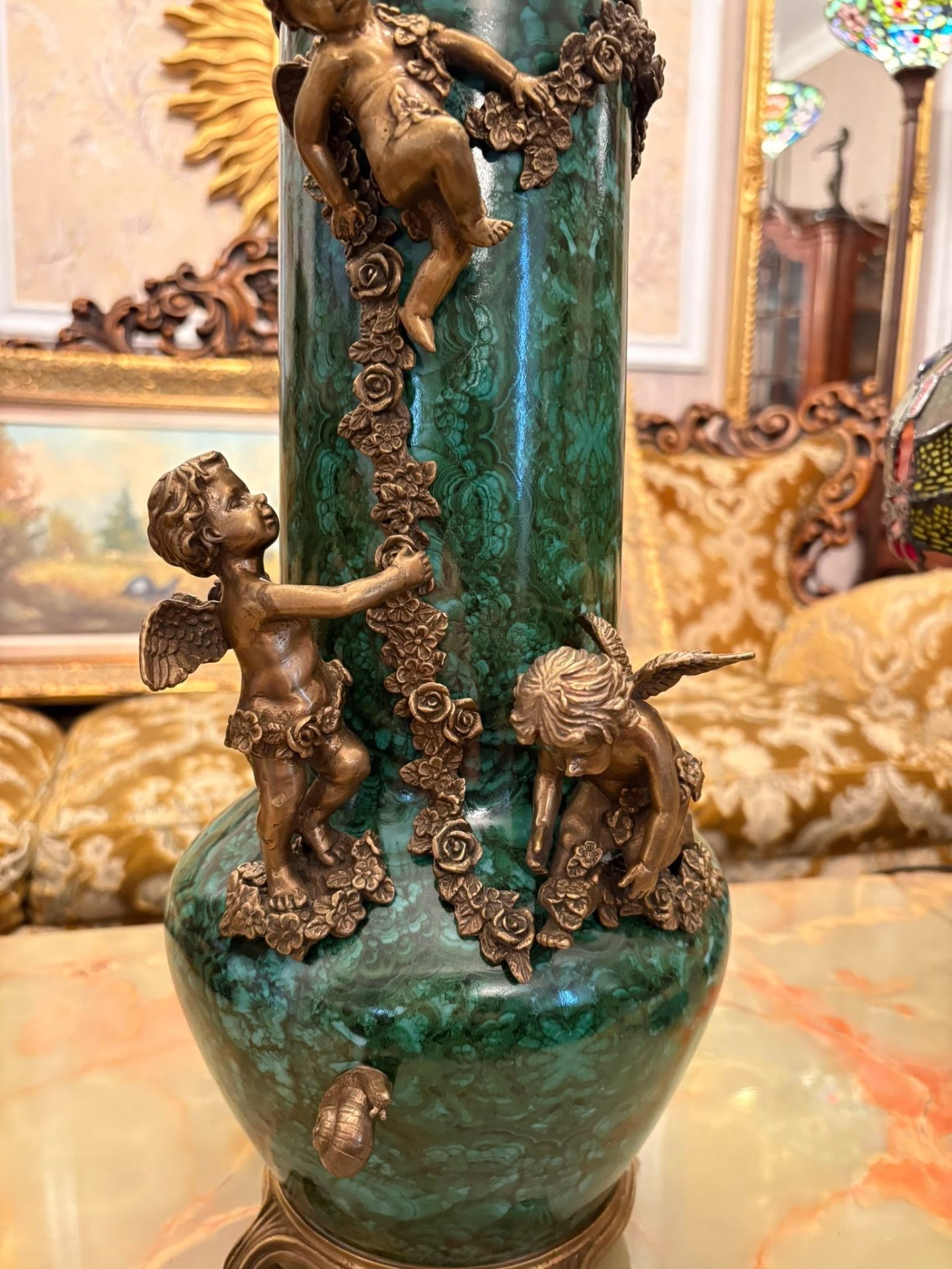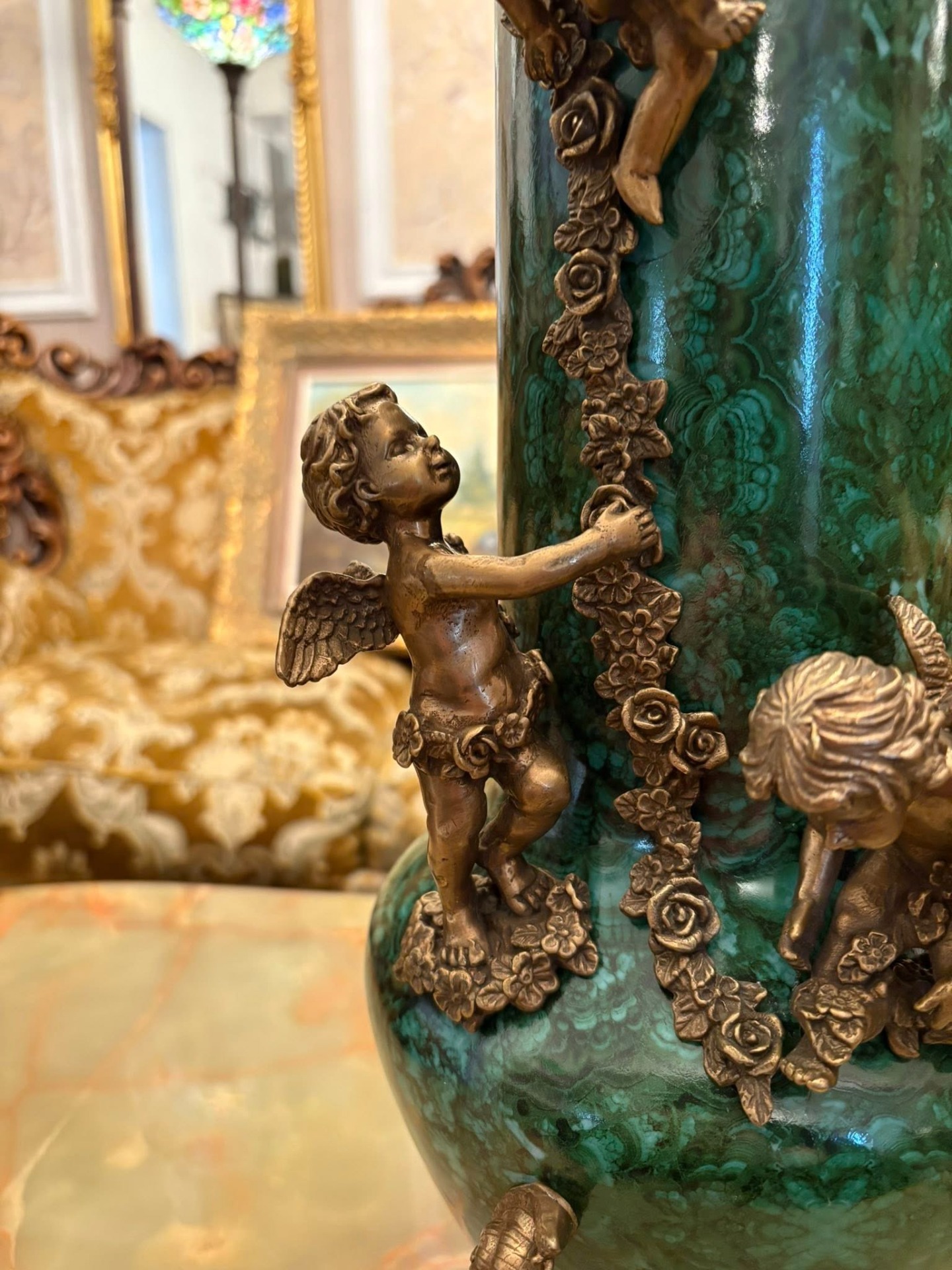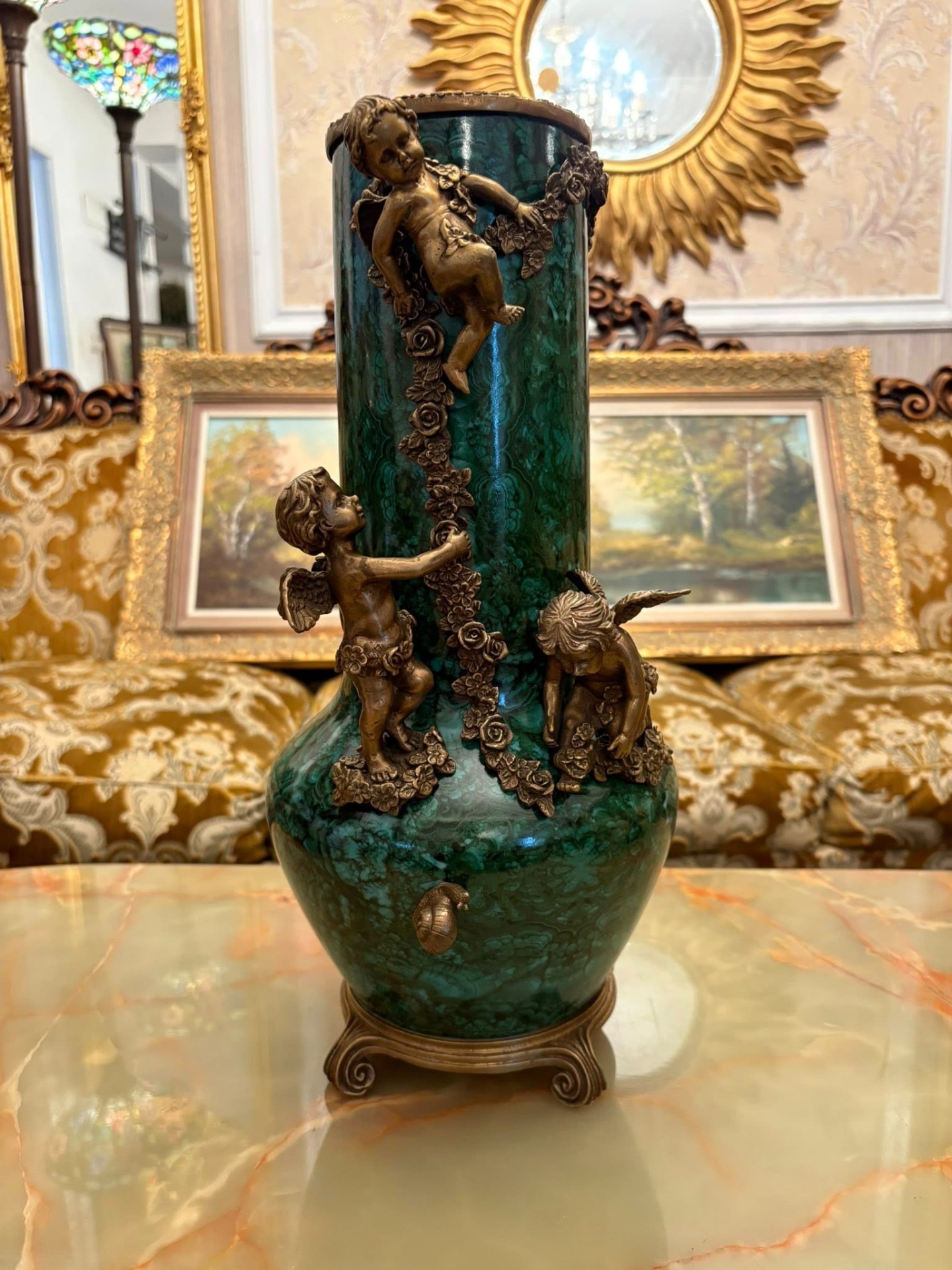 Vază din porțelan cu decorațiuni din bronz, ornamentată cu îngerași și ghirlande florale.