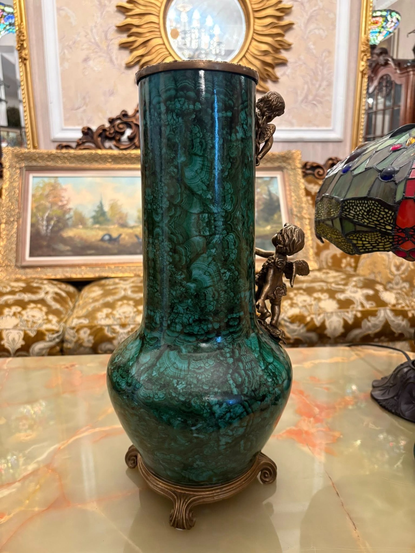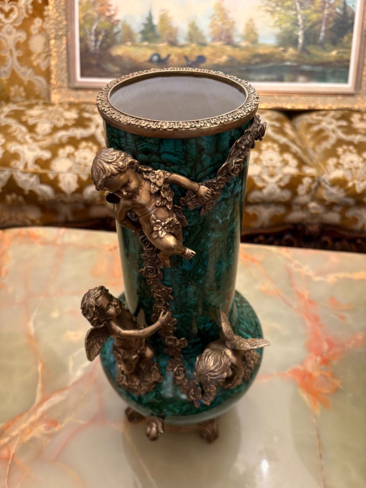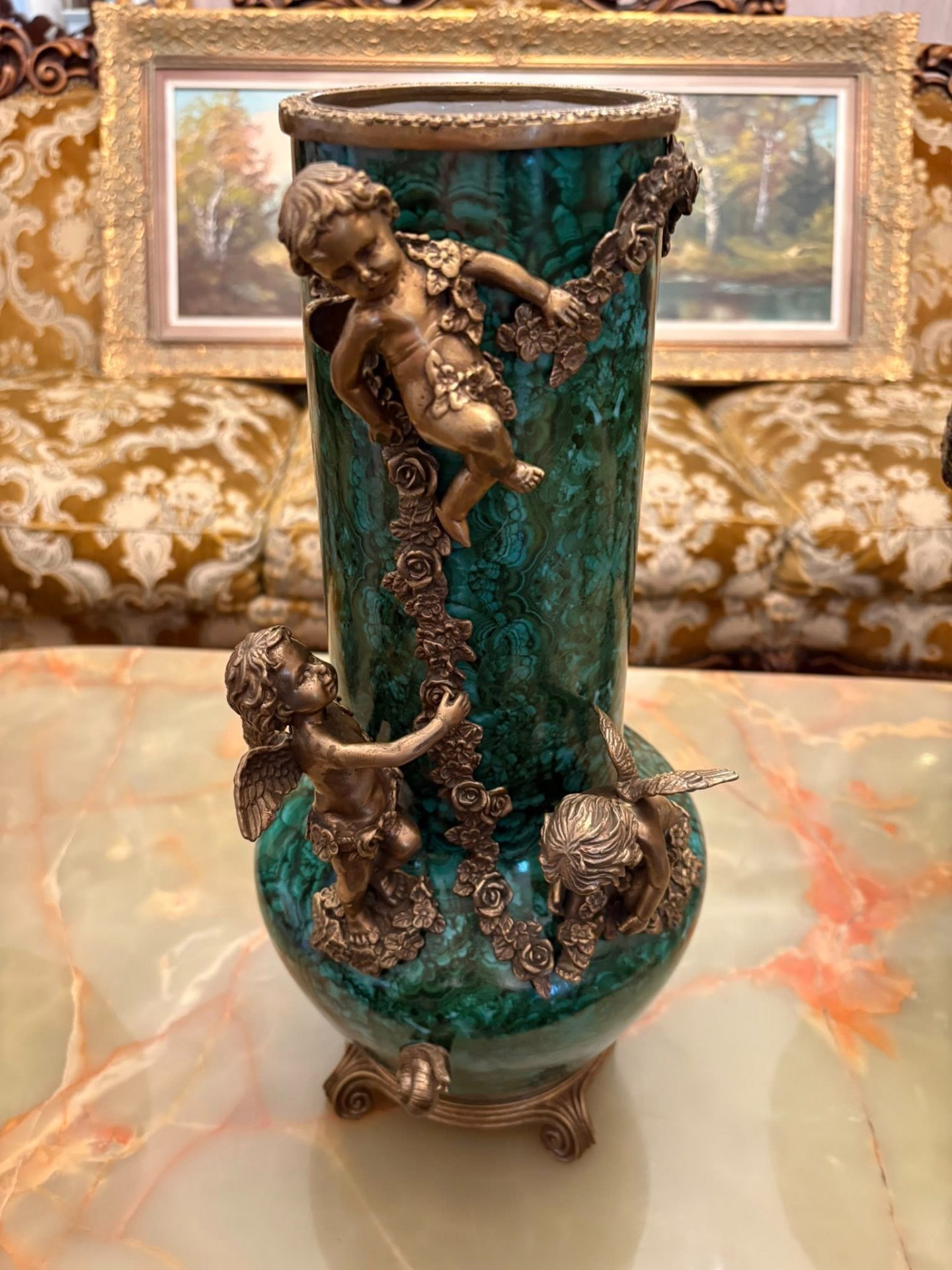 Vază din porțelan cu decorațiuni din bronz, ornamentată cu îngerași și ghirlande florale.