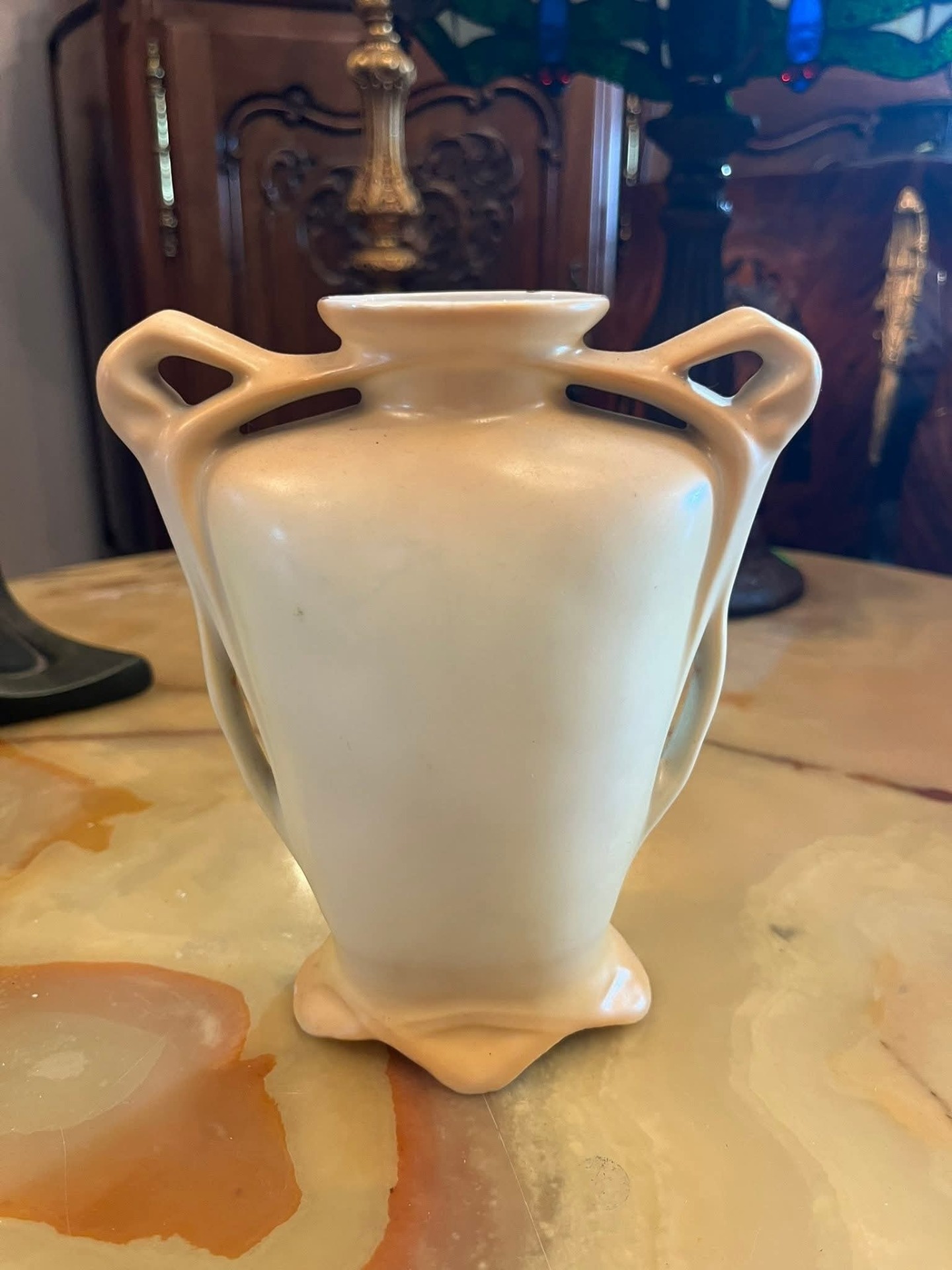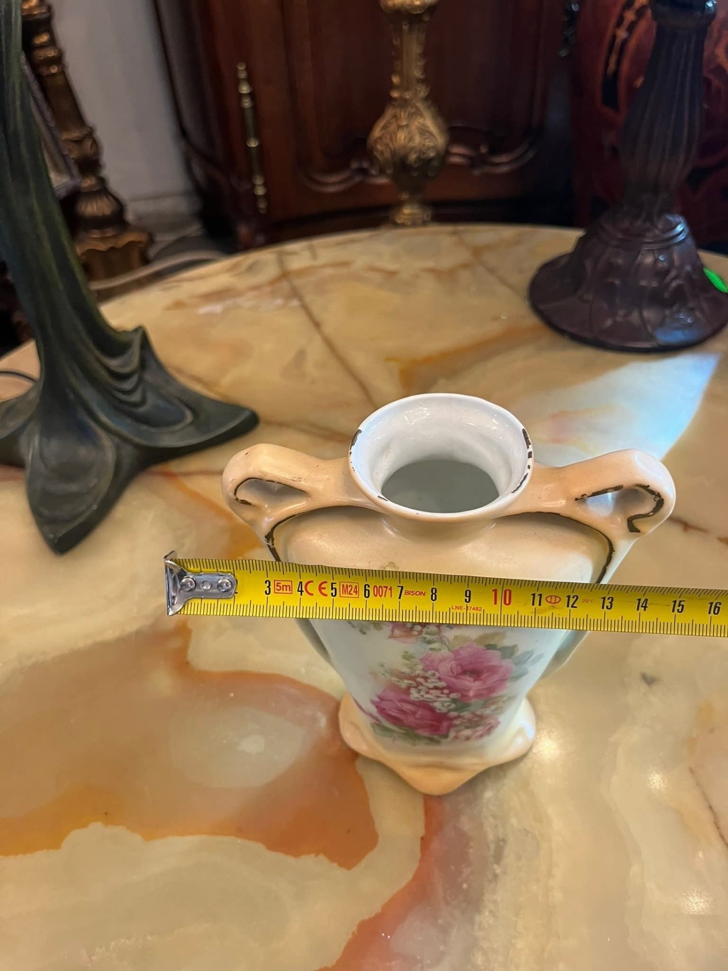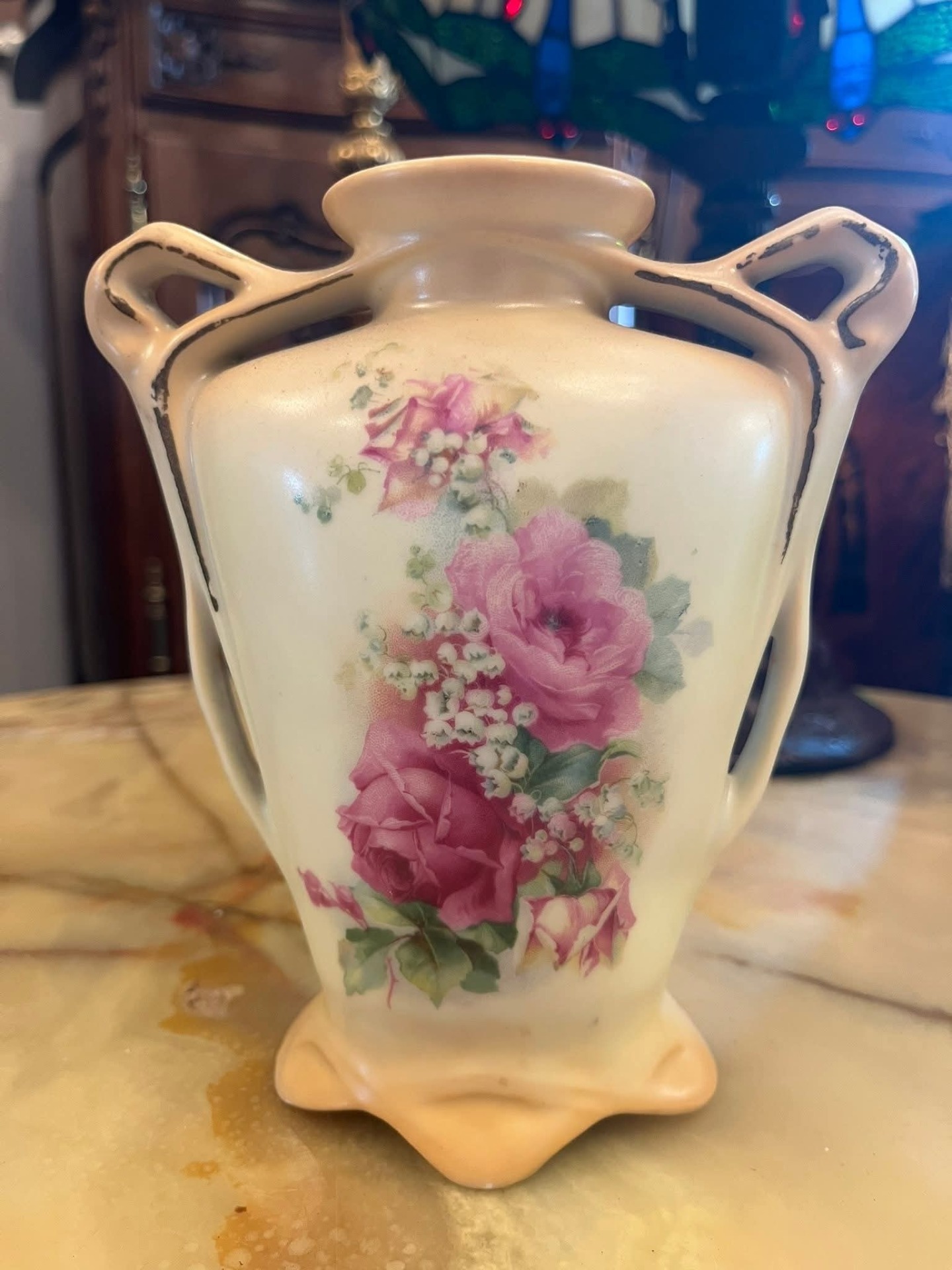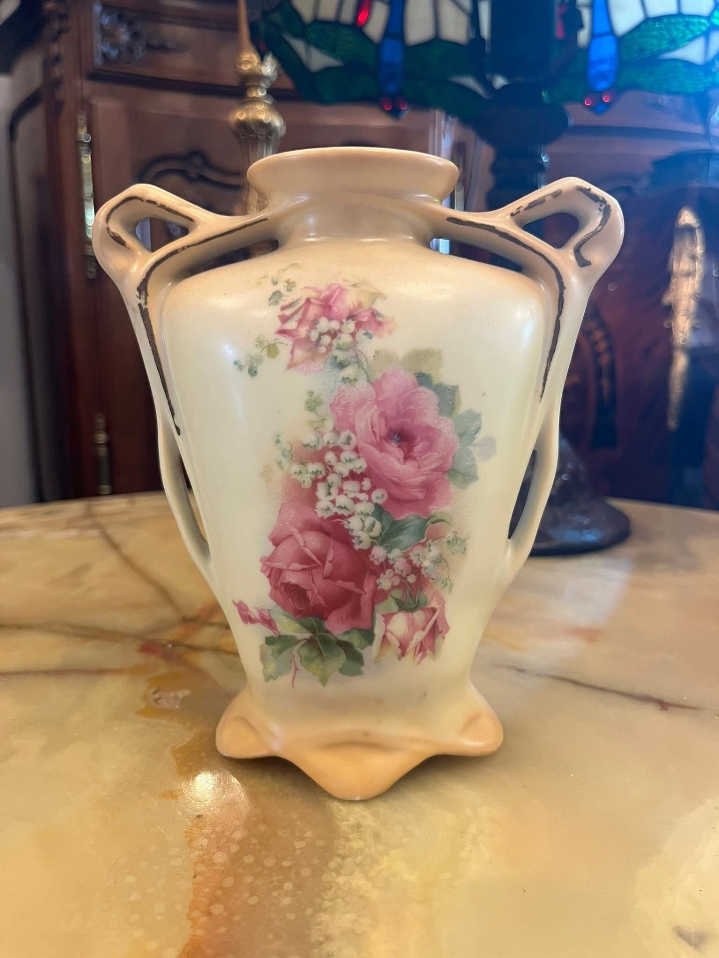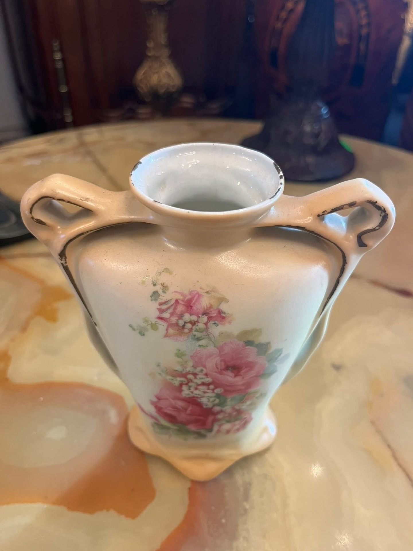 Vază din porțelan fin, cu decor floral delicat în nuanțe de roz (trandafiri și flori de câmp), realizată în stil clasic. Are două toarte laterale elegante și bază profilată, oferind un aspect rafinat și romantic.