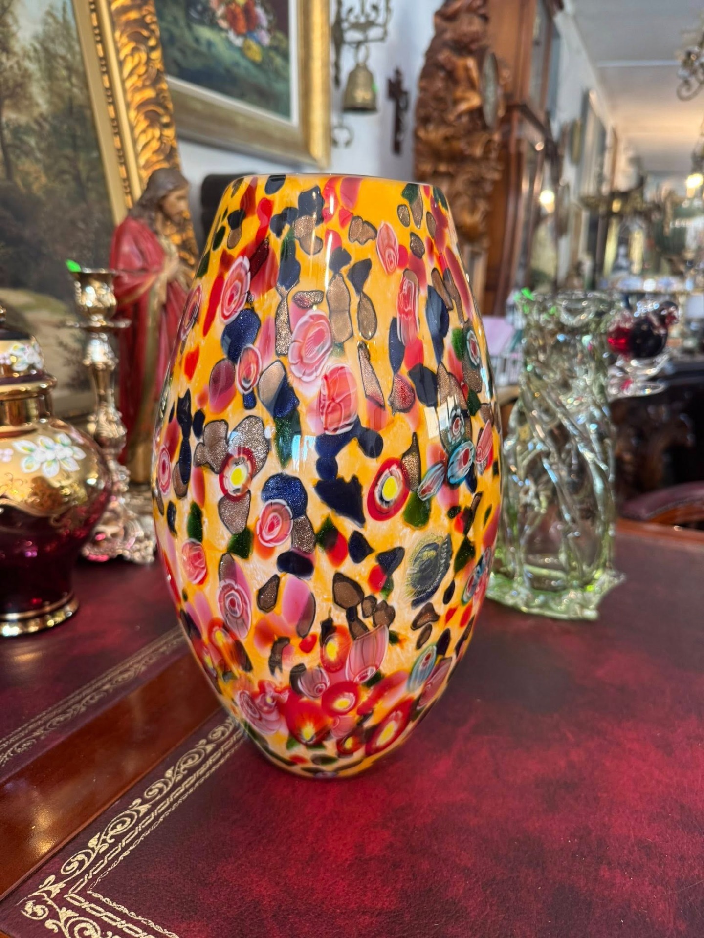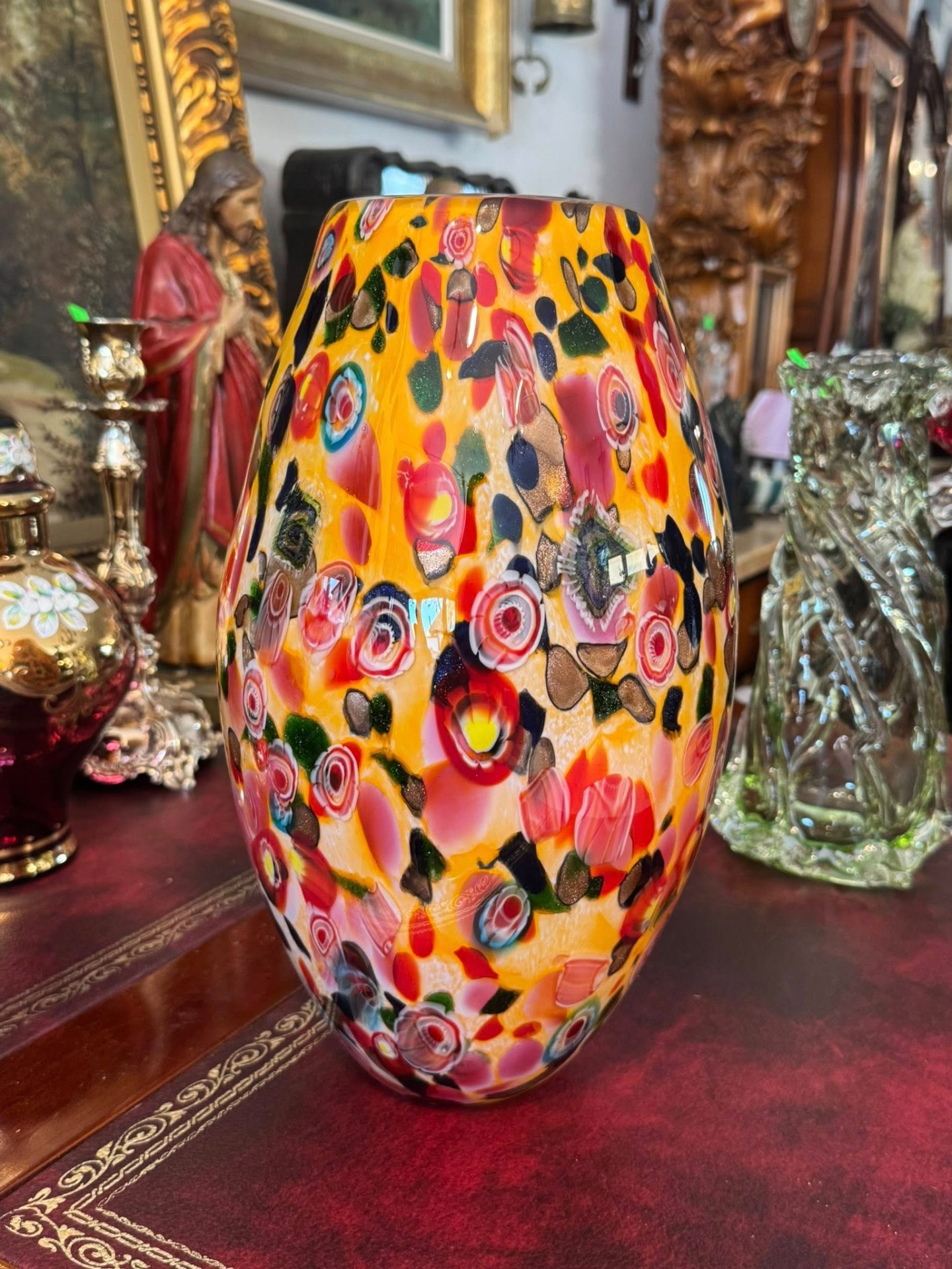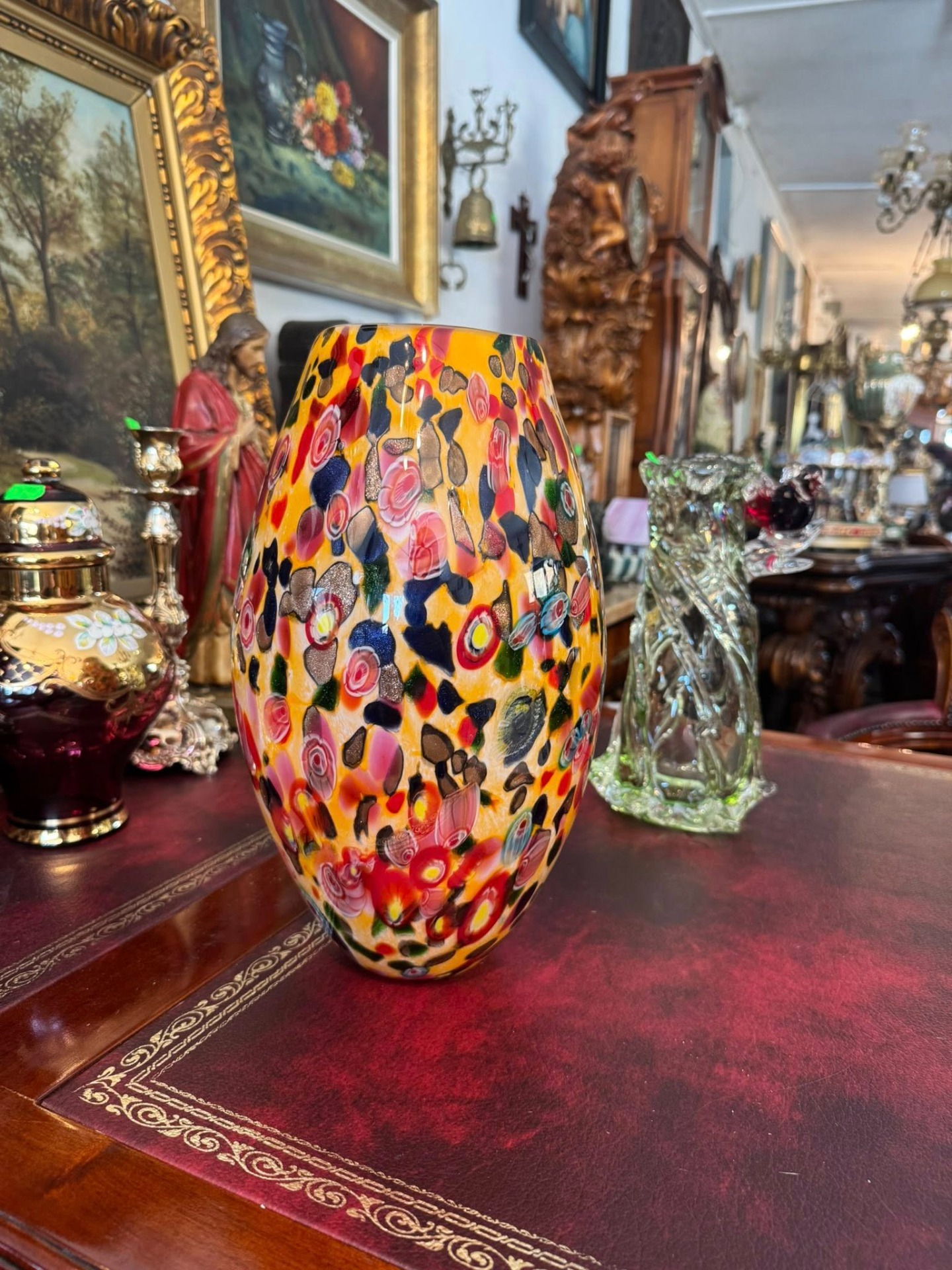 Vază din sticlă artistică, o piesă vibrantă și complexă, realizată în stil Murano.