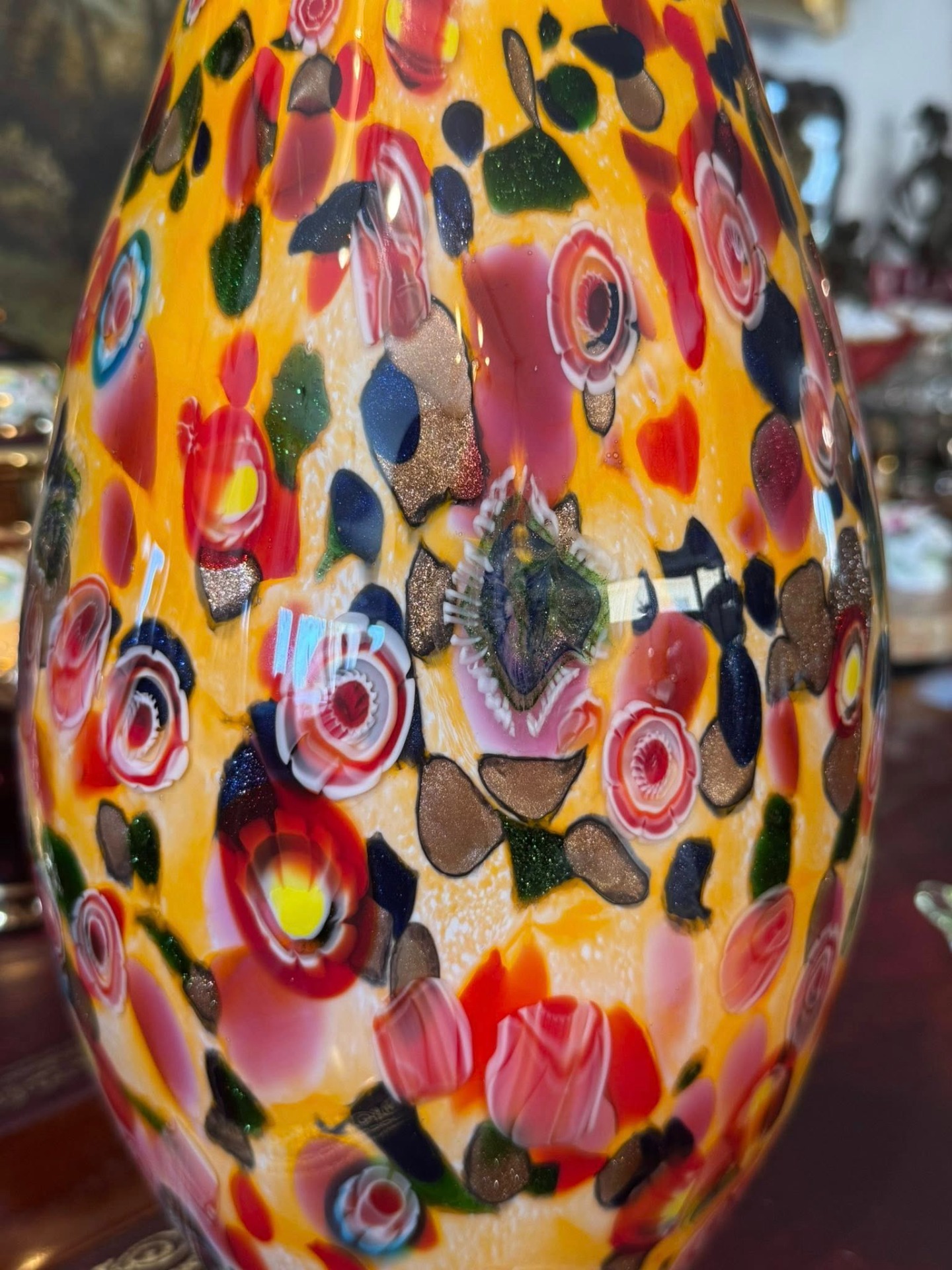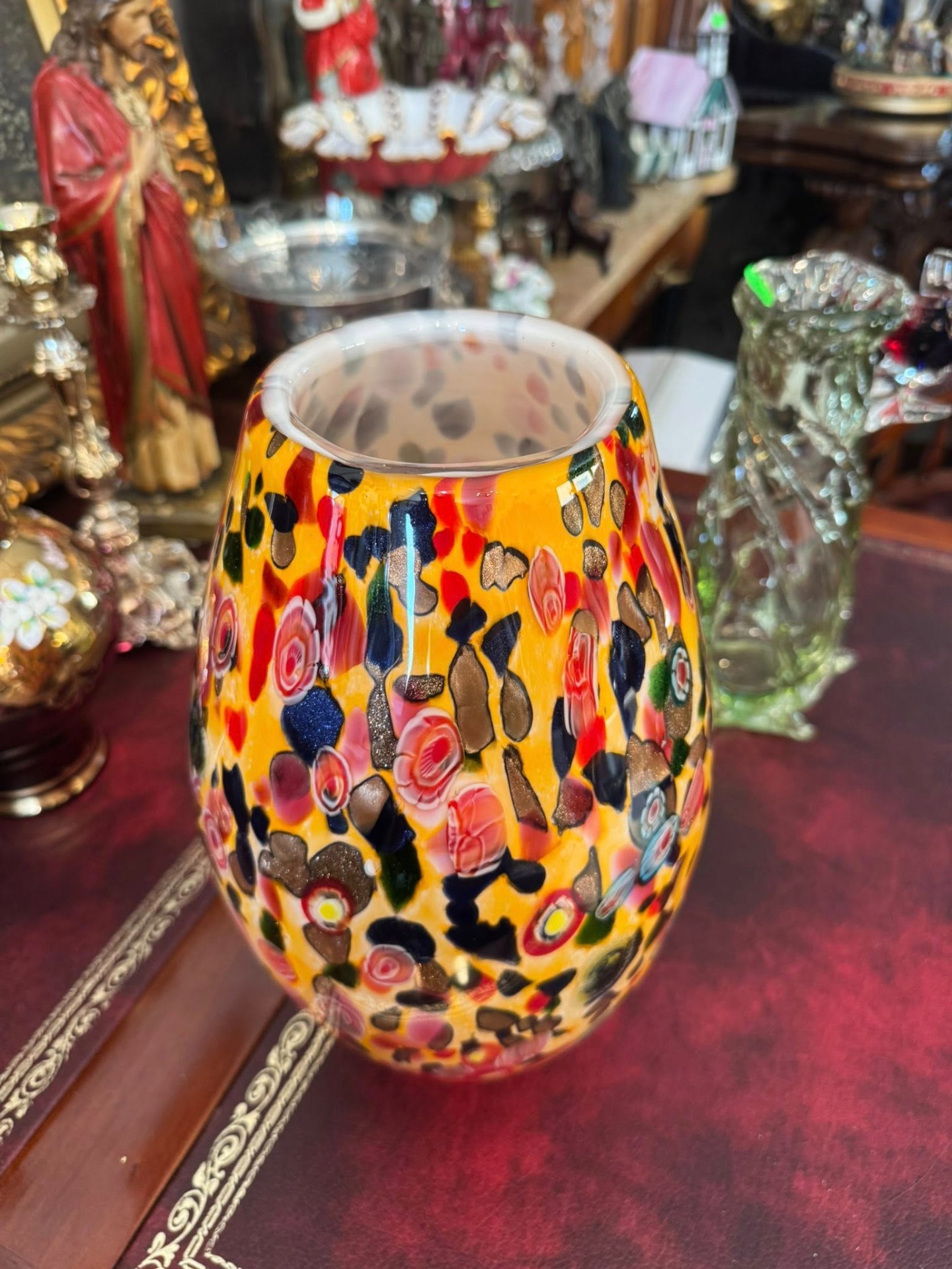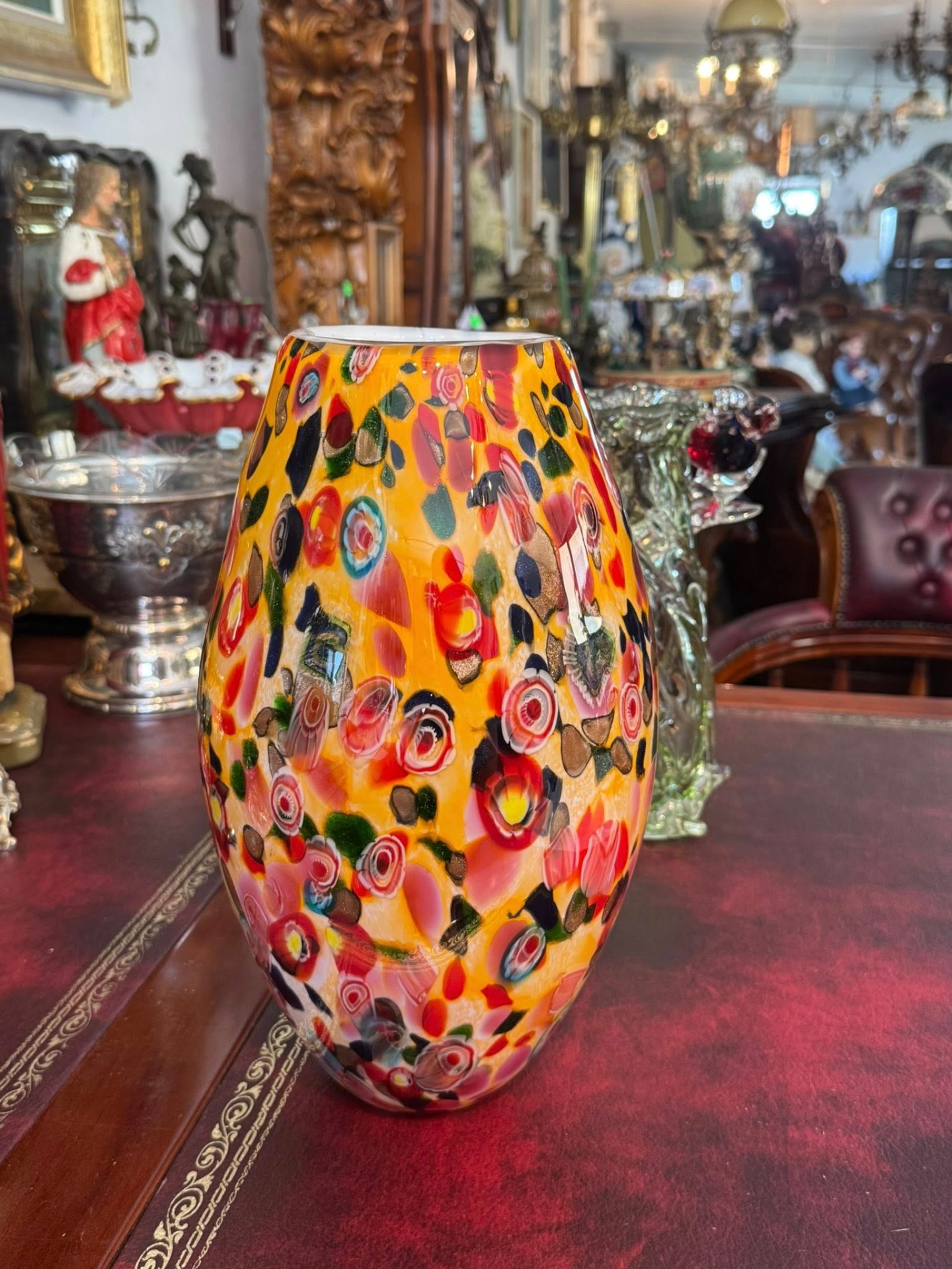 Vază din sticlă artistică, o piesă vibrantă și complexă, realizată în stil Murano.
