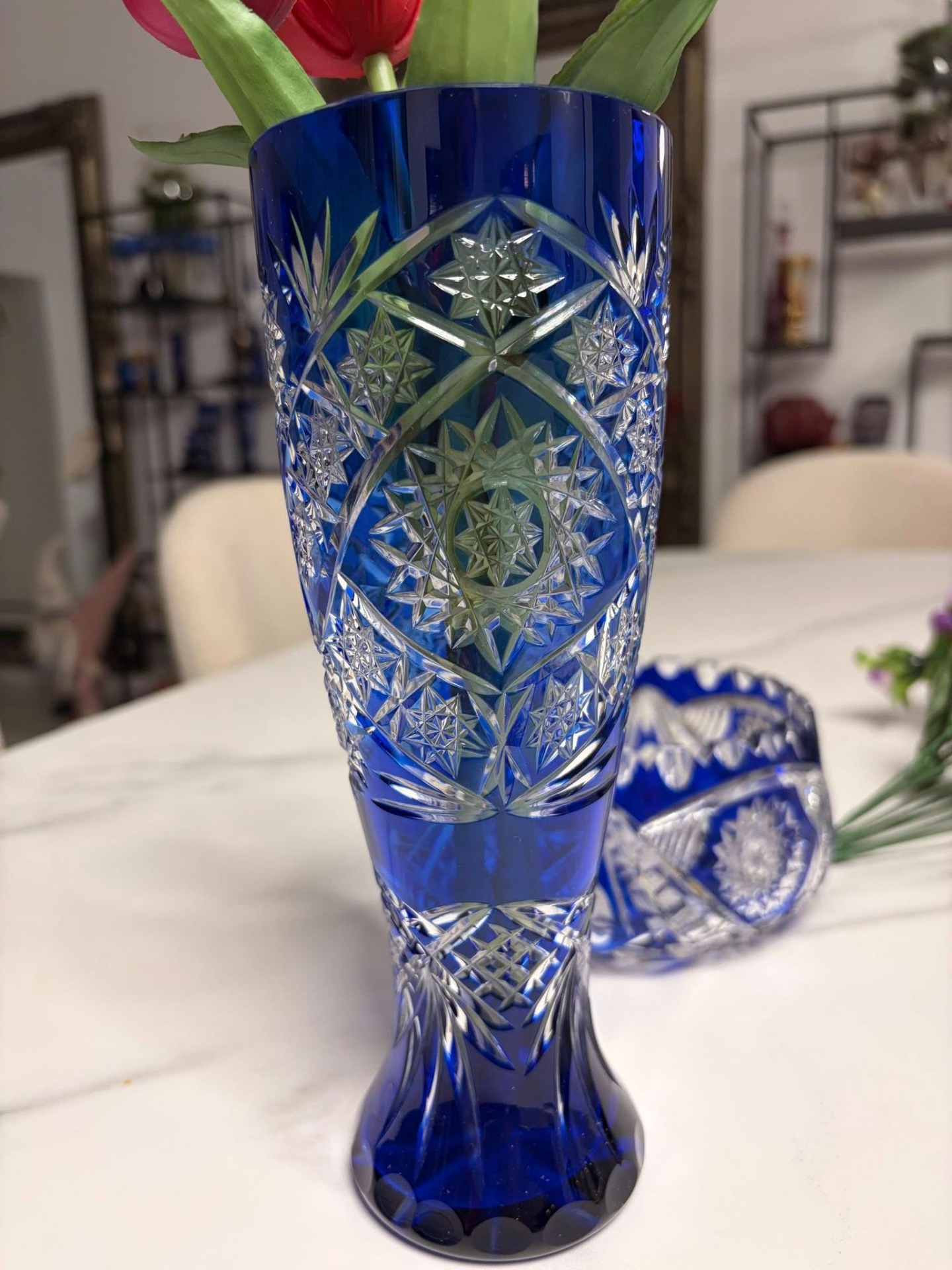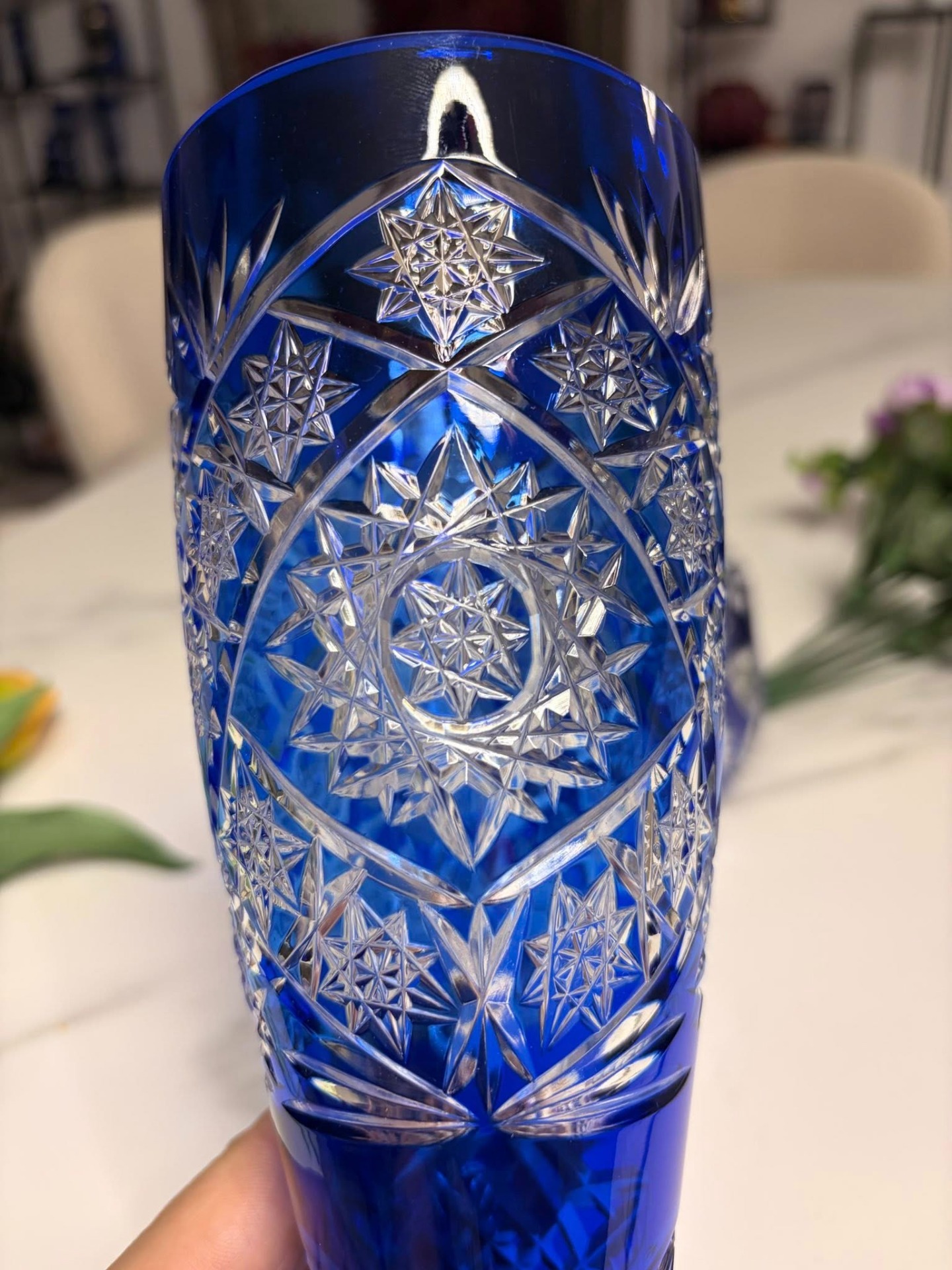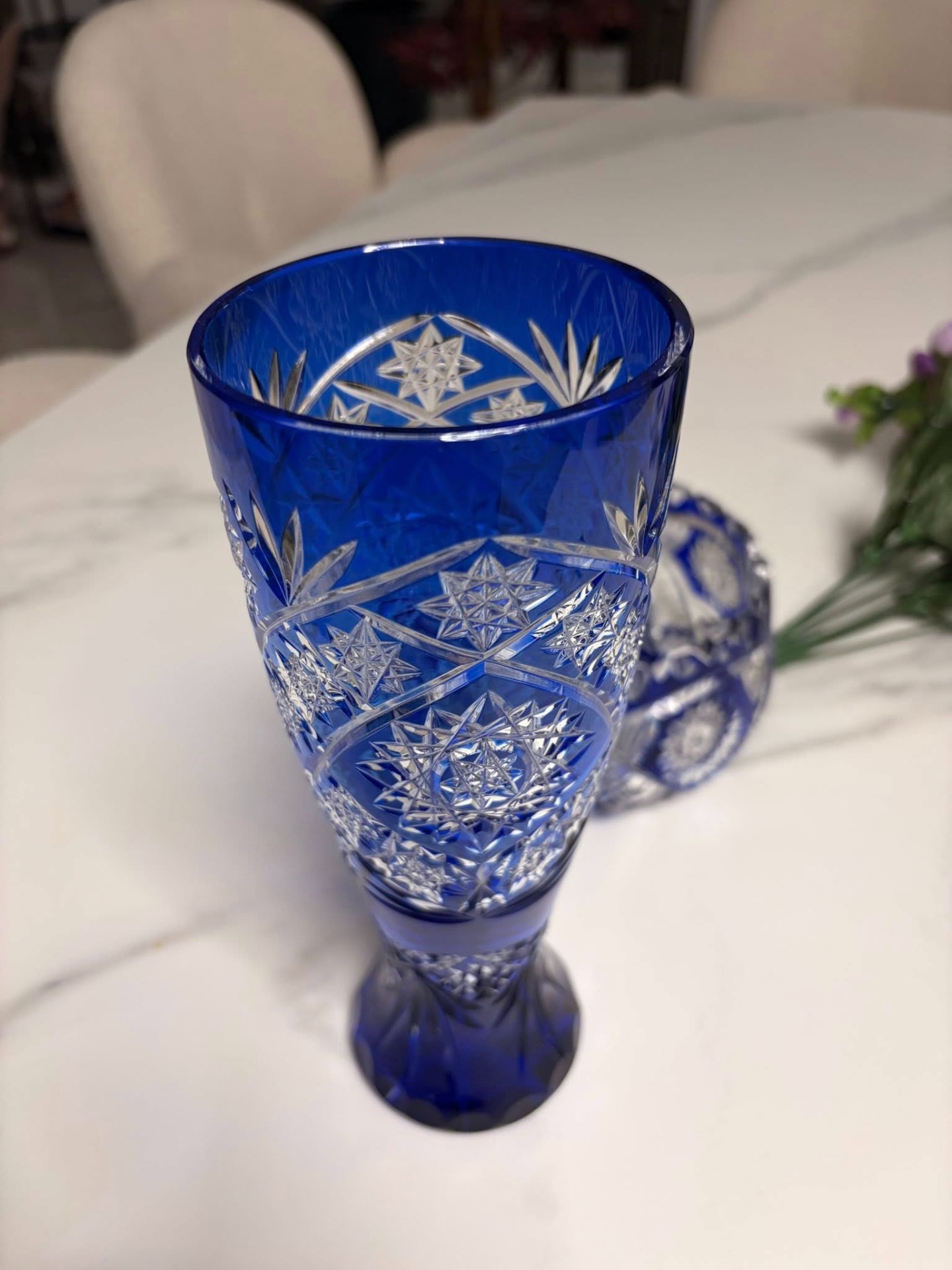 Vază elegantă din cristal masiv, realizată din cristal albastru cobalt intens, cu tăieturi manuale fine și motive stelare/geometrice clasice. Fațetele adânci pun