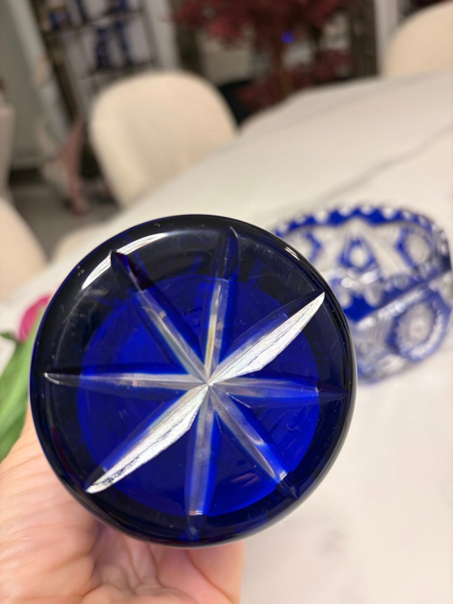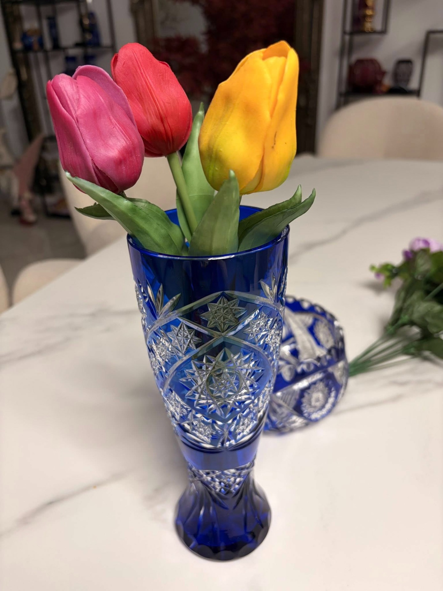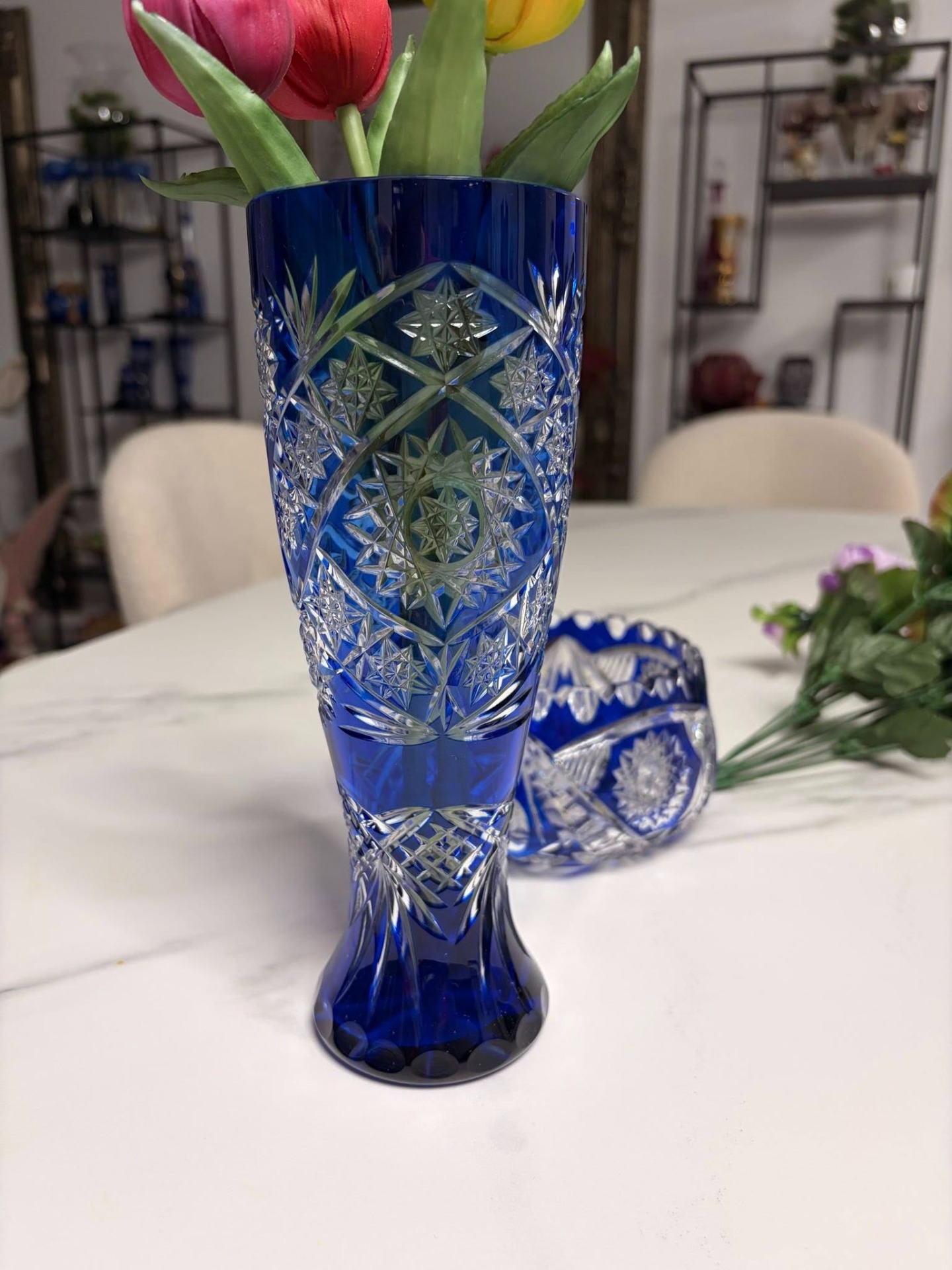 Vază elegantă din cristal masiv, realizată din cristal albastru cobalt intens, cu tăieturi manuale fine și motive stelare/geometrice clasice. Fațetele adânci pun