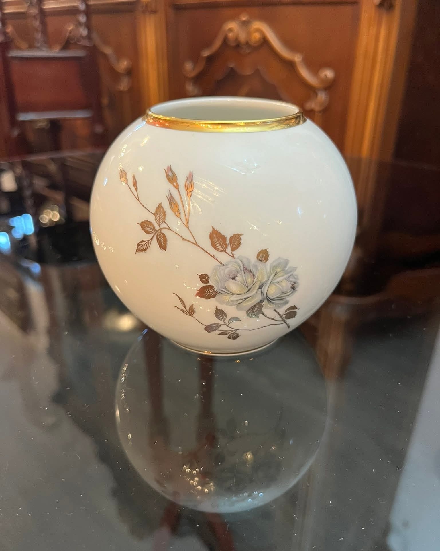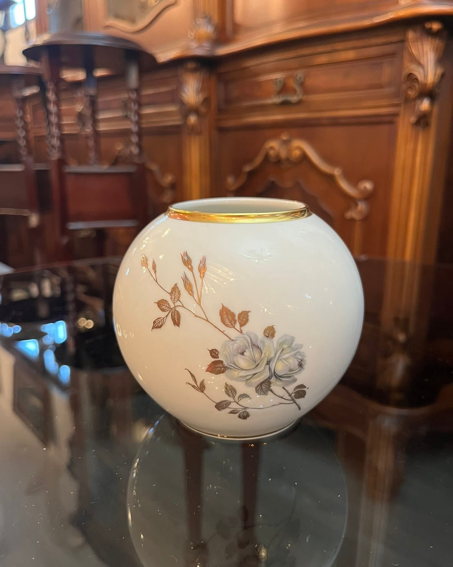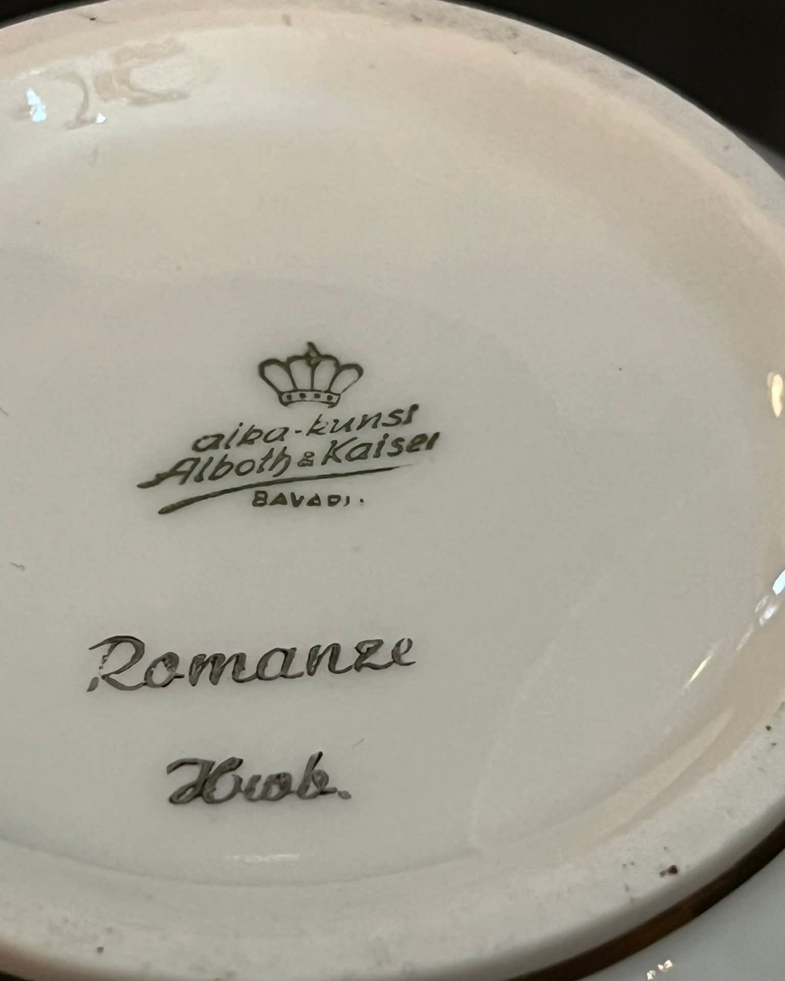 Vază elegantă din porțelan fin german, semnată Alboh & Kaiser (Bavaria), renumită pentru calitatea și rafinamentul pieselor sale. Modelul „Romantze” se remarcă