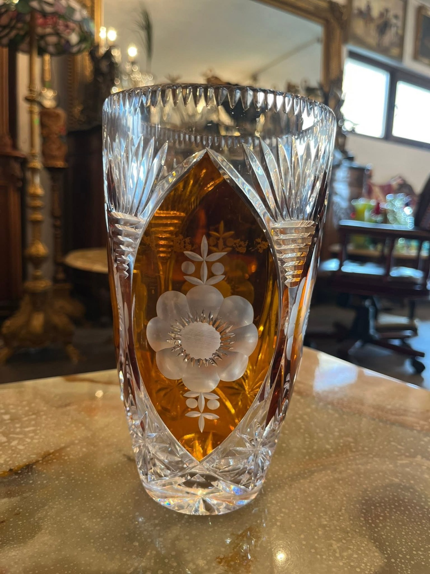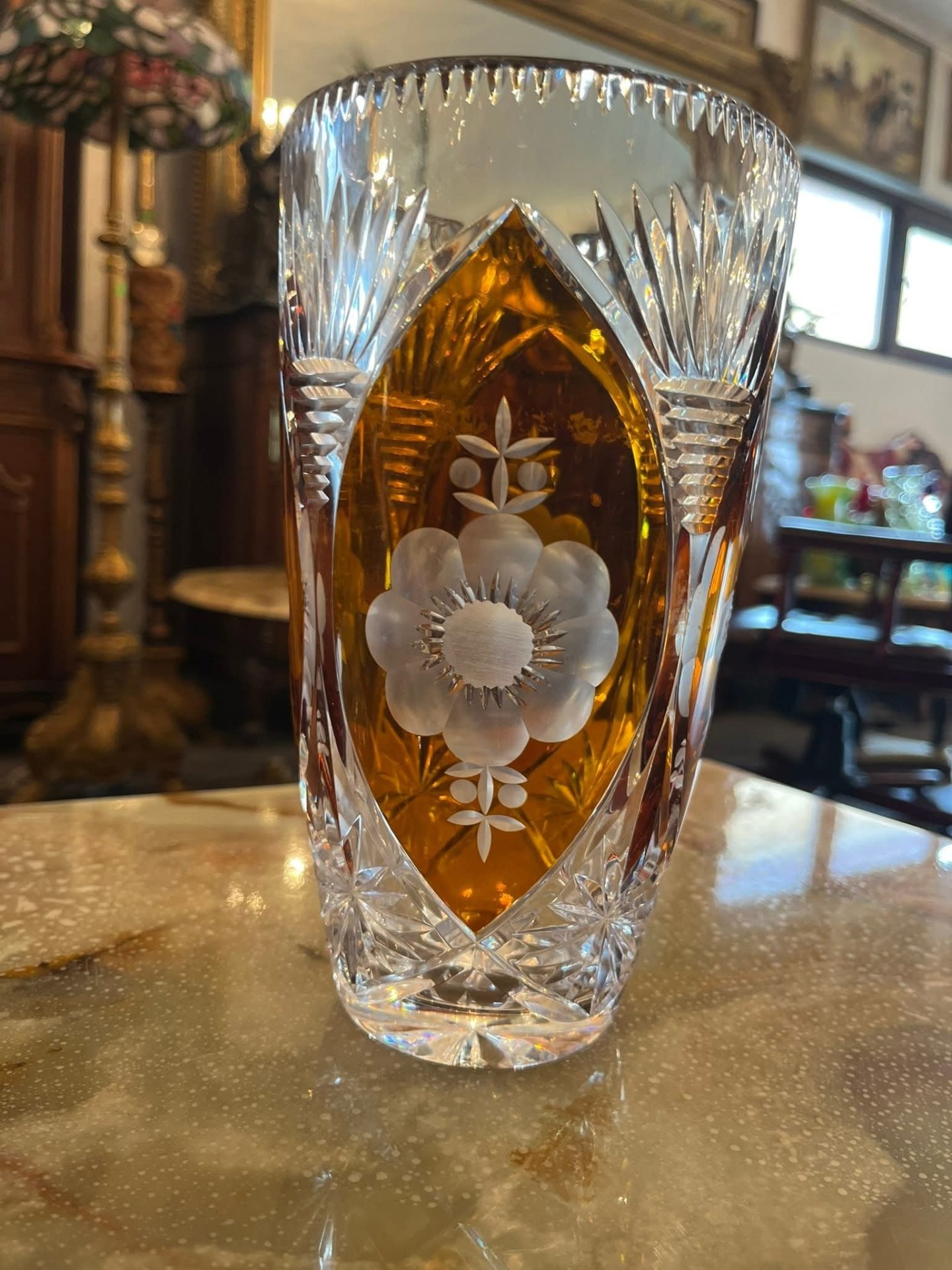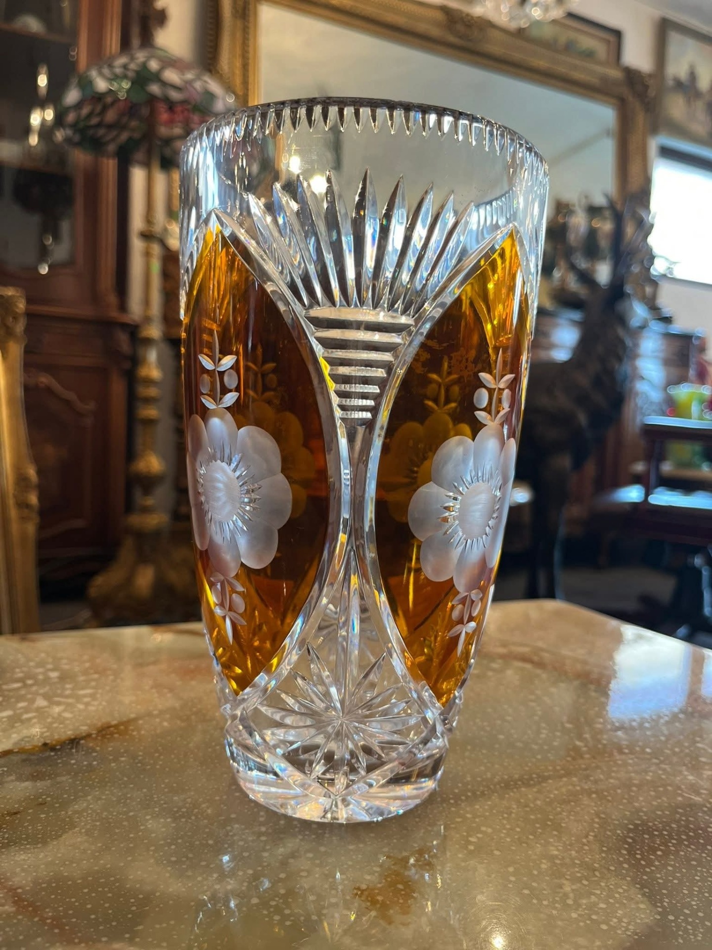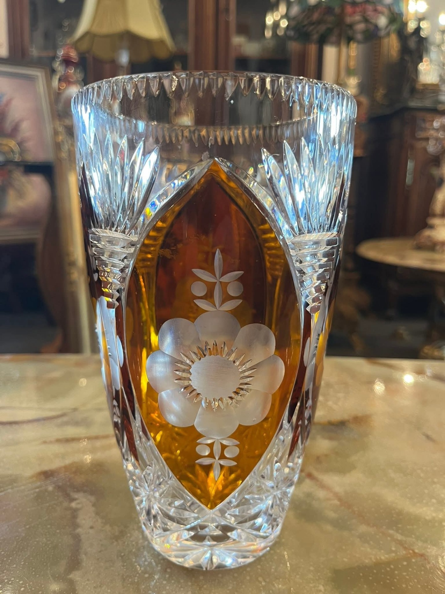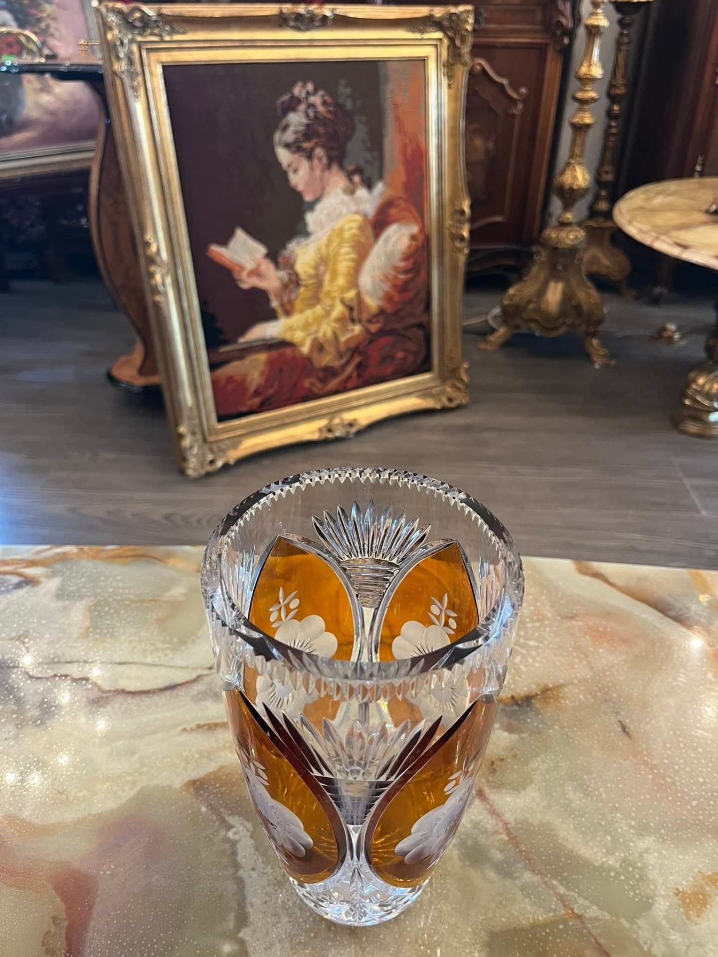 Vază elegantă realizată din cristal de calitate superioară, cu design bicolor în nuanță chihlimbar și transparent. Decorată cu motive florale gravate și tăieturi fine, executate manual, care oferă reflexii spectaculoase în lumină.