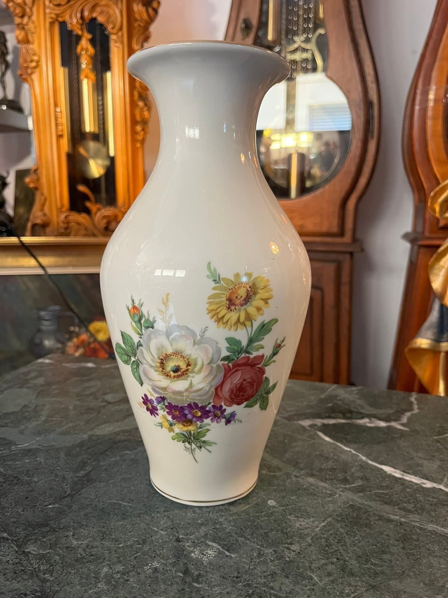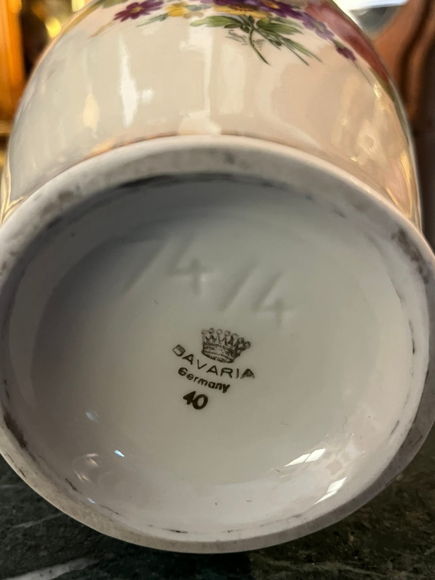 Vază elegantă din porțelan fin, marca Bavaria Germany, cu număr de serie 40. Piesa prezintă un decor superb cu flori colorate pictate fin și o bordură subțire aurită pe marginea superioară.