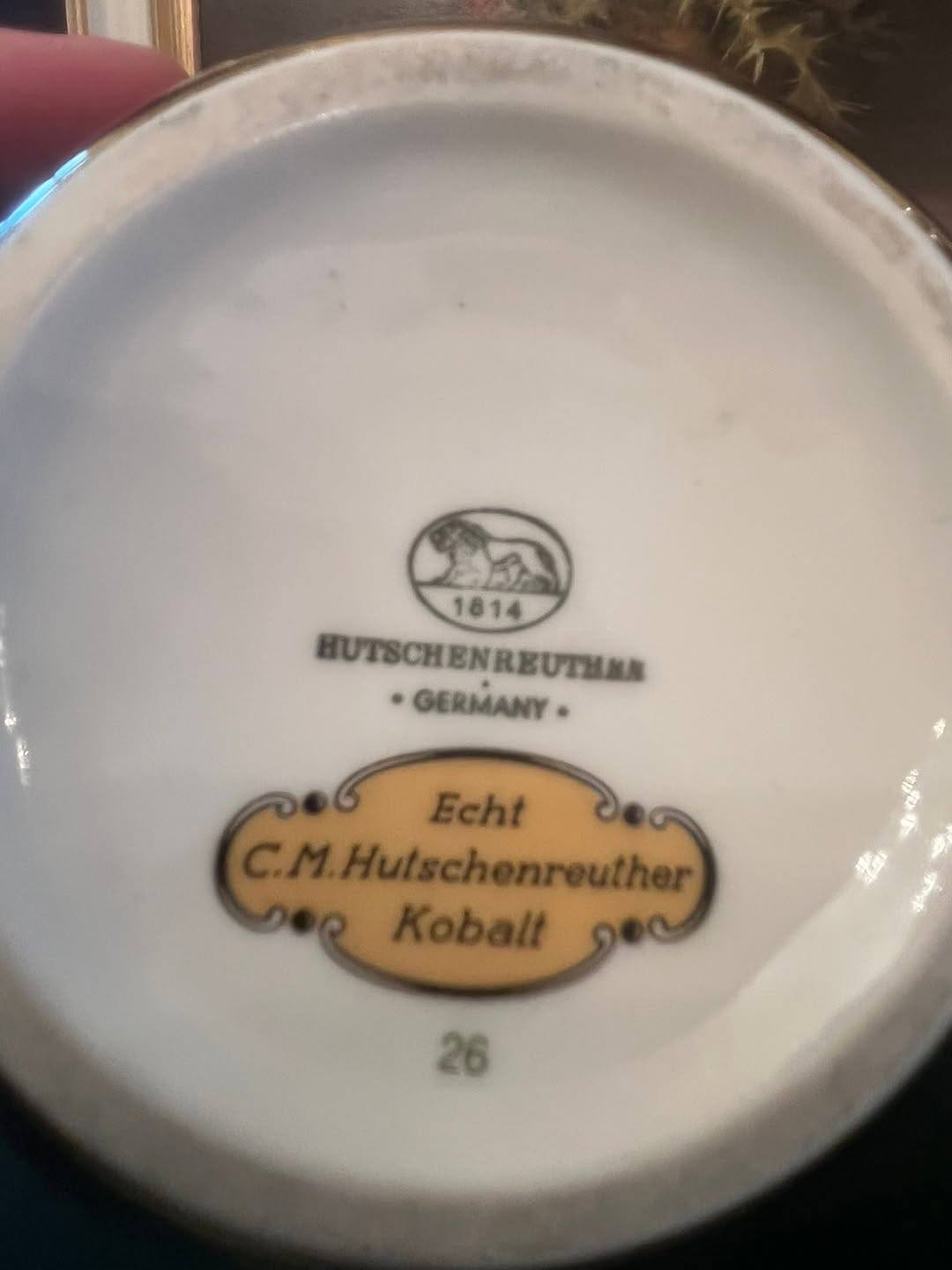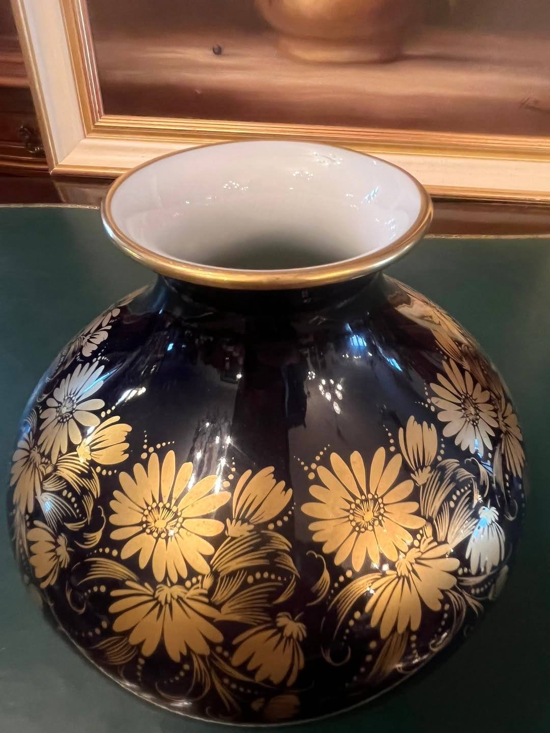 Piesa este realizată în porțelan cobalt profund, cu decorațiuni florale aurii aplicate manual, specific producției premium germane.