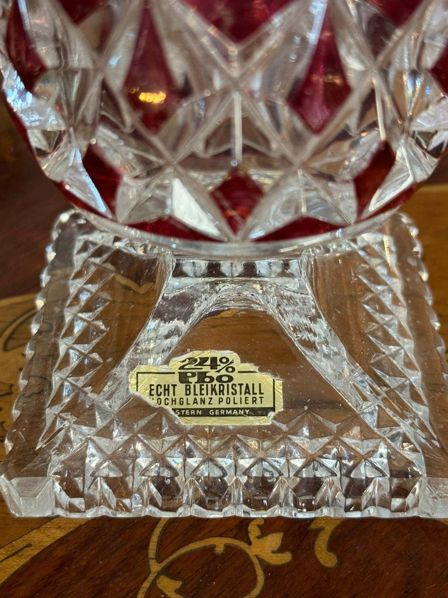 Eticheta de pe bază confirmă că este realizată din "24% PbO Echt Bleikristall". Aceasta înseamnă că obiectul conține 24% oxid de plumb, ceea ce îi conferă o strălucire superioară, o greutate specifică mai mare și un sunet clar, cristalin, la atingere.