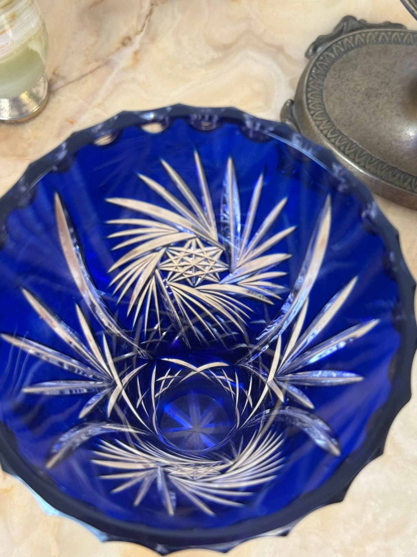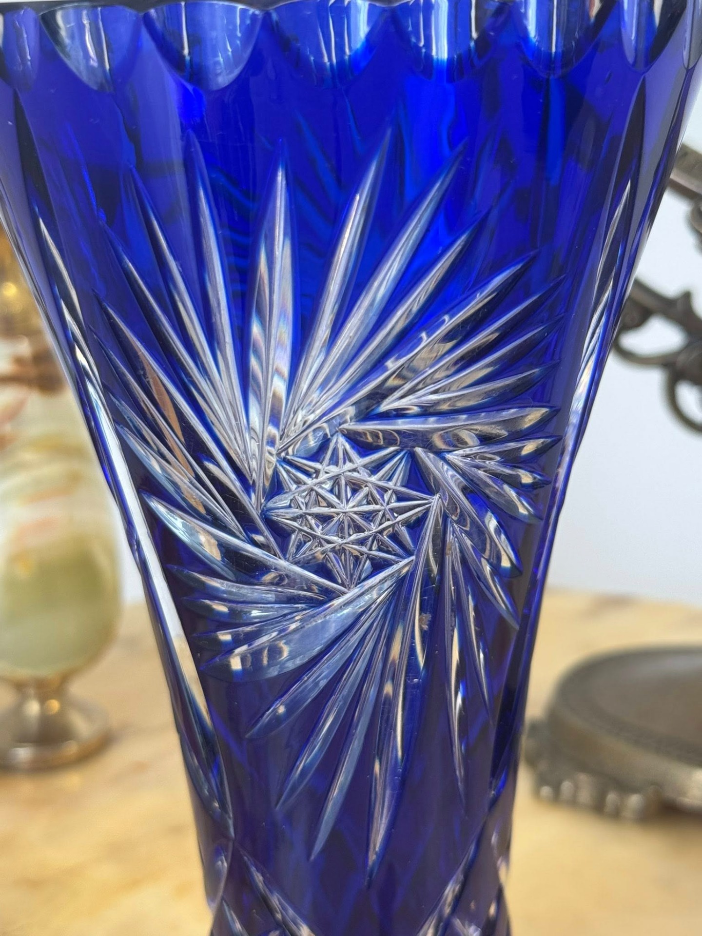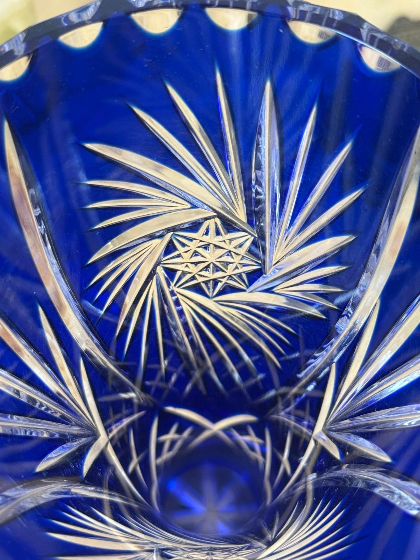 și unul albastru la exterior. Tăieturile manuale pătrund prin stratul colorat, dezvăluind cristalul transparent de dedesubt. (cca 1960)