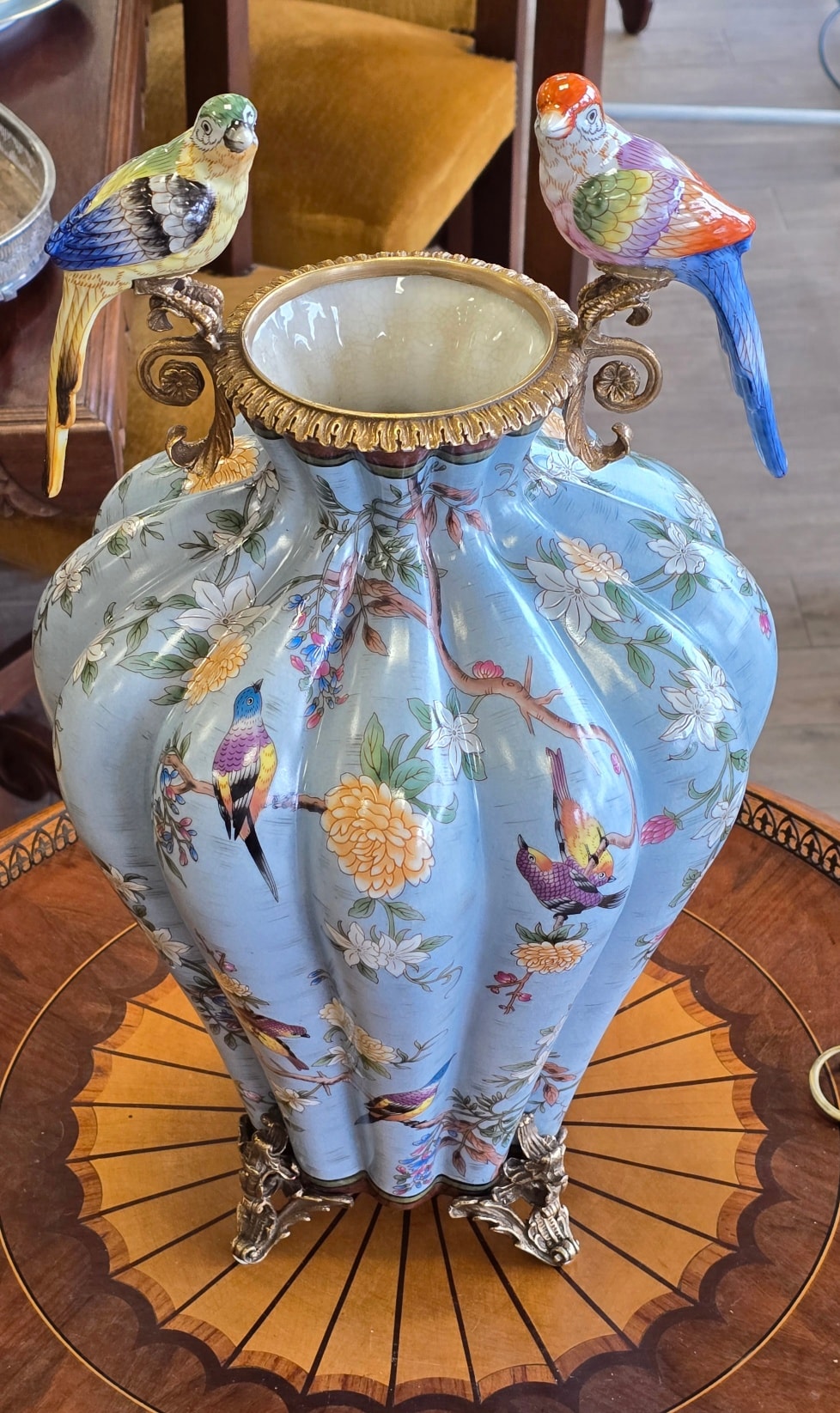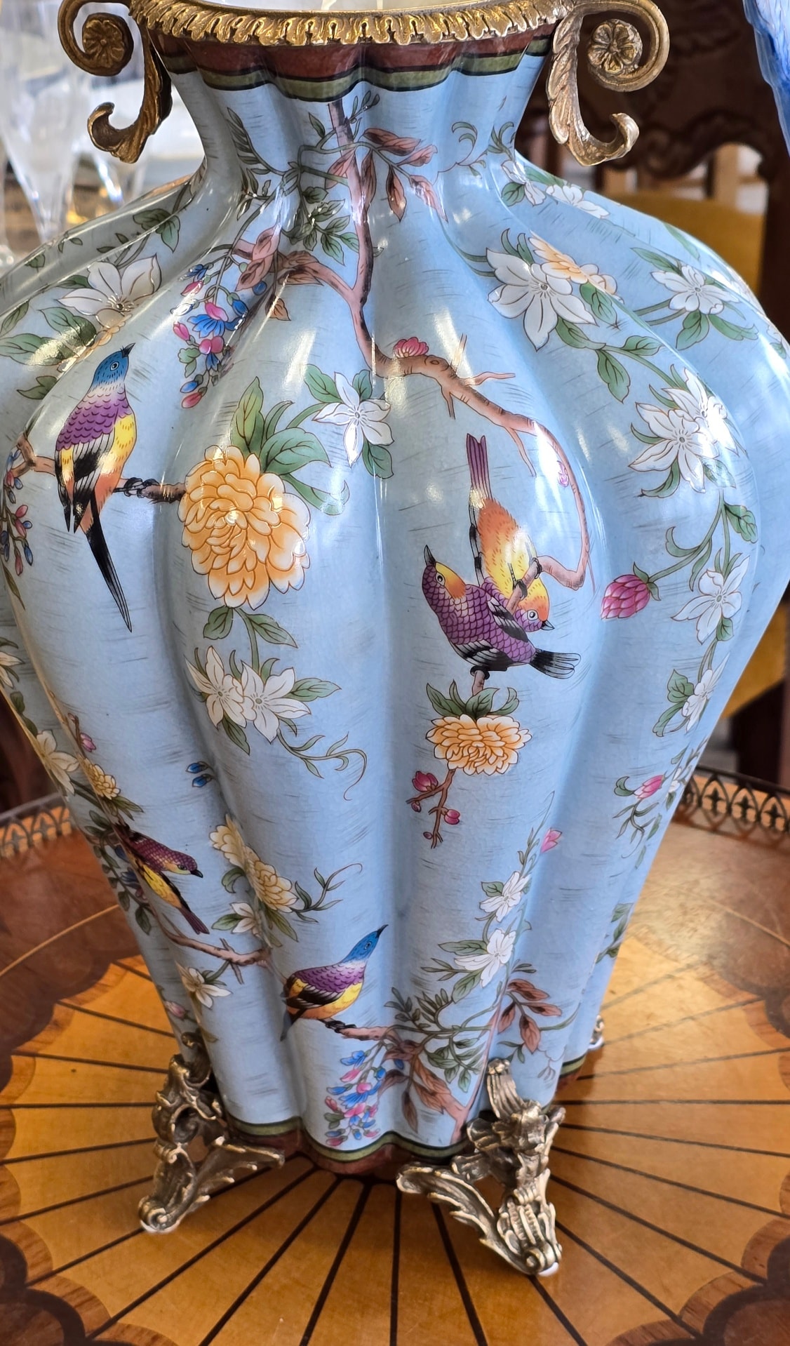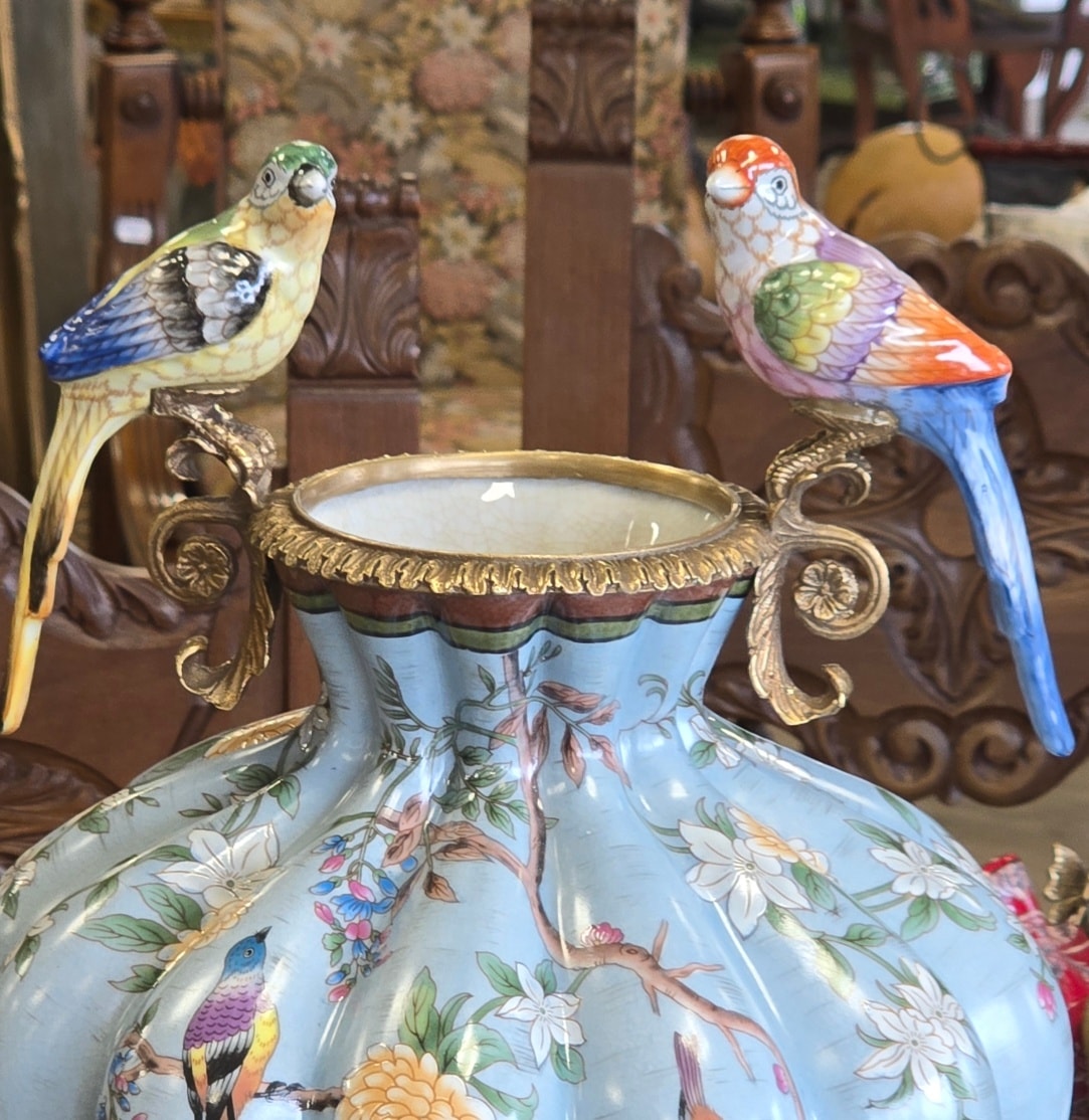 Vază spectaculoasă din porțelan, în montură din bronz, decorată cu flori și păsărele în culori vibrante.