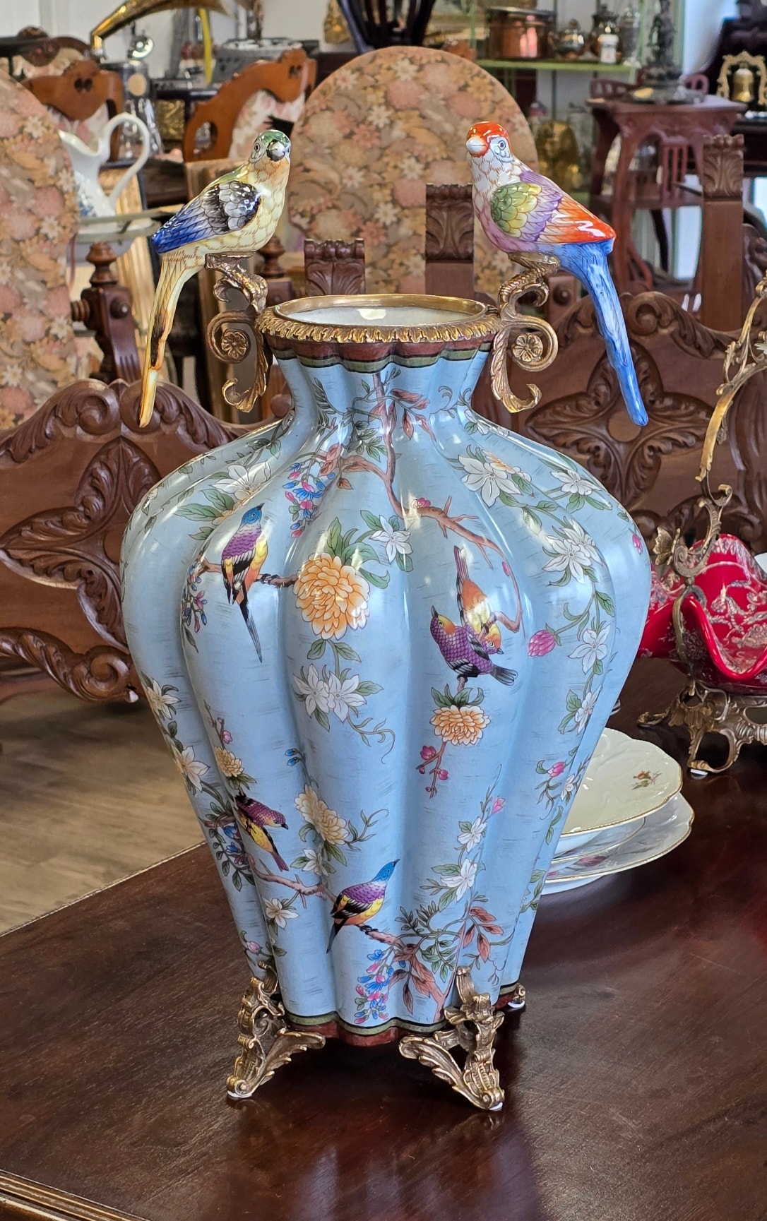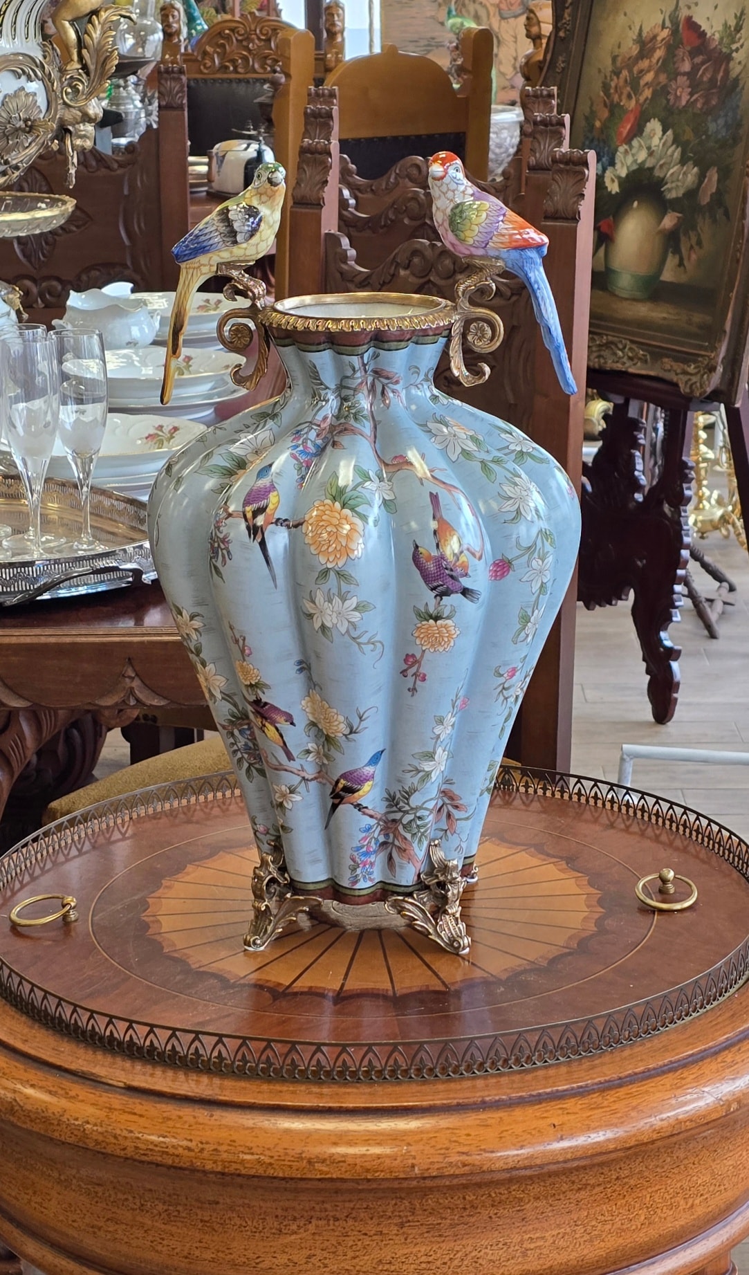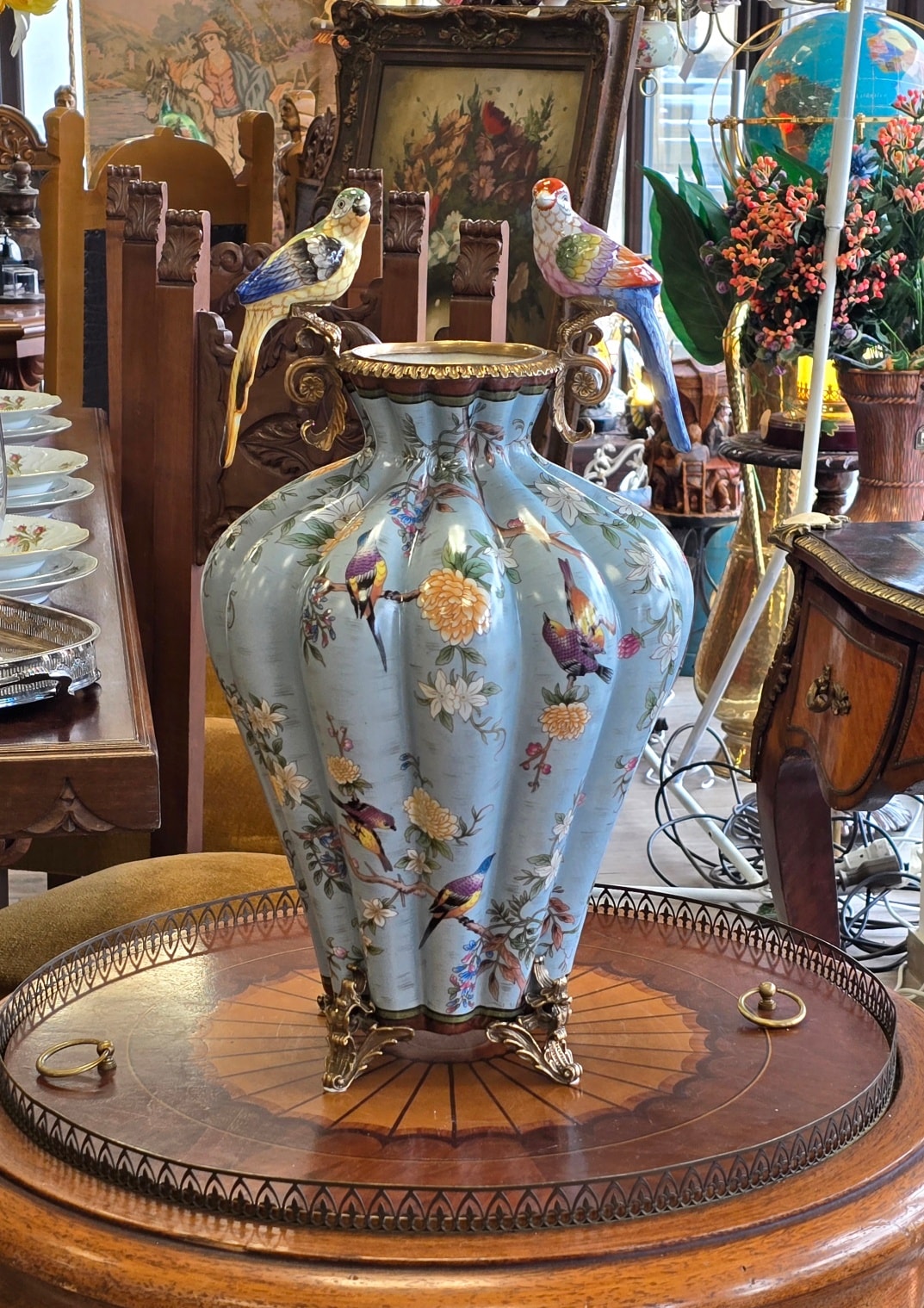 Vază spectaculoasă din porțelan, în montură din bronz, decorată cu flori și păsărele în culori vibrante.