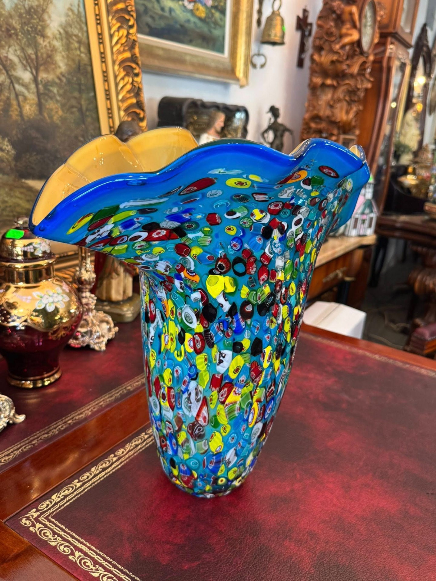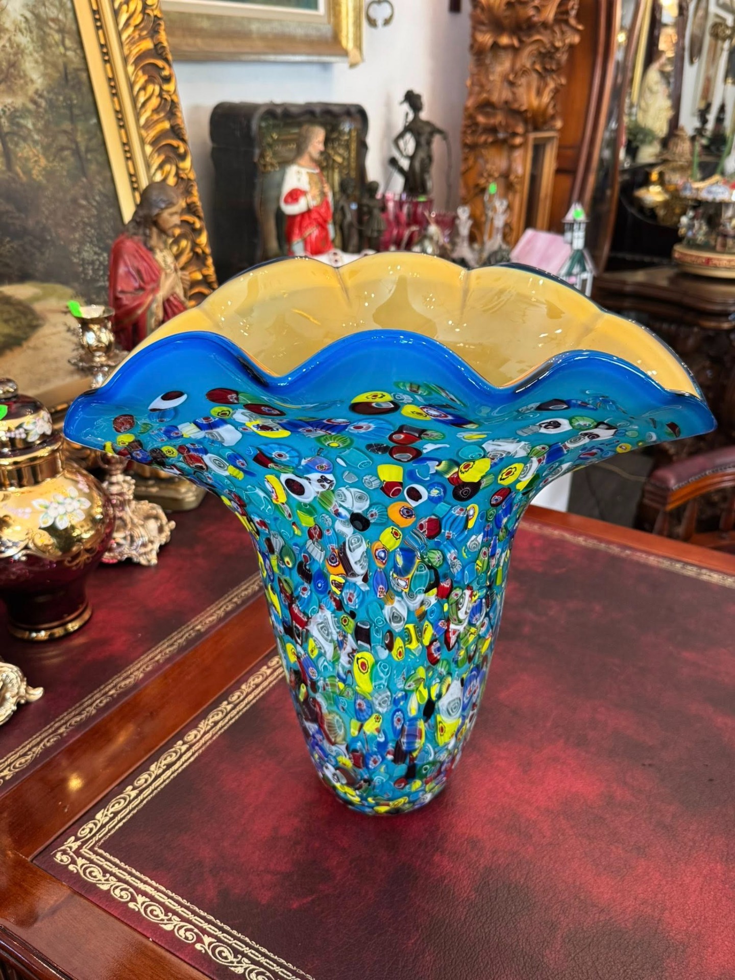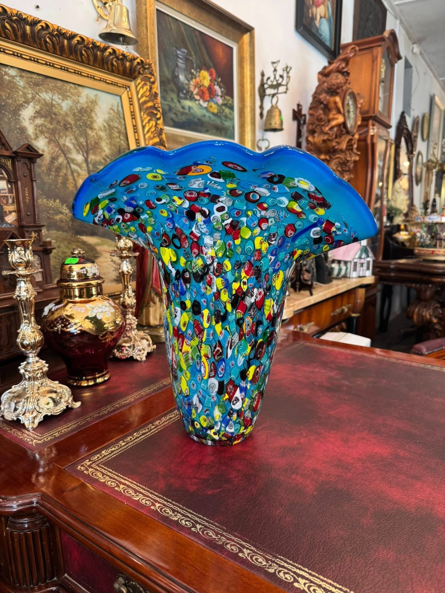 Vază spectaculoasă din stilclă realizată în stilul Murano. Având o formă de trompetă evazată, cu o deschidere largă, ondulată (margine de tip „scalloped”), care îi conferă un aspect dinamic și organic.