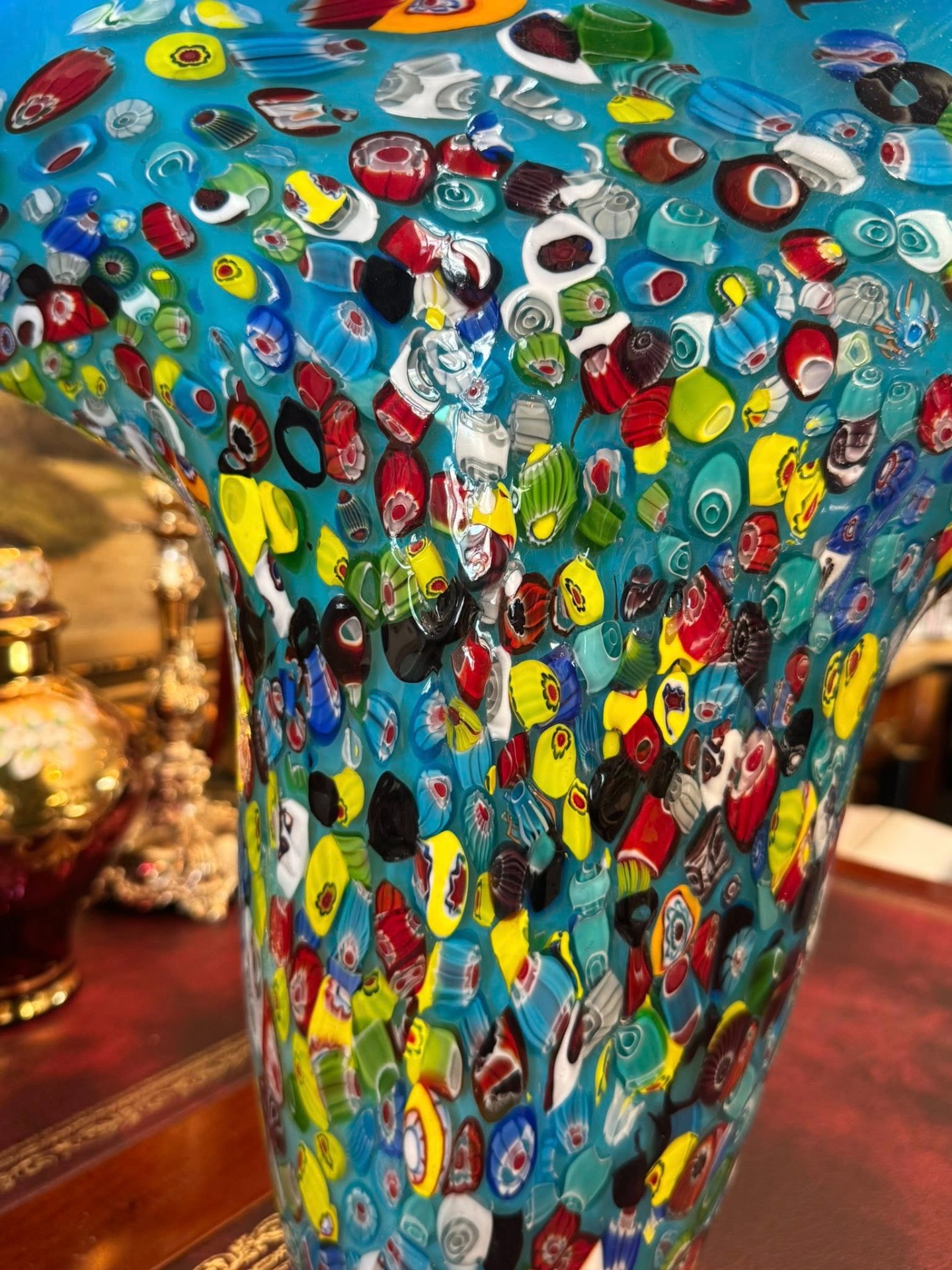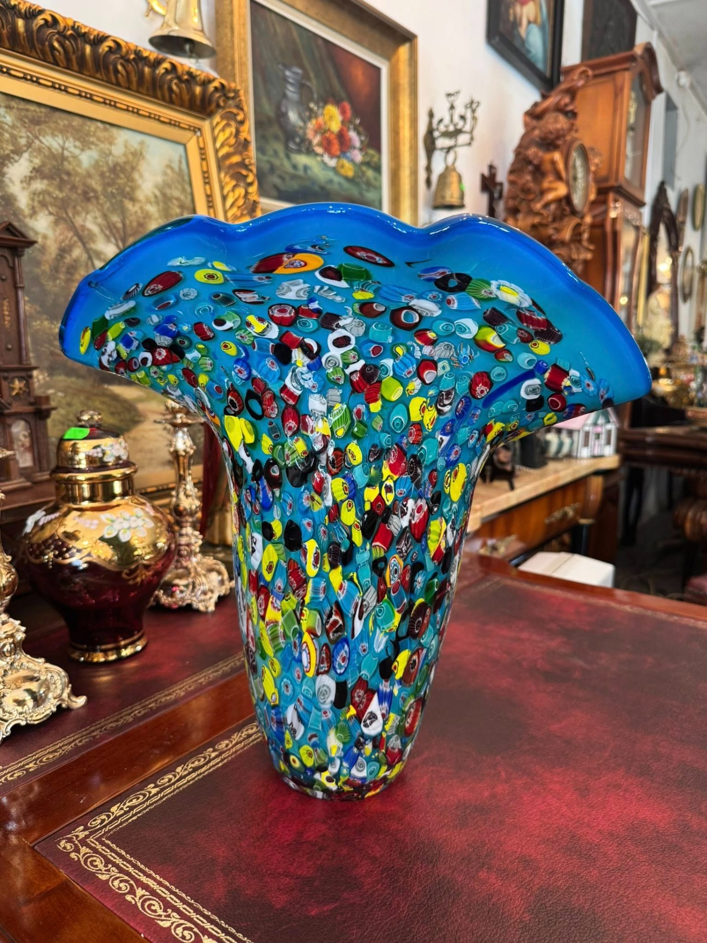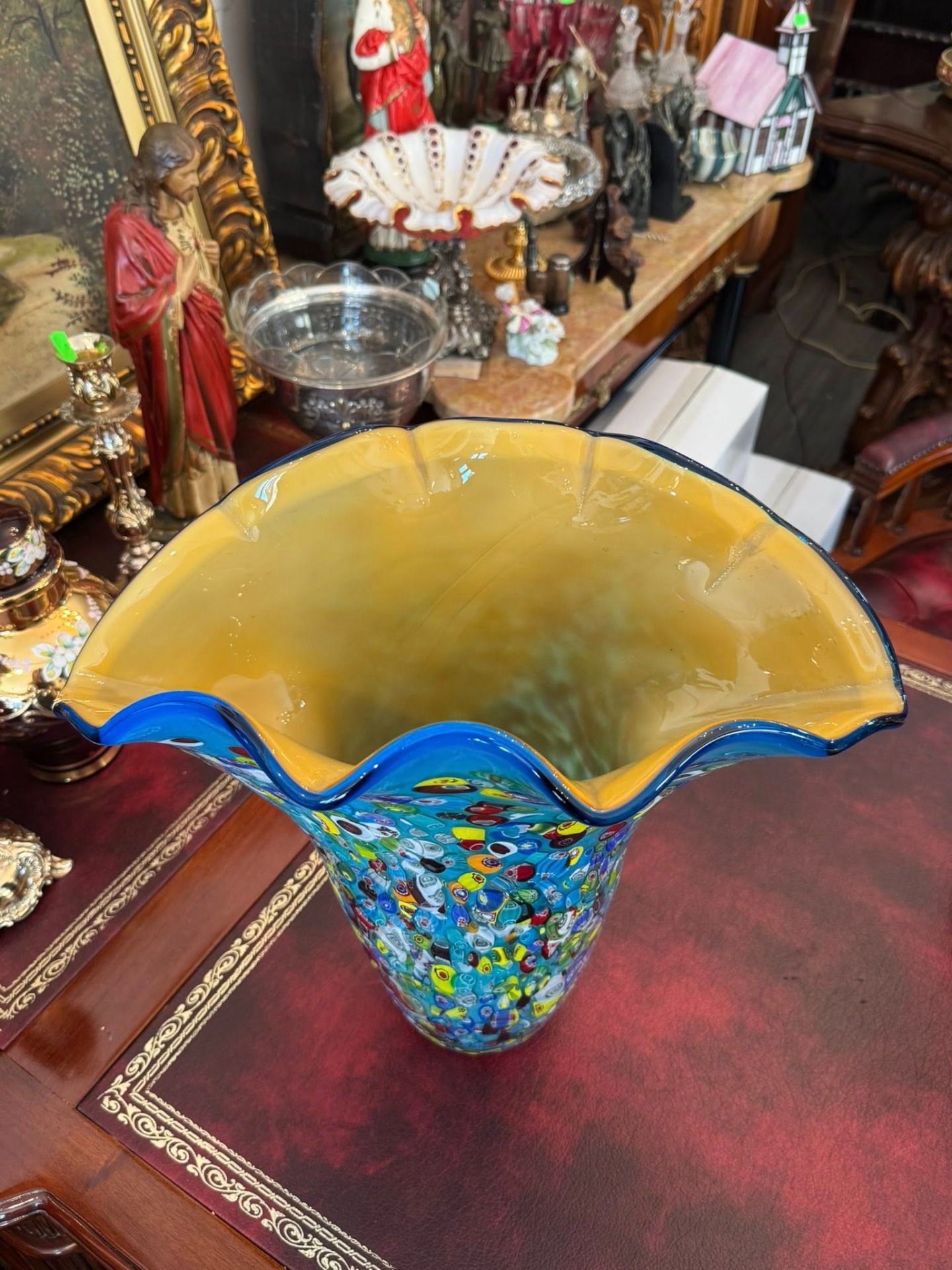 Vază spectaculoasă din stilclă realizată în stilul Murano. Având o formă de trompetă evazată, cu o deschidere largă, ondulată (margine de tip „scalloped”), care îi conferă un aspect dinamic și organic.