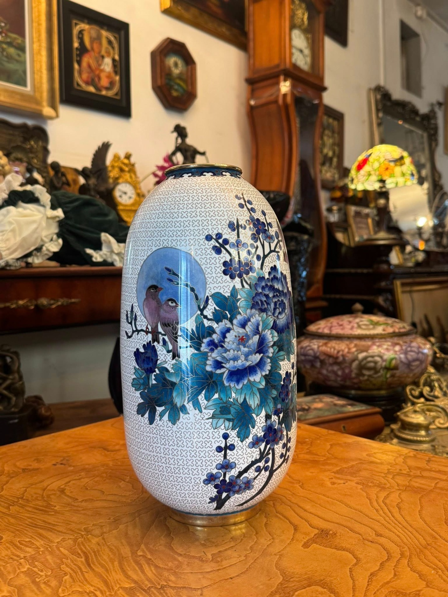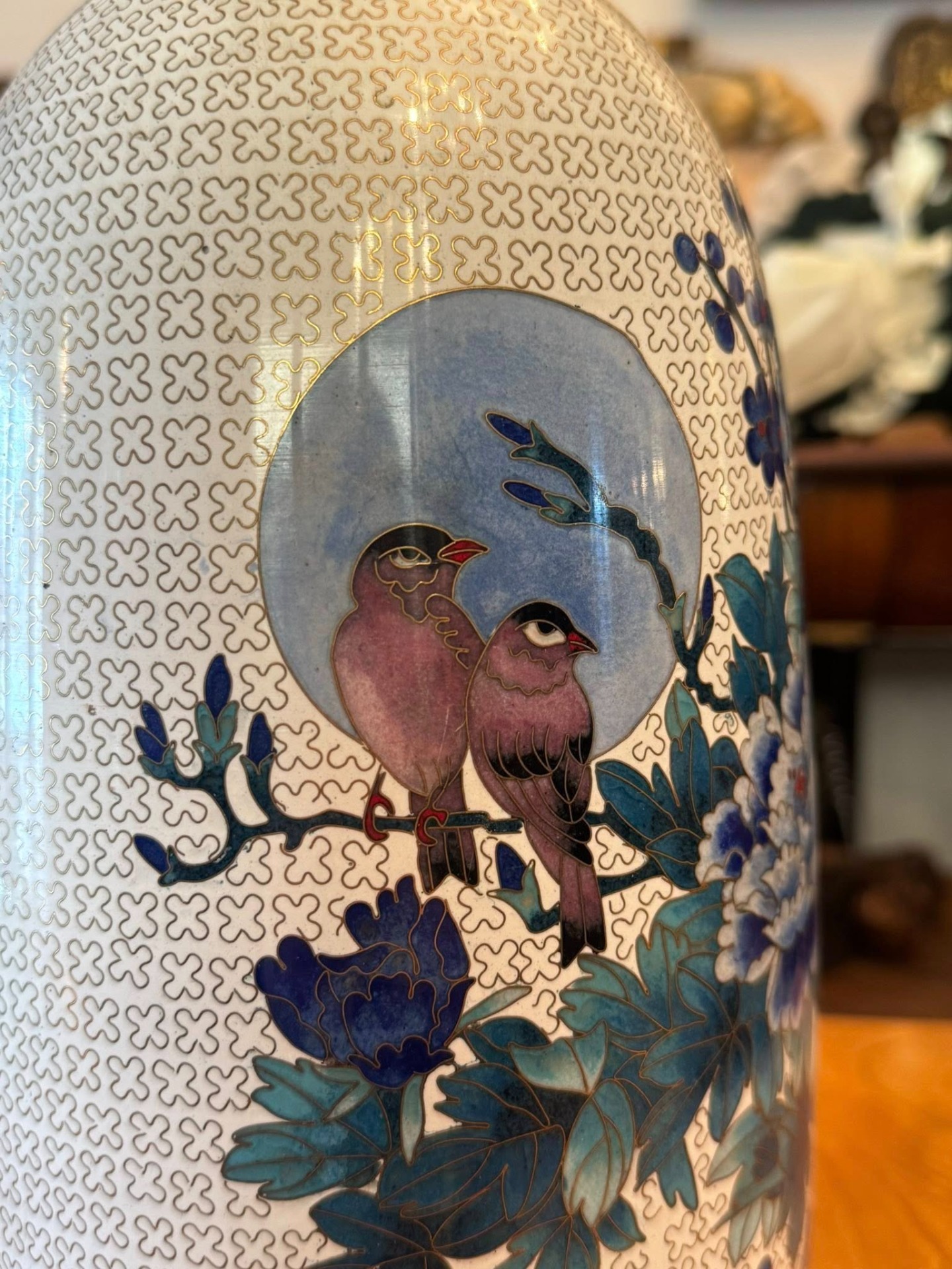 Vază superbă realizată în tehnica Cloisonné (email alveolat pe suport metalic), un stil decorativ foarte apreciat în arta asiatică, în special în China și