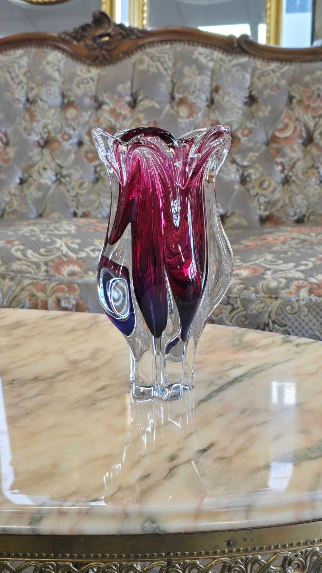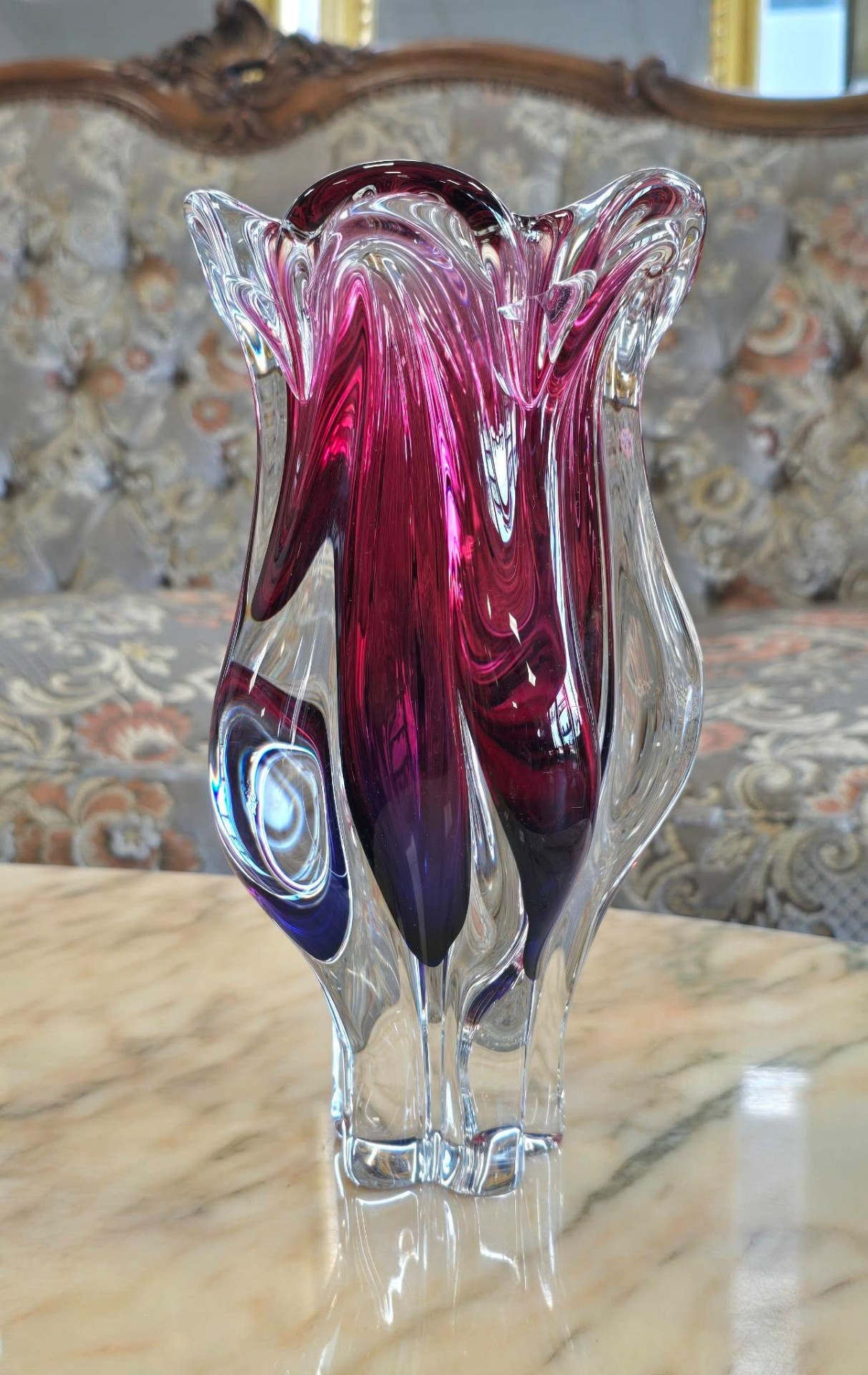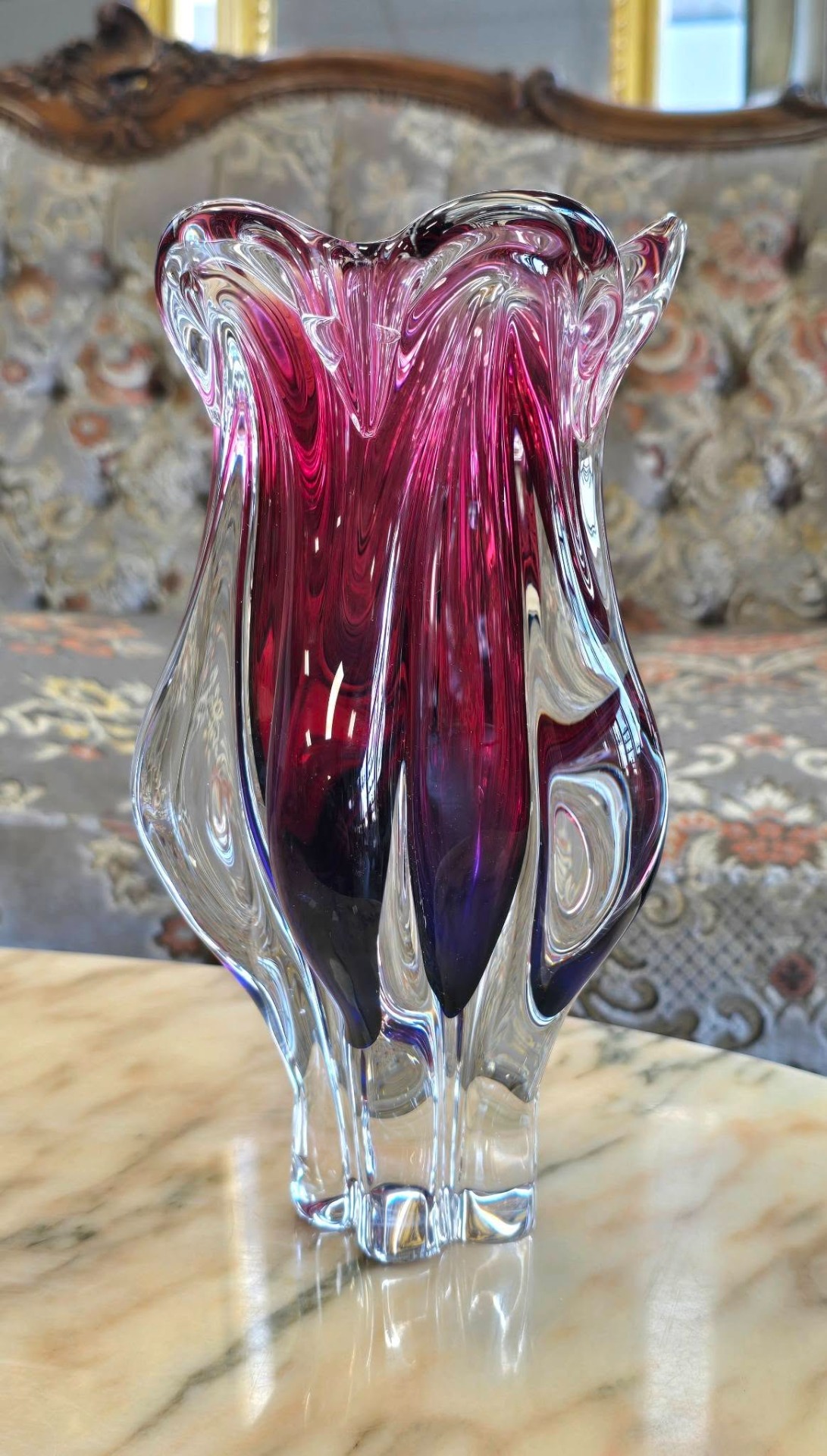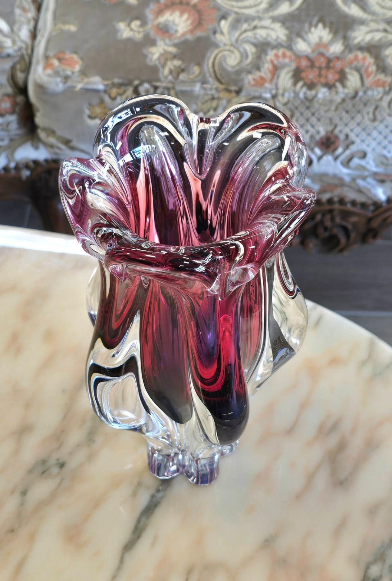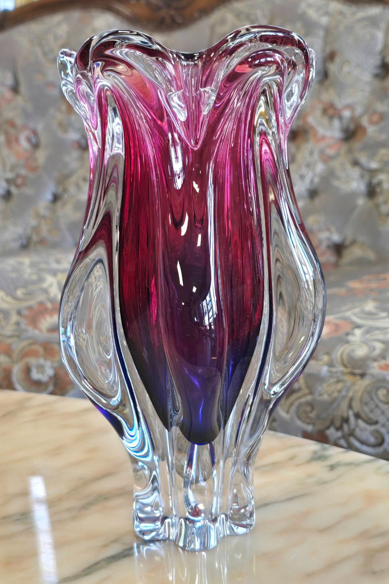 Vază vintage spectaculoasă, de colecție, din cristal ametist-granat, cu design organic, sculptural, de formă fluidă, lobată, care amintește de deschiderea unei