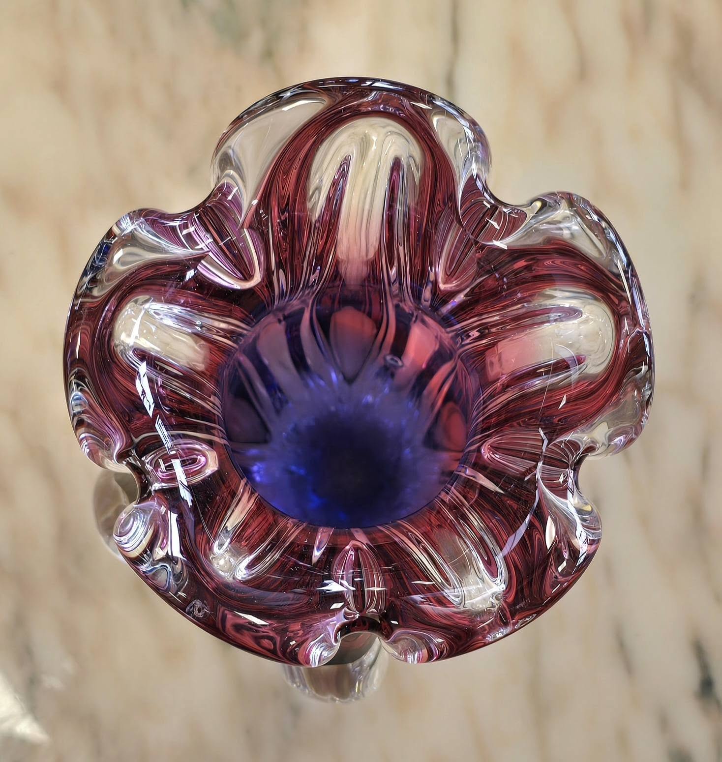 flori, realizată prin tehnica "Sommerso" (culoare prinsă în interiorul unui strat gros de sticlă transparentă), care oferă un joc superb de nuanțe, pornind de la un violet intens (ametist) la bază și urcând în degradeuri de rubiniu (granat) spre transparent în partea superioară.