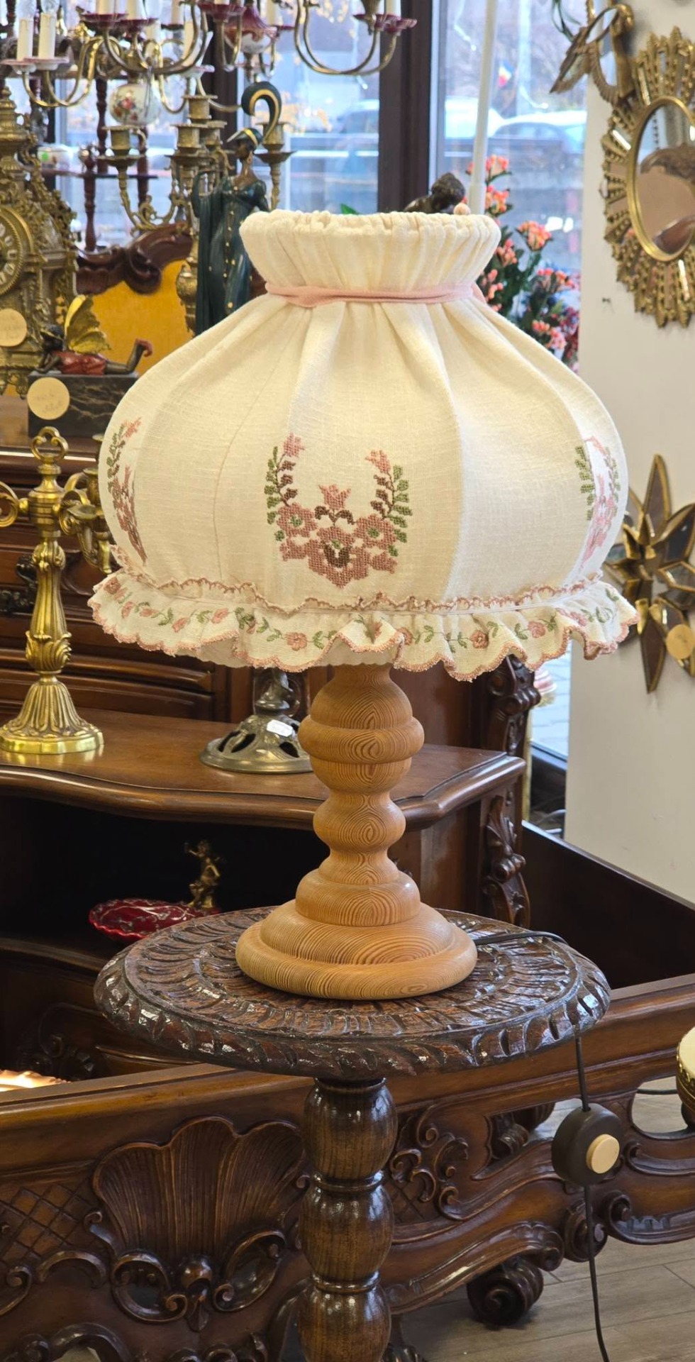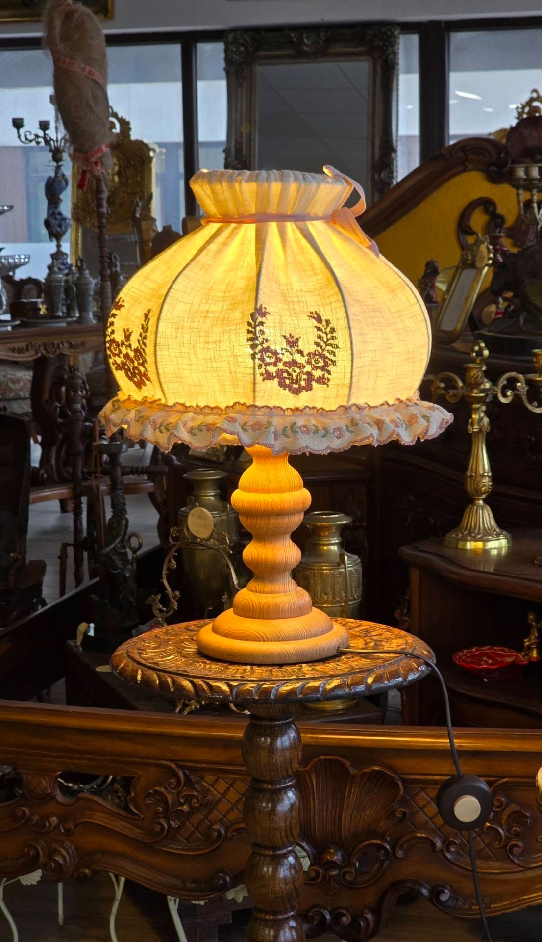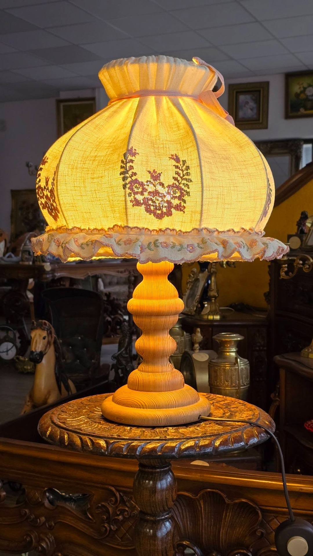 Veioză vintage rustică, în stil romantic ("shabby chic"), cu picior din lemn și abajur brodat în motiv floral, lumina filtrată prin pânză fiind extrem de caldă