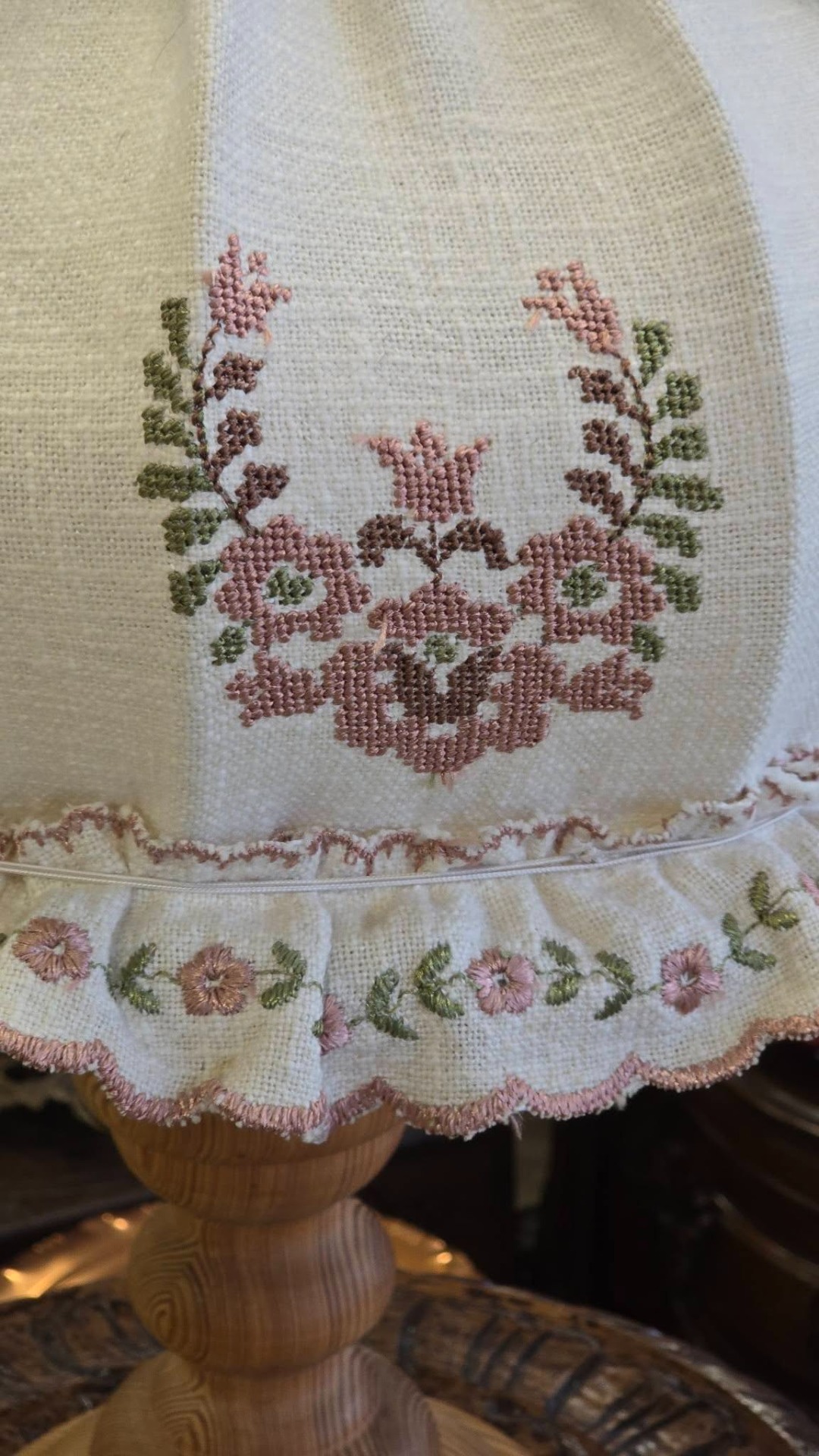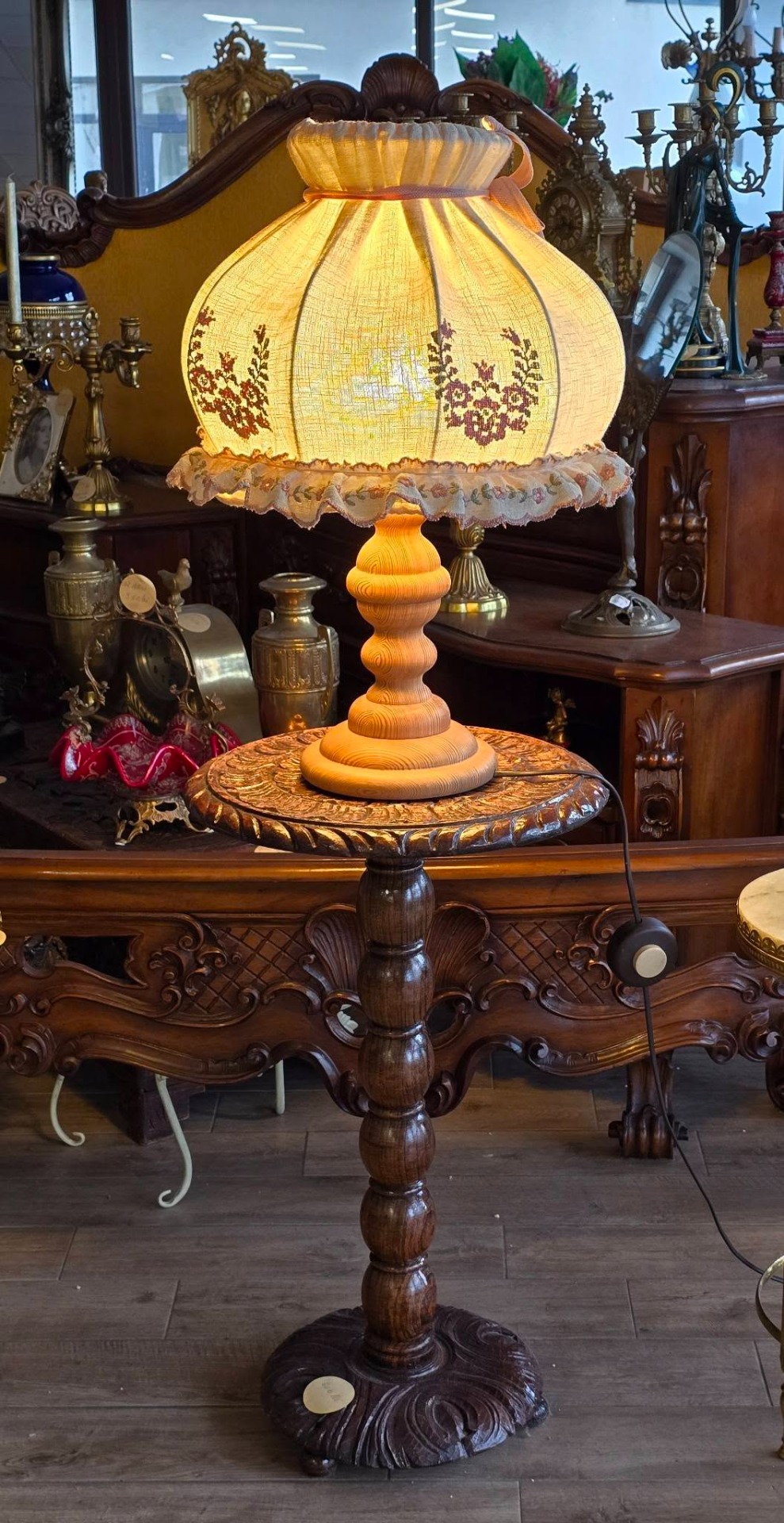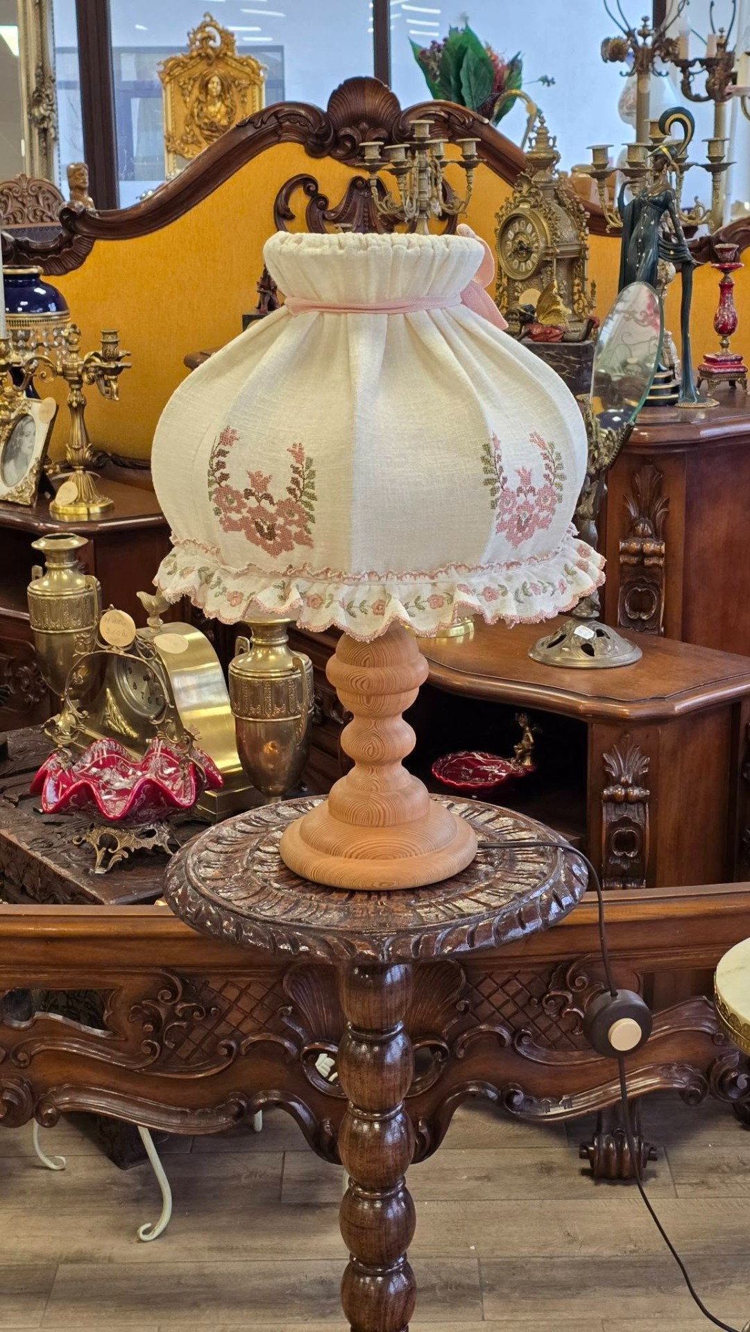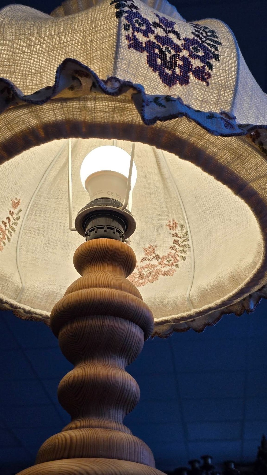 Veioză vintage rustică, în stil romantic ("shabby chic"), cu picior din lemn și abajur brodat în motiv floral, lumina filtrată prin pânză fiind extrem de caldă