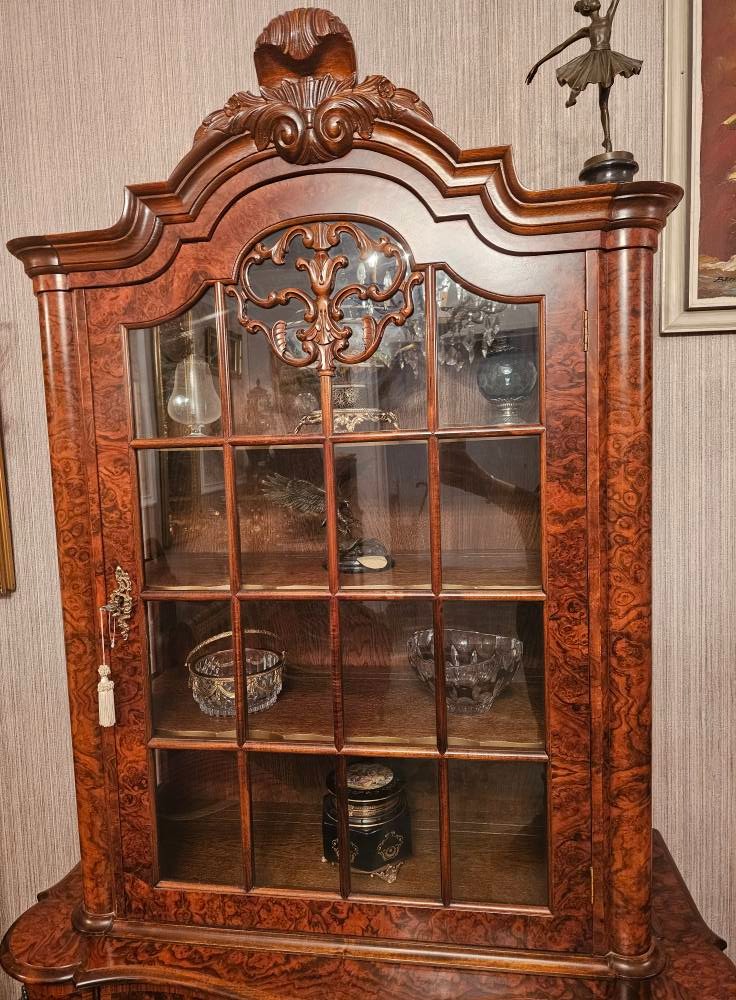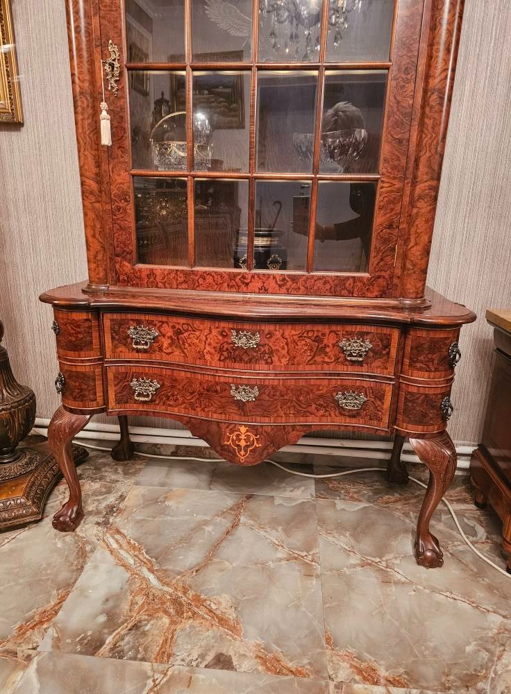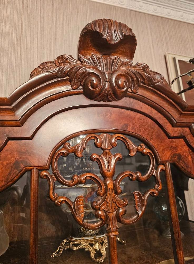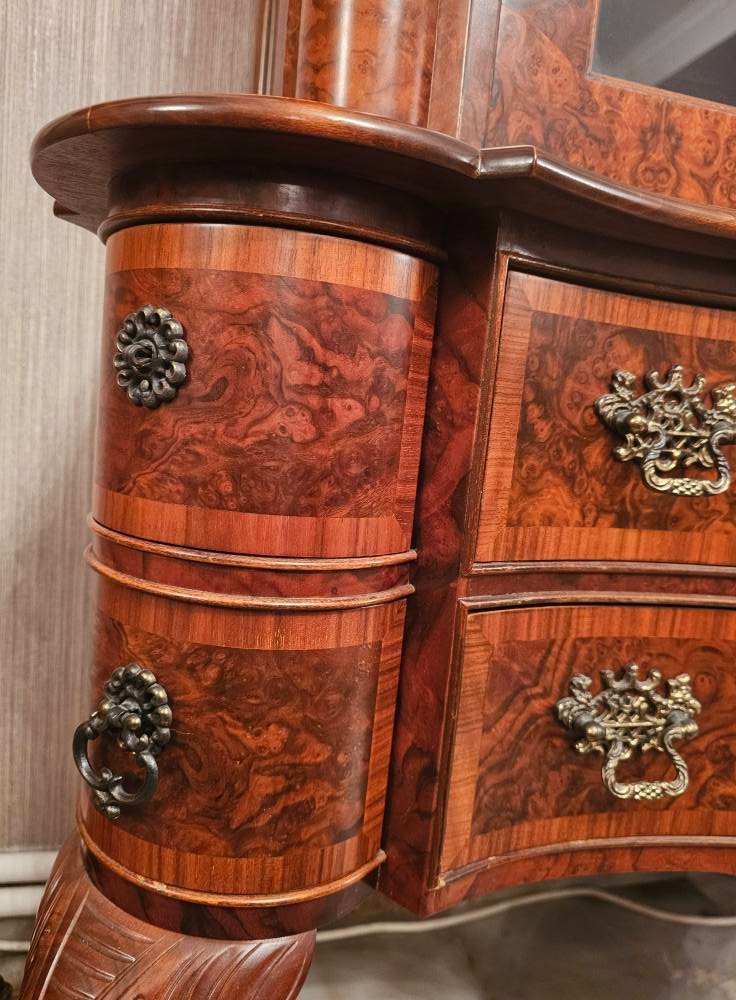Piesă de mobilier rafinată, lucrată manual, din lemn masiv cu furnir bogat în textură și detalii decorative fine. Vitrina are un design impunător, cu picioare sculptate în stil cabriolet, mânere metalice ornamentale și intarsii elegante.