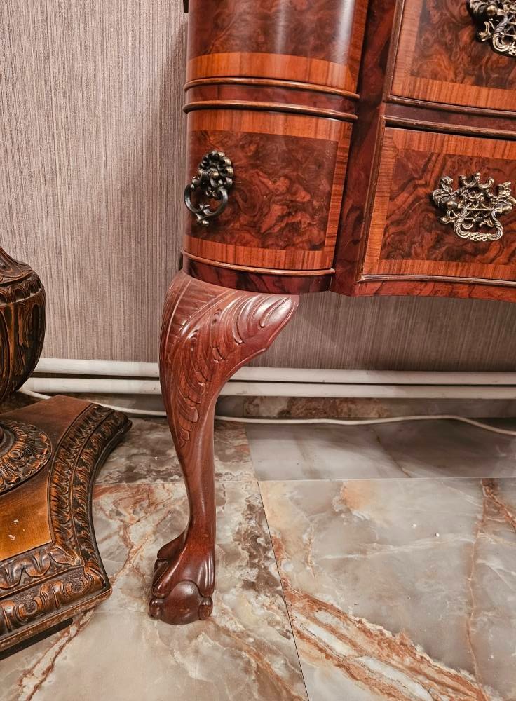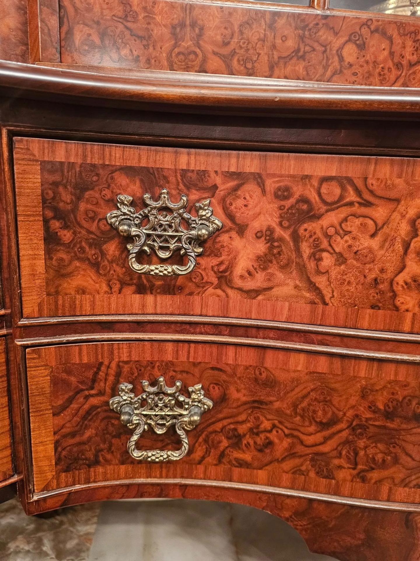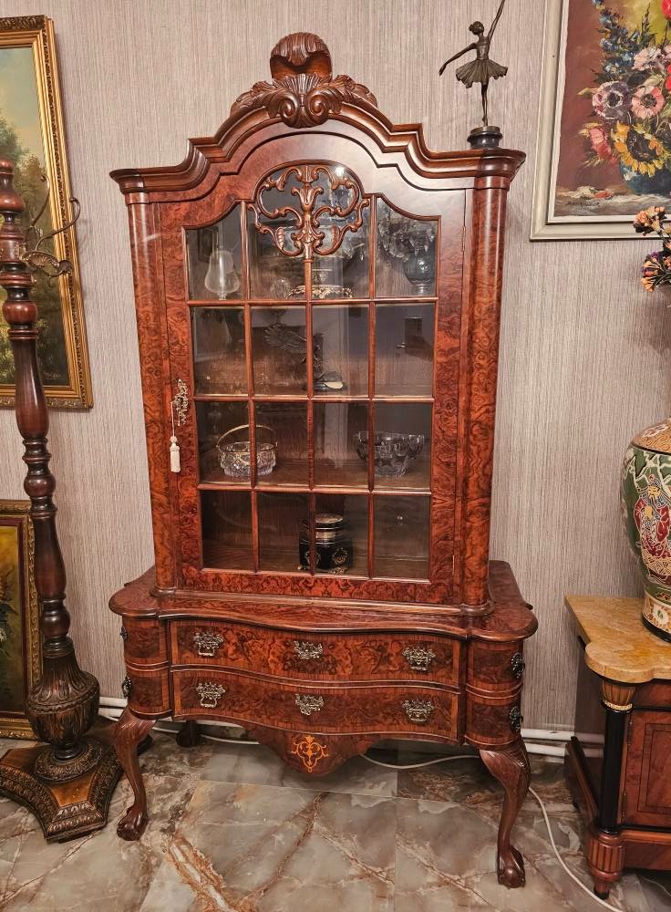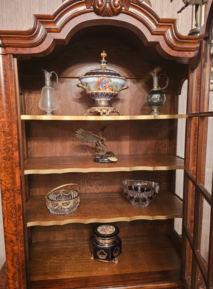 Piesă de mobilier rafinată, lucrată manual, din lemn masiv cu furnir bogat în textură și detalii decorative fine. Vitrina are un design impunător, cu picioare sculptate în stil cabriolet, mânere metalice ornamentale și intarsii elegante.
