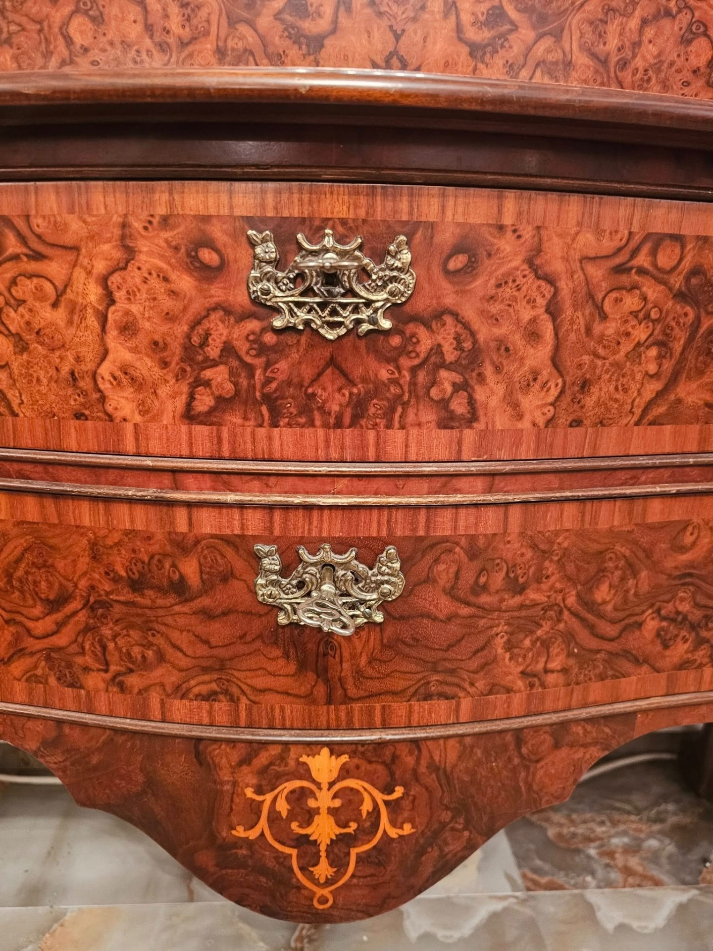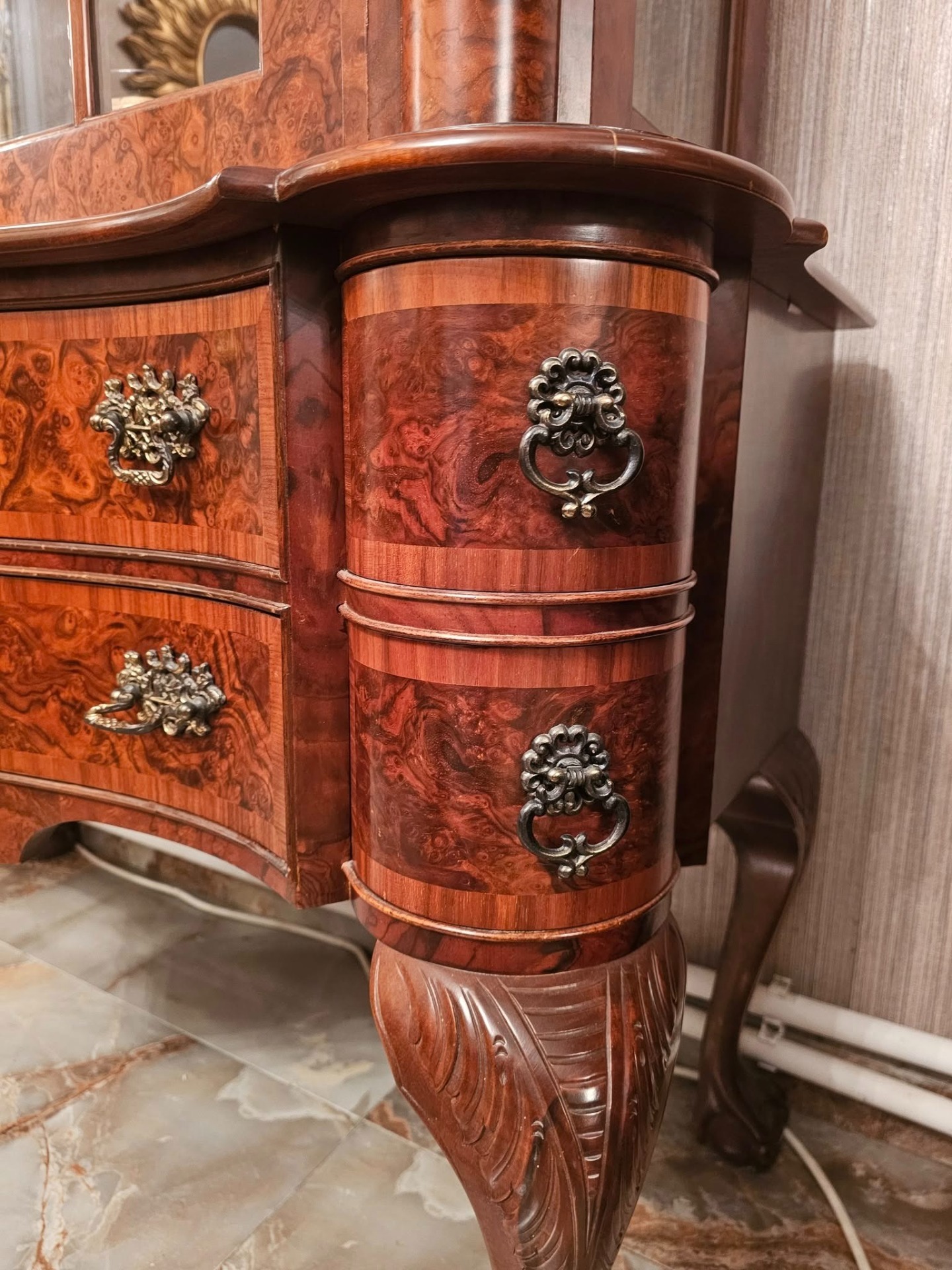 Partea inferioară include sertare spațioase și laterale rotunjite, decorate cu mânere metalice vintage. Lemnul are un luciu cald, cu un finisaj atent păstrat, ce evidențiază frumusețea naturală a fibrei.